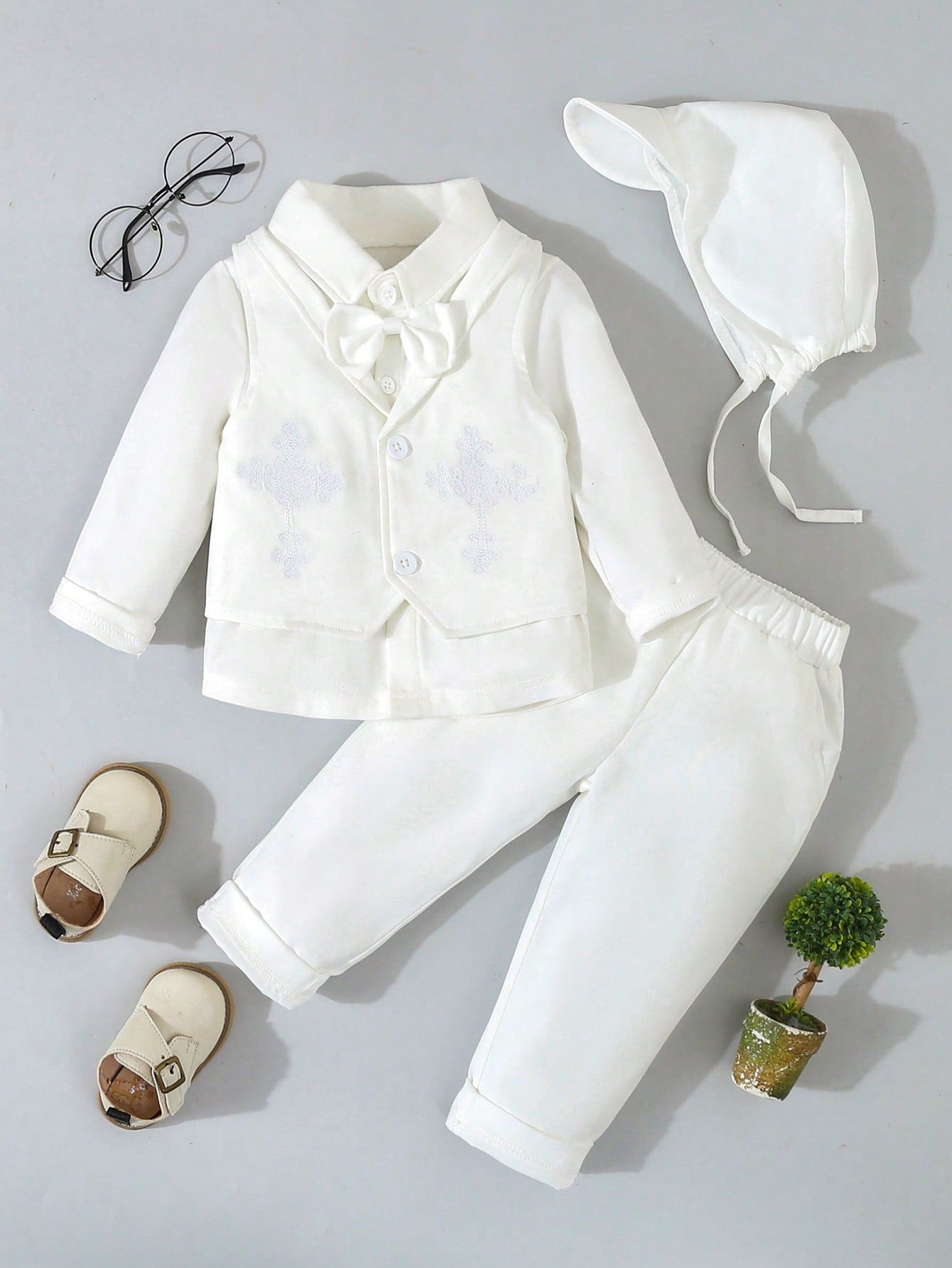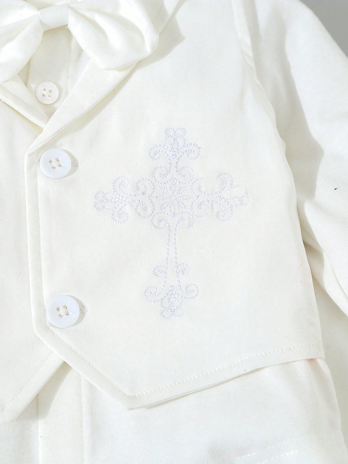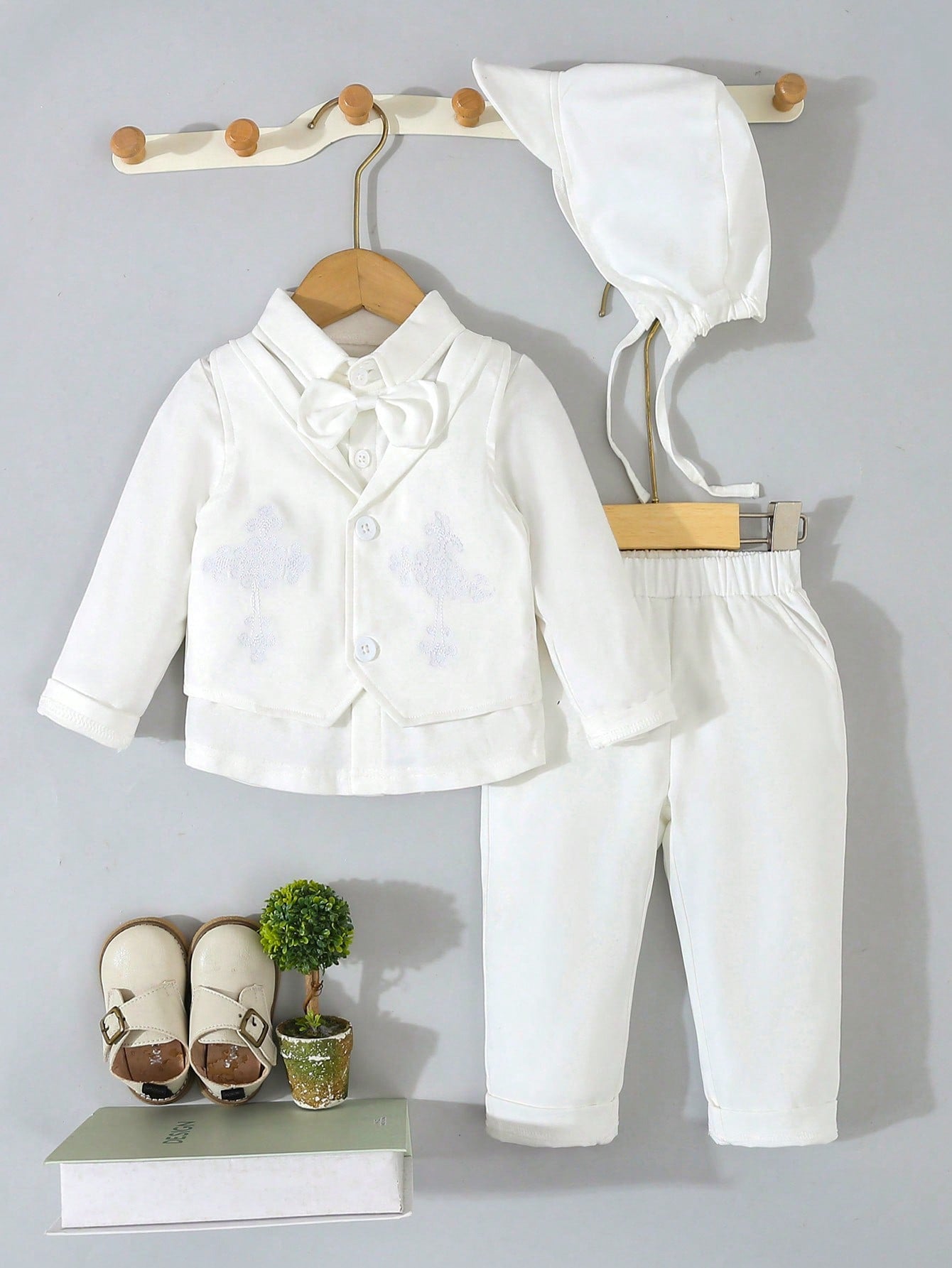 4pcs Christening Outfit Set For Baby Boys - Includes White Long Sleeve Shirt With Bow Tie