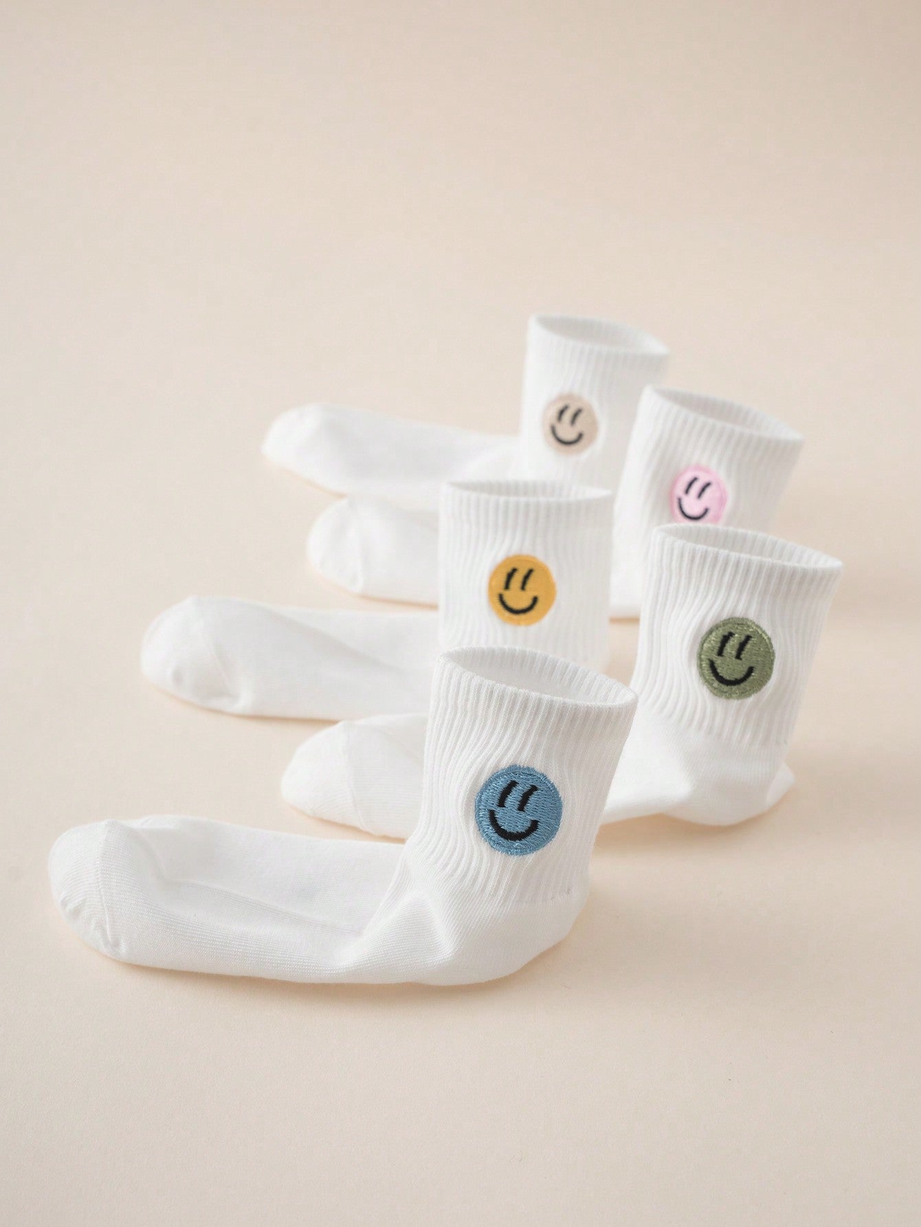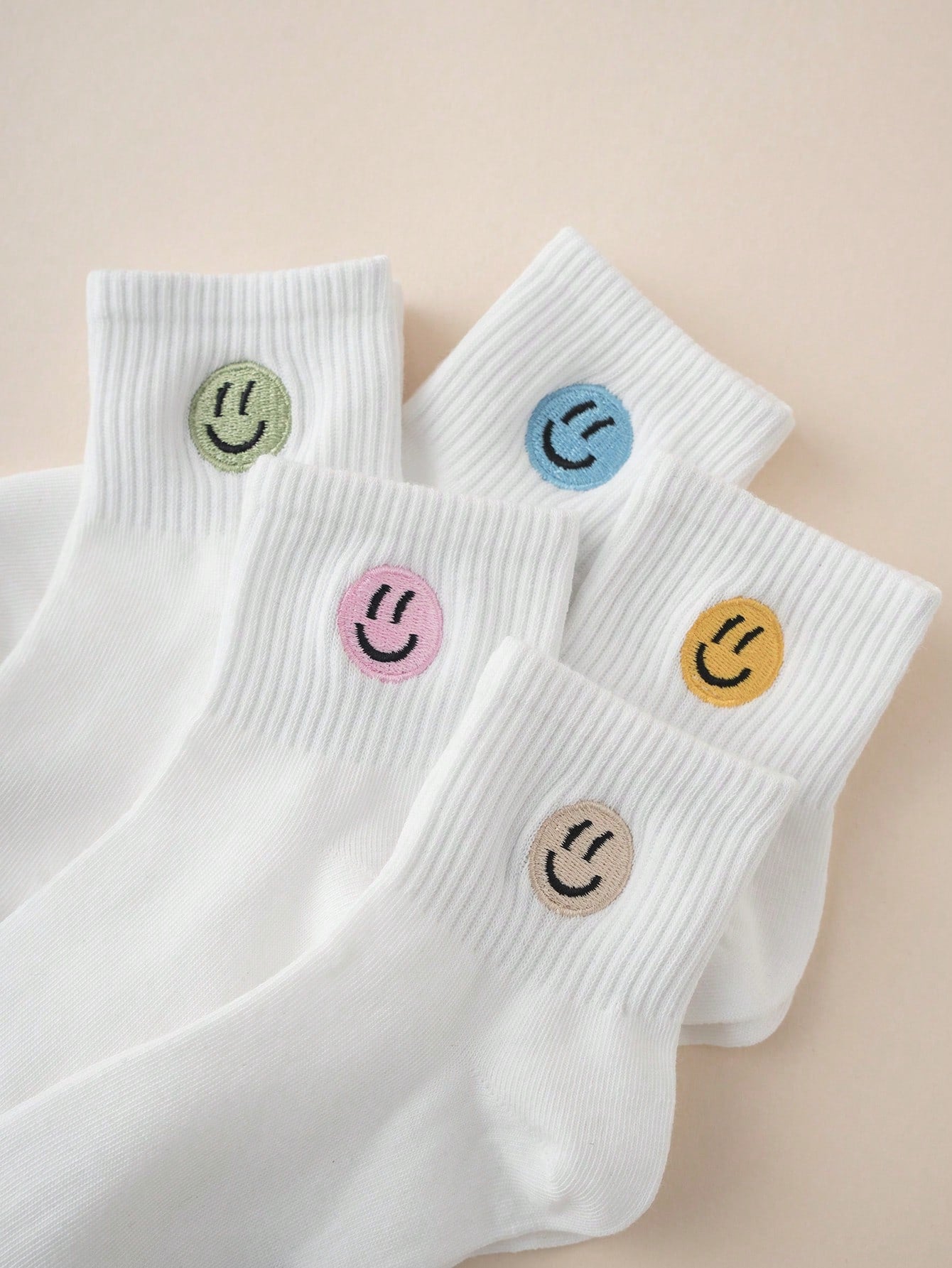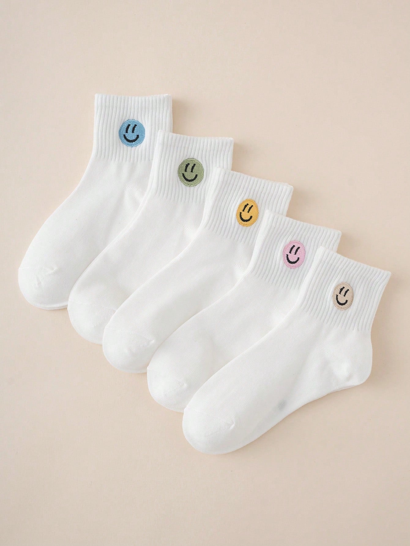 5pairs Interesting Personalized Cartoon Embroidery Smiling Face Design Mid-Calf Kids Socks For Daily