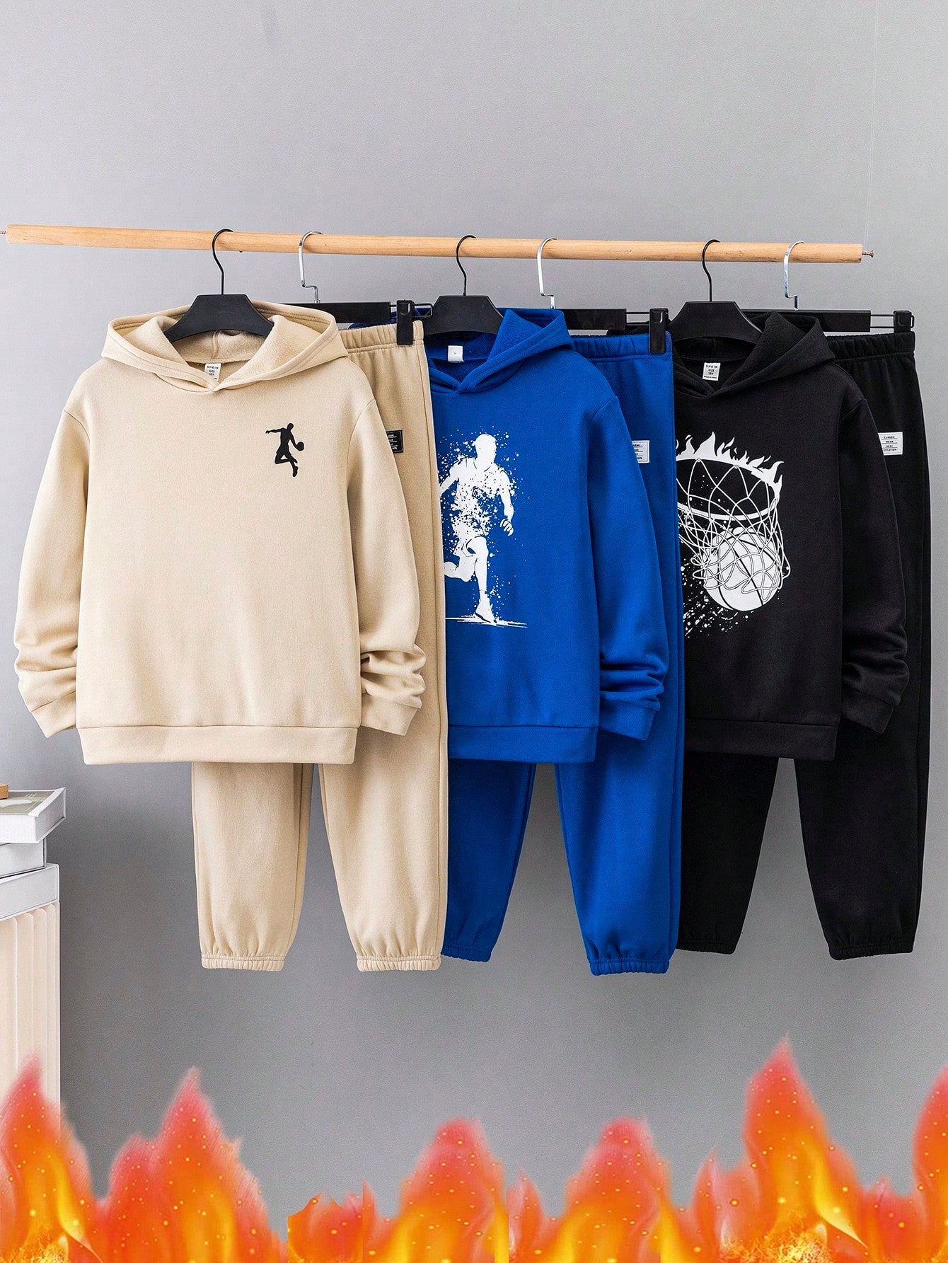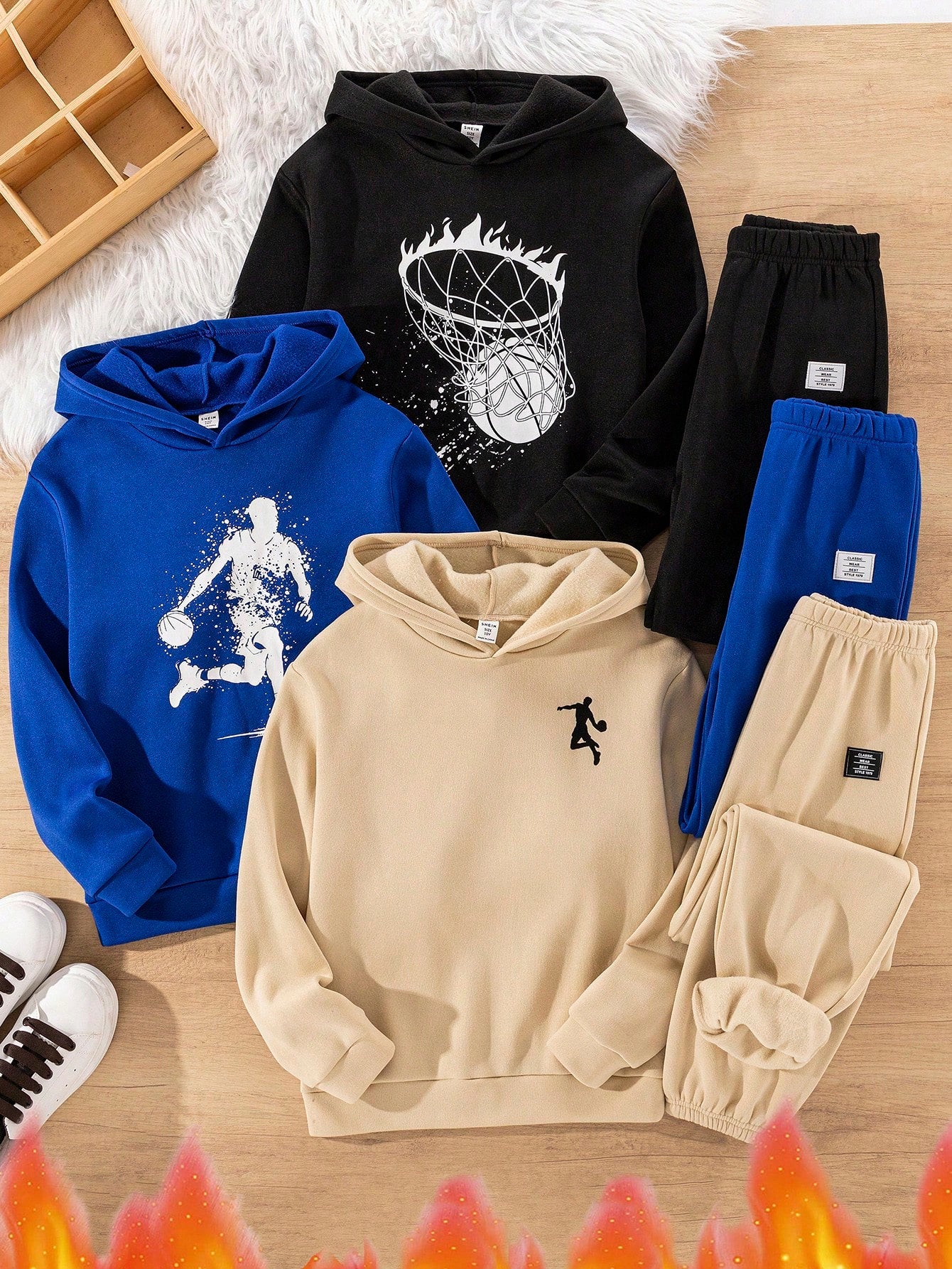 6pcs Kids & Tween Boys' Casual Basketball Print Hooded Loose Long Sleeve Hoodie Sweatshirt & Solid Color Knit Pants 2-Piece Outfits