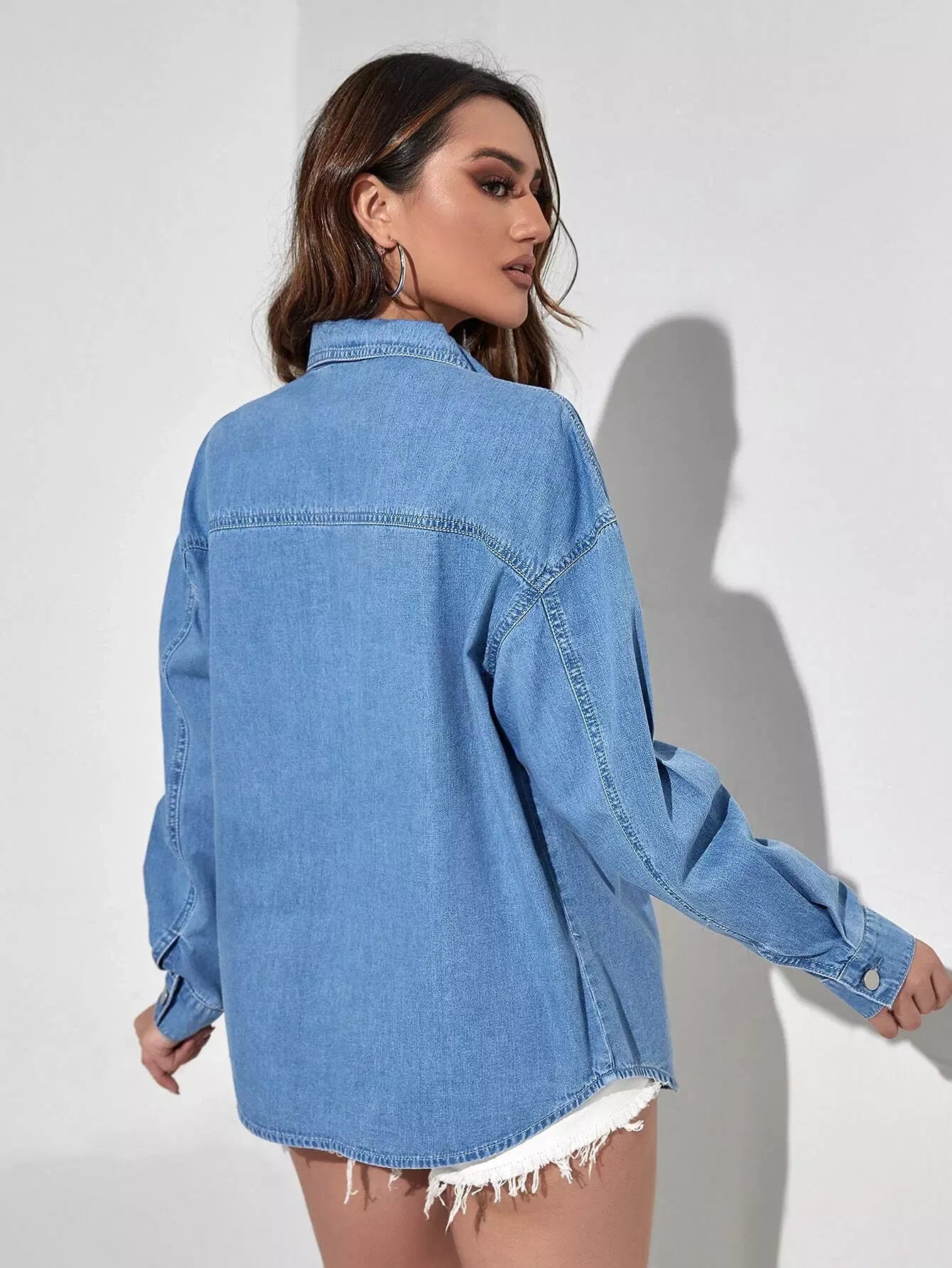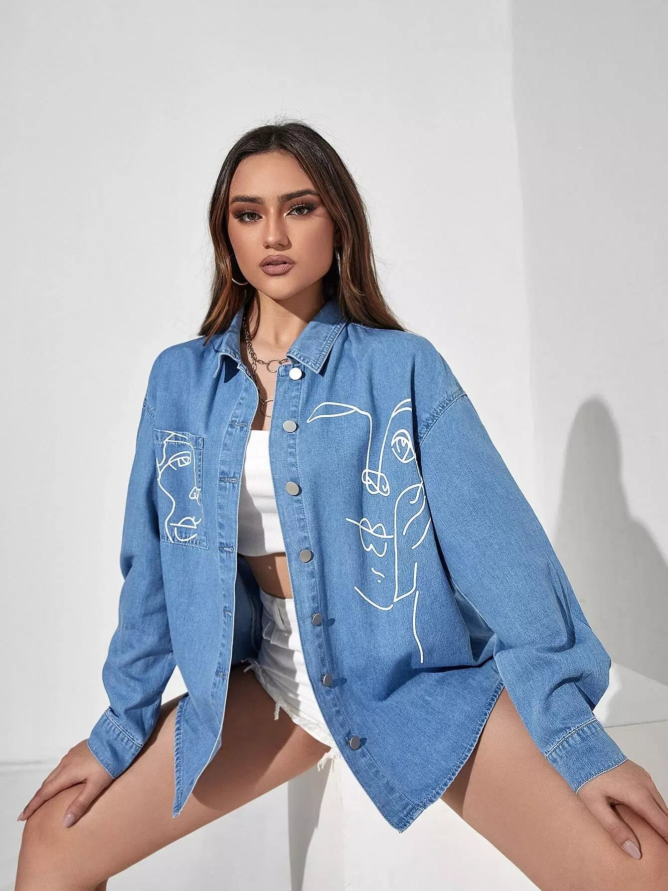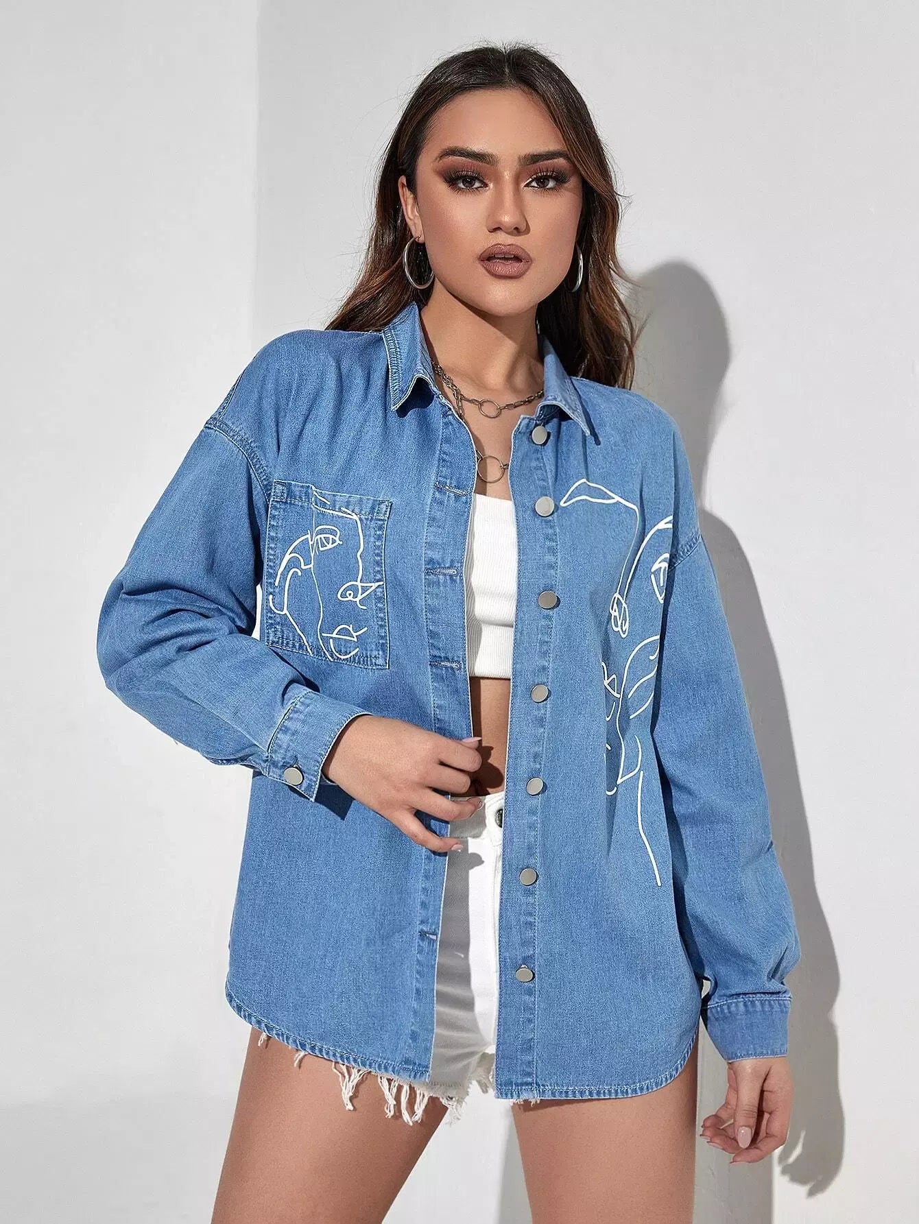 Abstract Figure Graphic Drop Shoulder Button Through Denim Blouse
