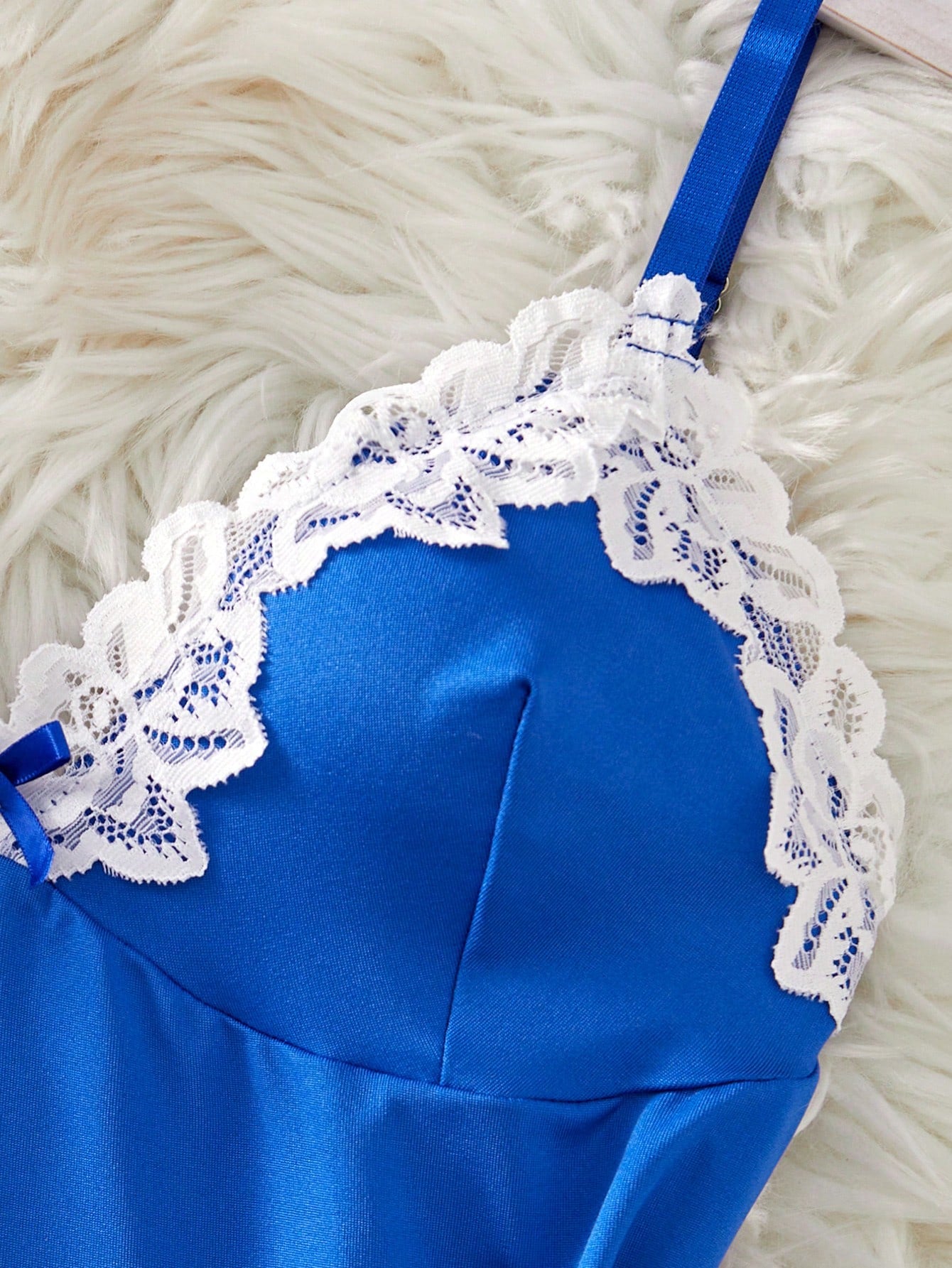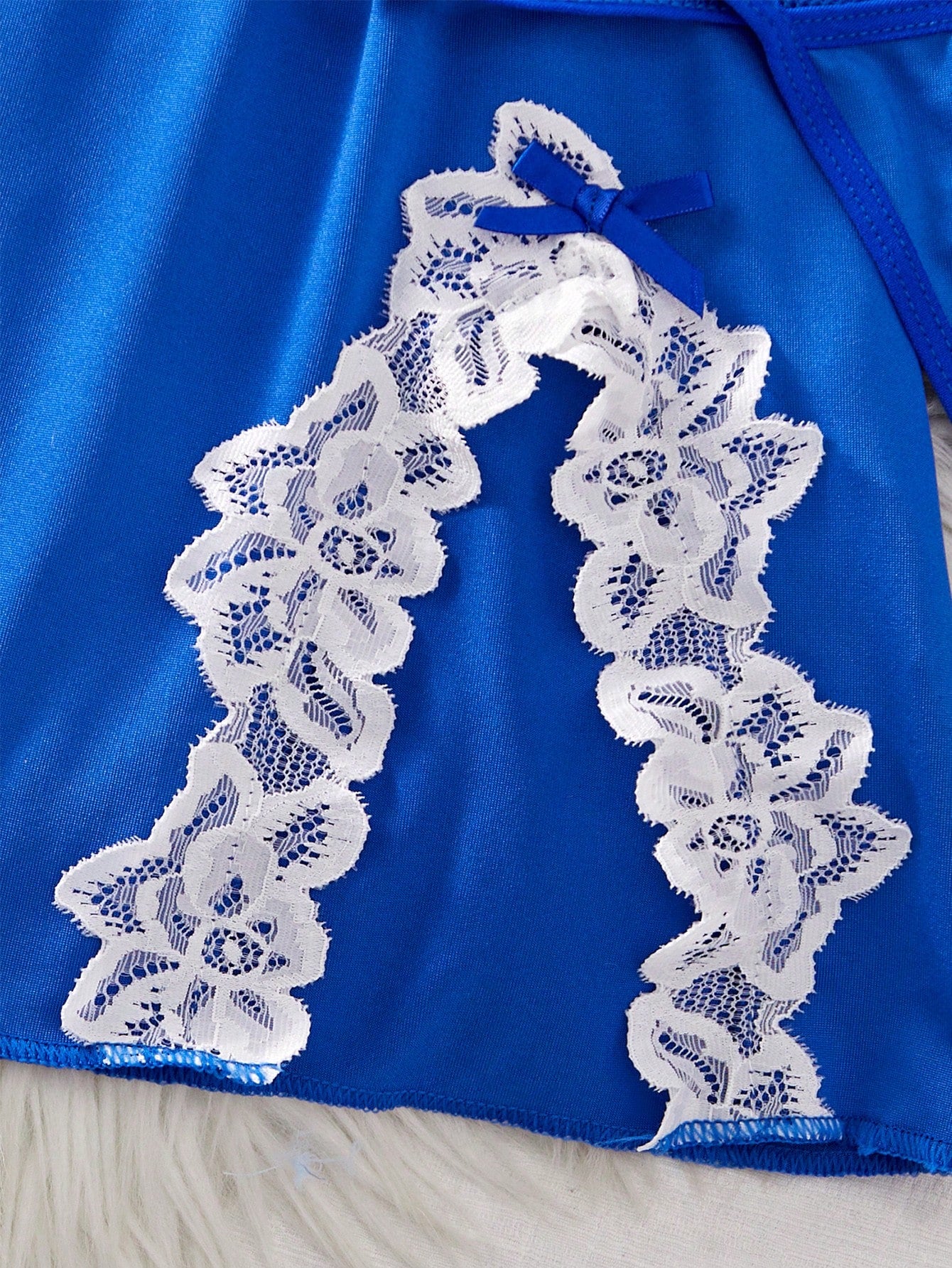 AESKEIA V-Neck Lace Contrast Color Split Fashion Charming Design Ladies Nightgown With G-String