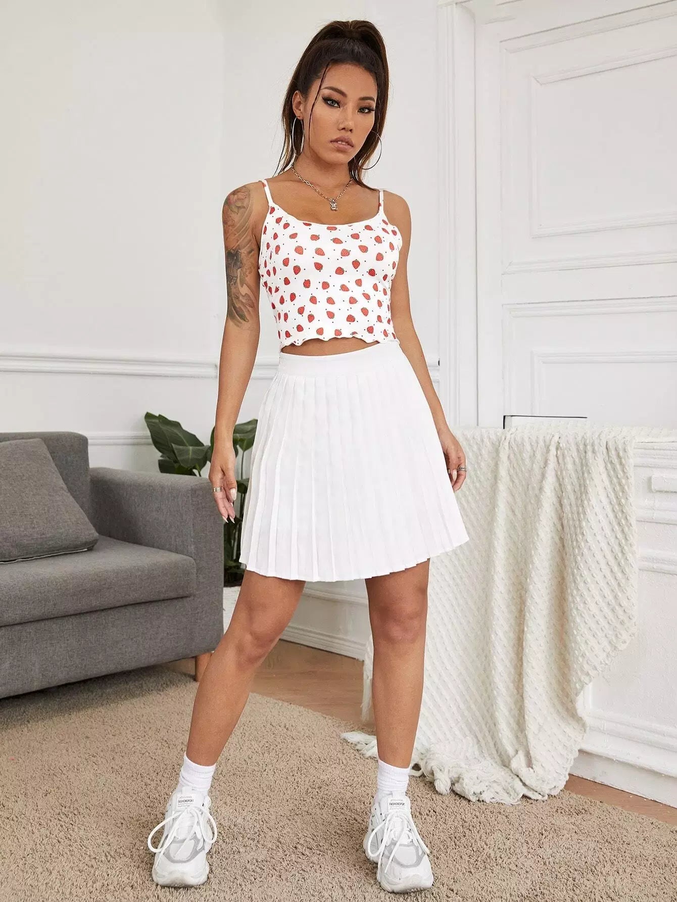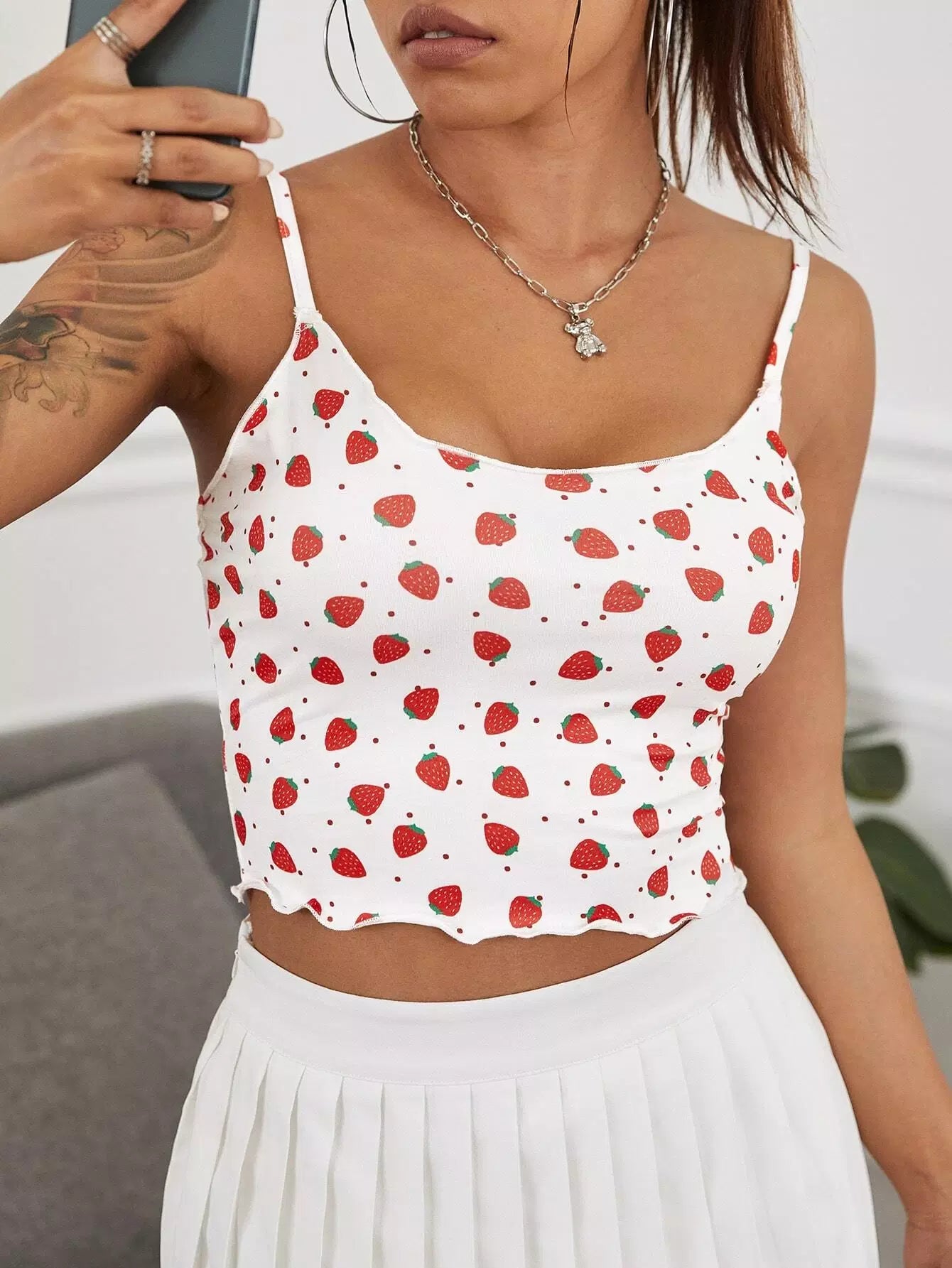 Allover Strawberry Print Lettuce Trim Crop Cami Top