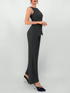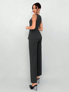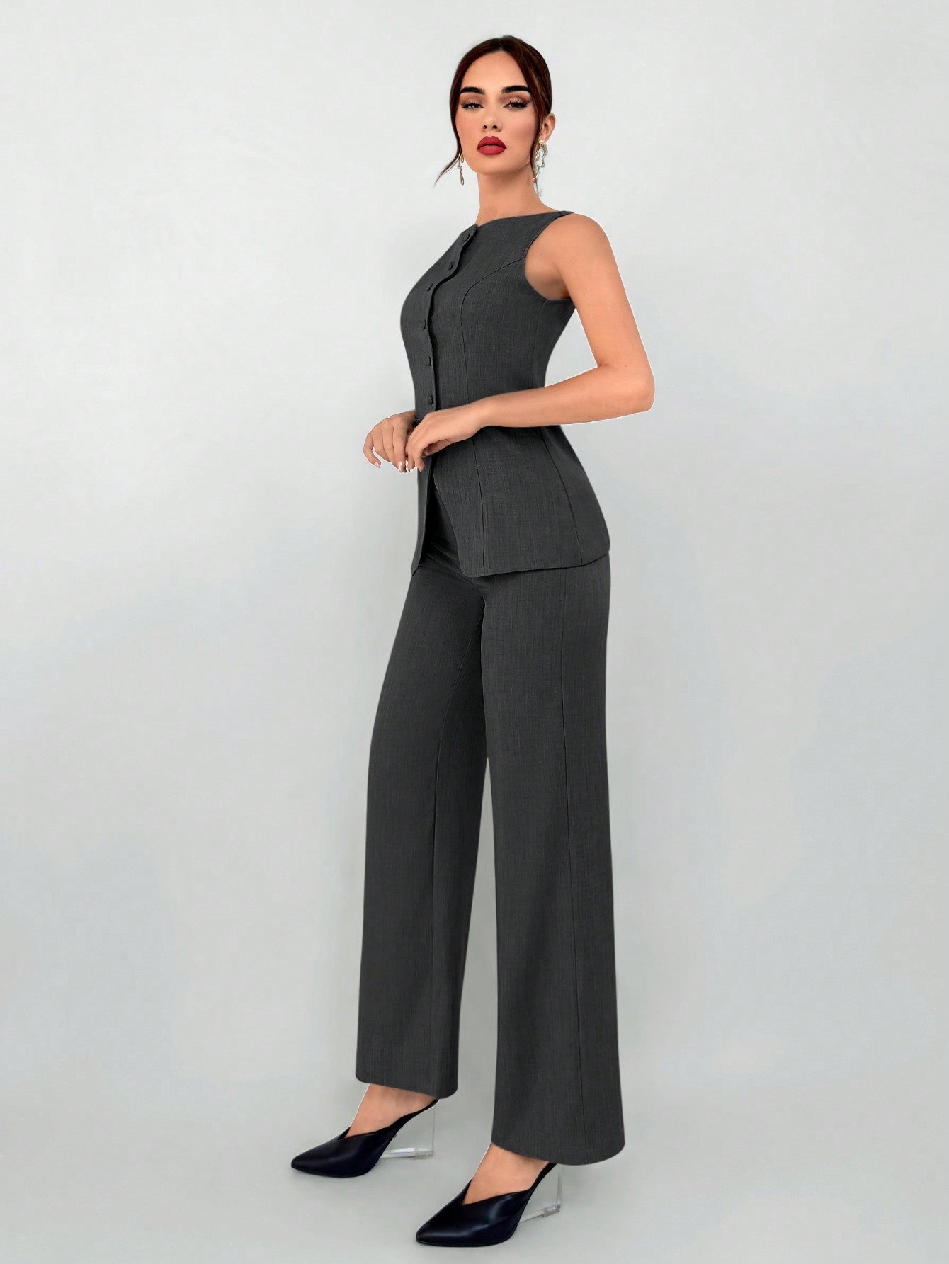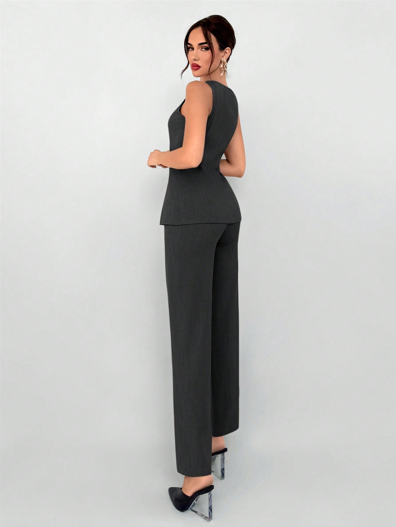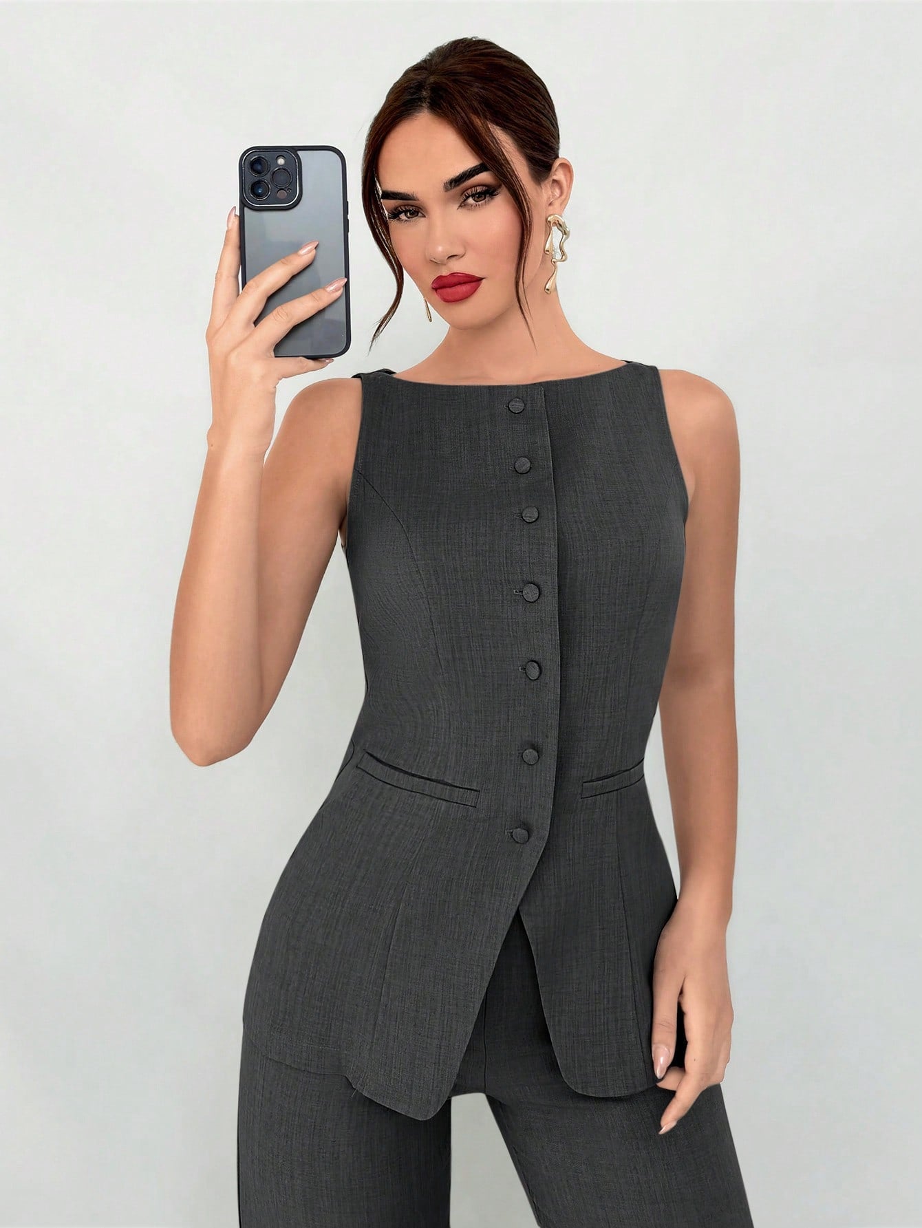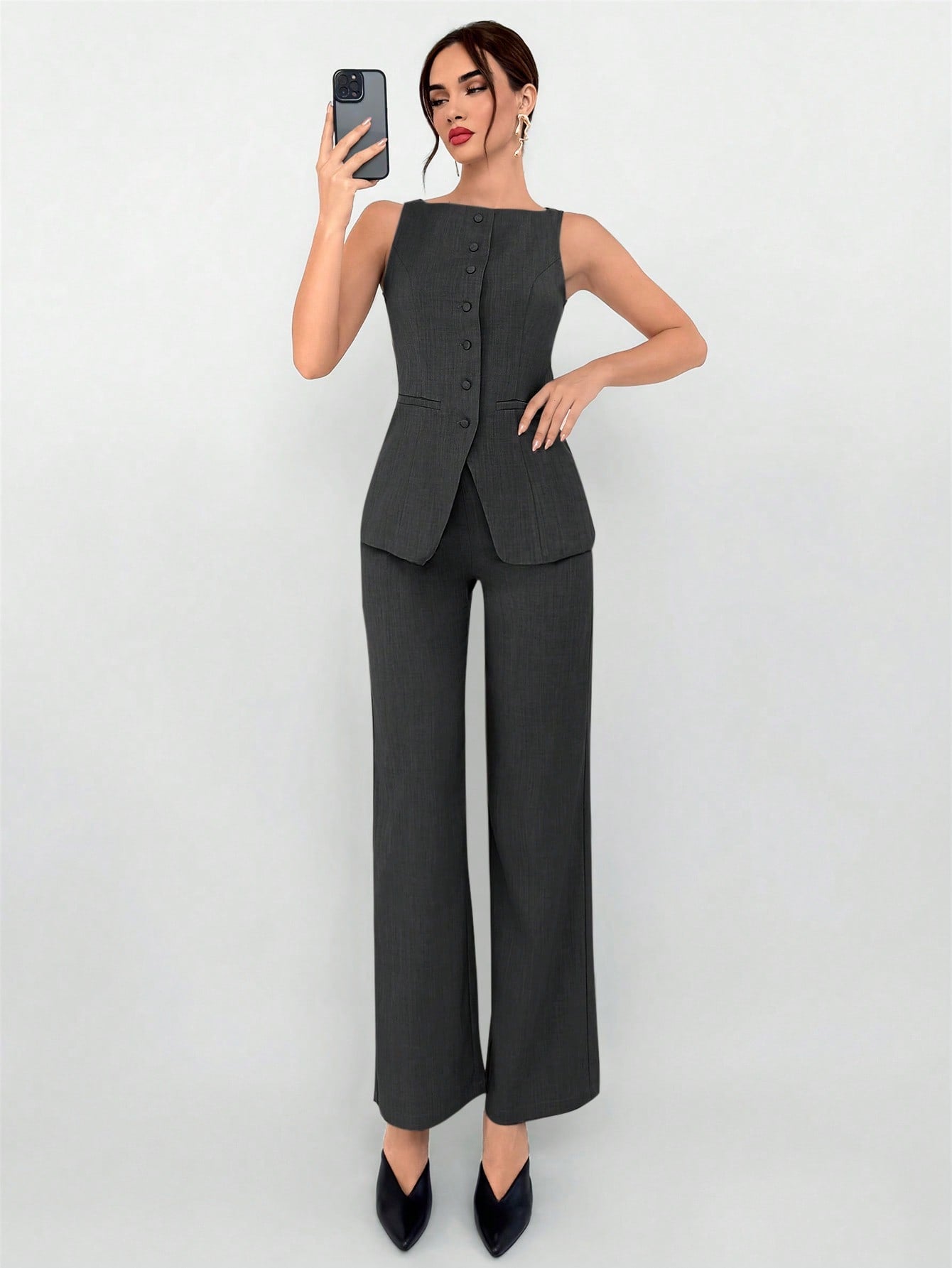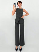 Aloruh 2Pcs Women Khaki Notch Lapel Faux Pocket Decor Blazer Suit Vest And Pants Office Outfit, Autumn/Winter