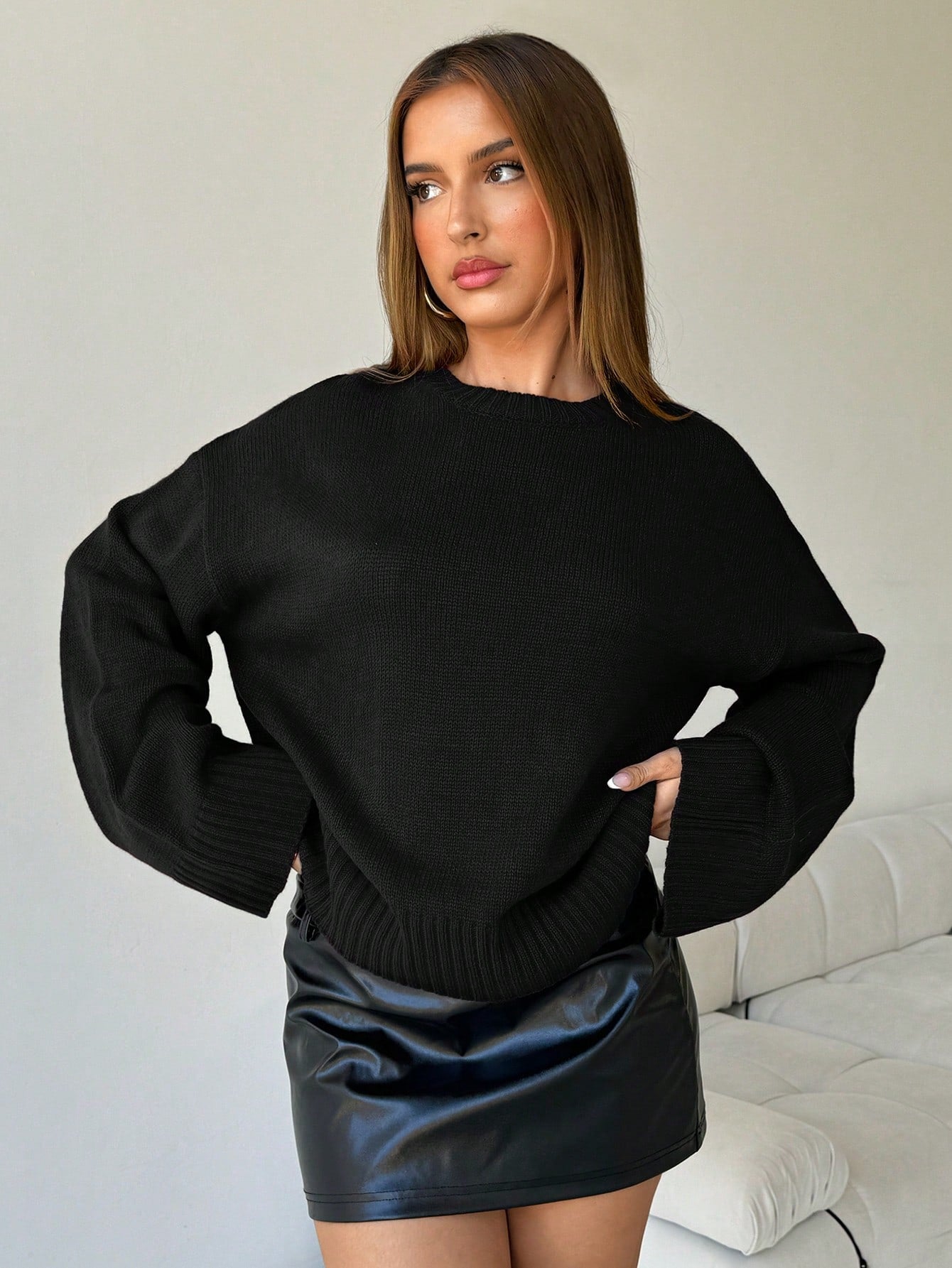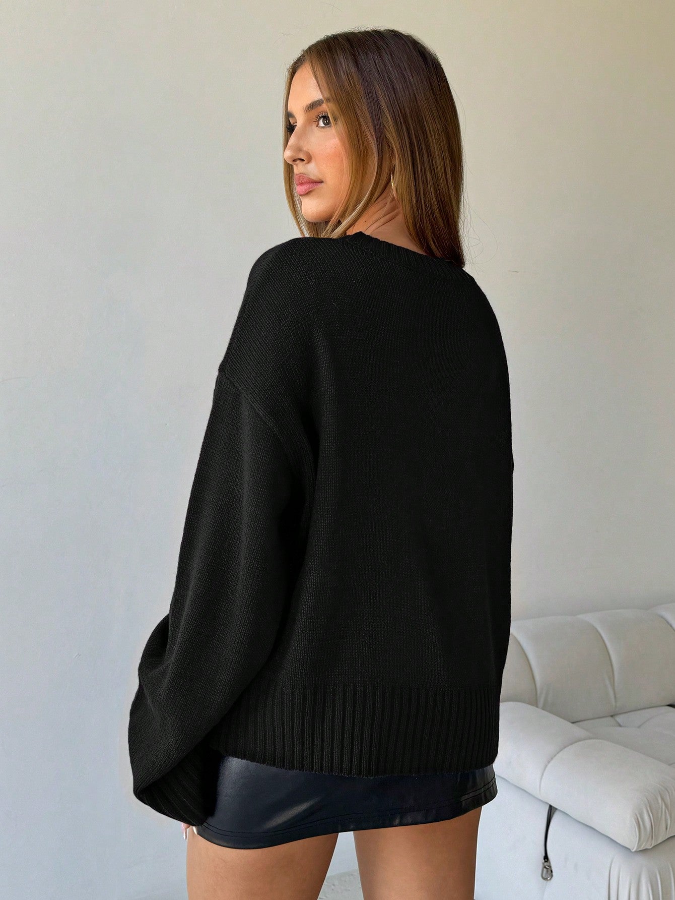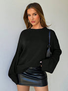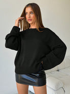 Aloruh Women's Loose Fit V-Neck Long Sleeve Knitted Black Sweater