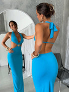 Aloruh Women's Sexy Cut Out Backless V-Neck Metal Shell Buckle DecorBeach Resort Vacation Bodycon Maxi Blue Dress Flossy Maxi Dress Royal Blue St Patick Day Outfit Easter Dress Women Summer Outfits For Women