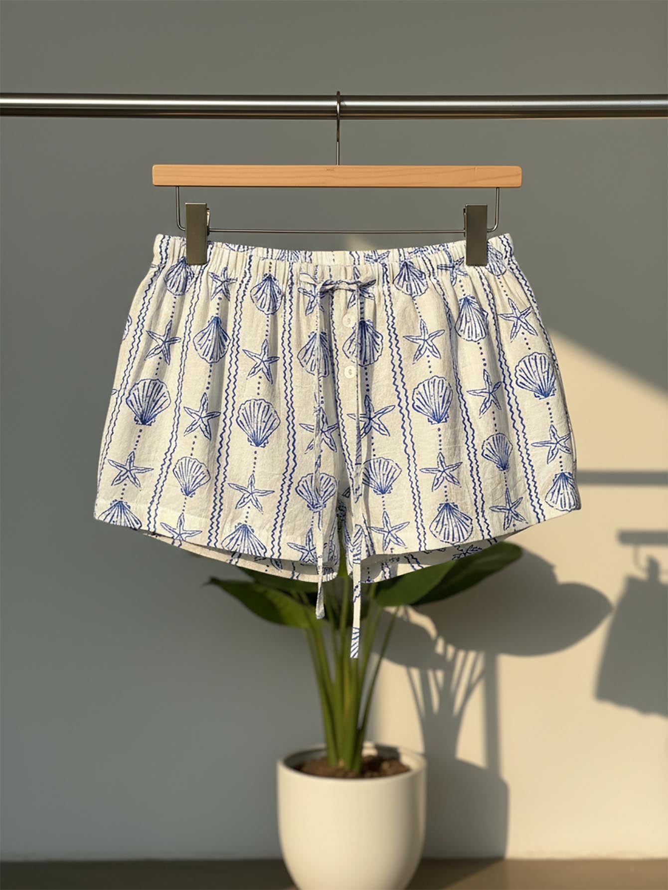 Aloruh Women's Summer Beach Ocean Shell & Starfish Print Blue Striped Button Waist Tie Shorts