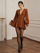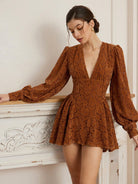 Aveloria Romantic Floral Embossed Elegant V-Neck Cinched-Waist Double-Tier Lantern Sleeve Short Women's