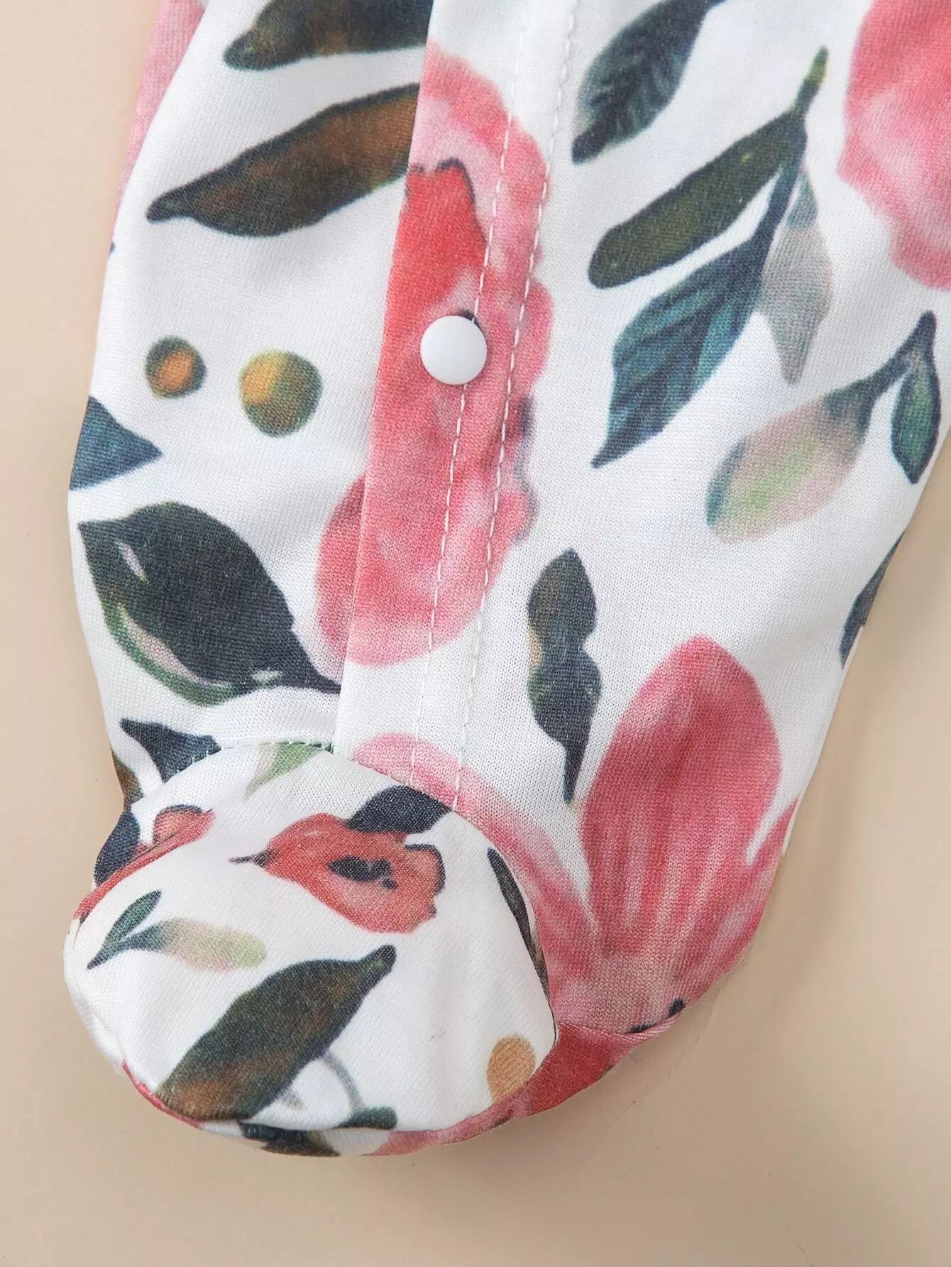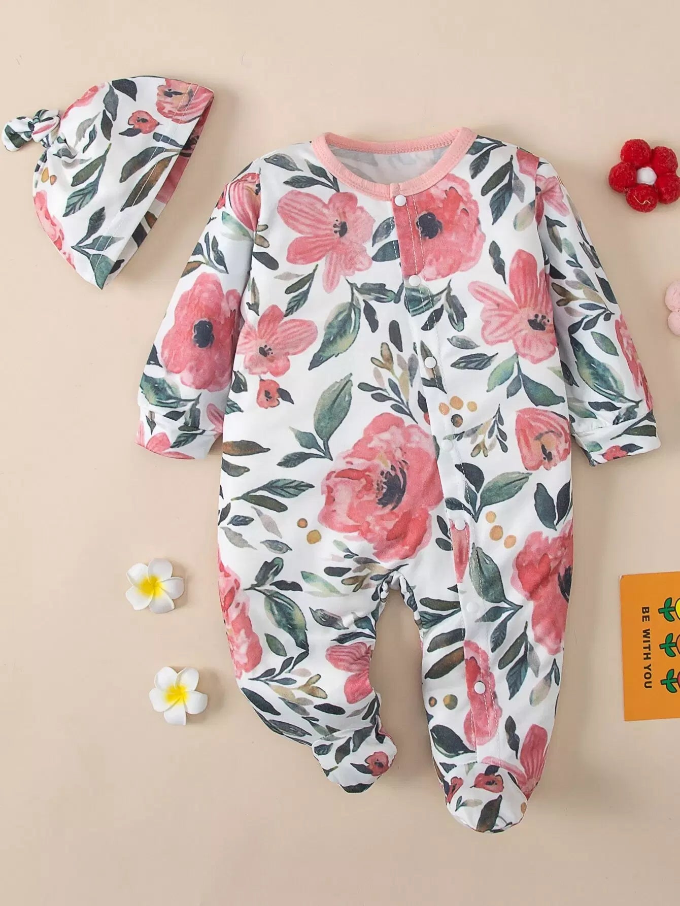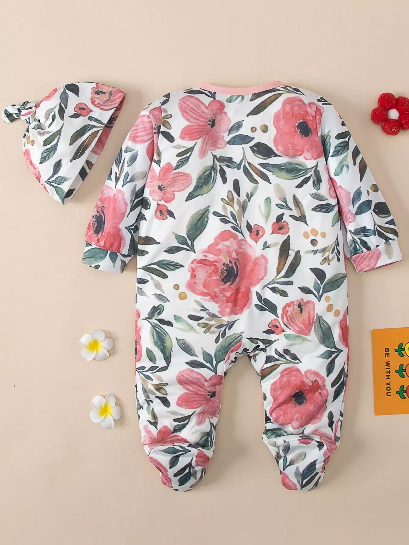 Baby Floral Print Footed Sleep Jumpsuit & Hat