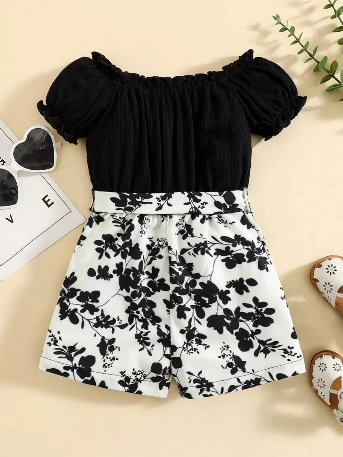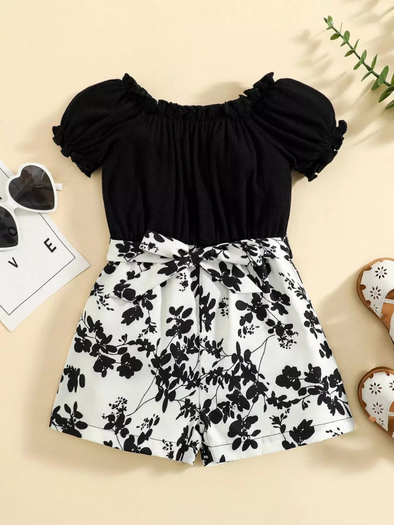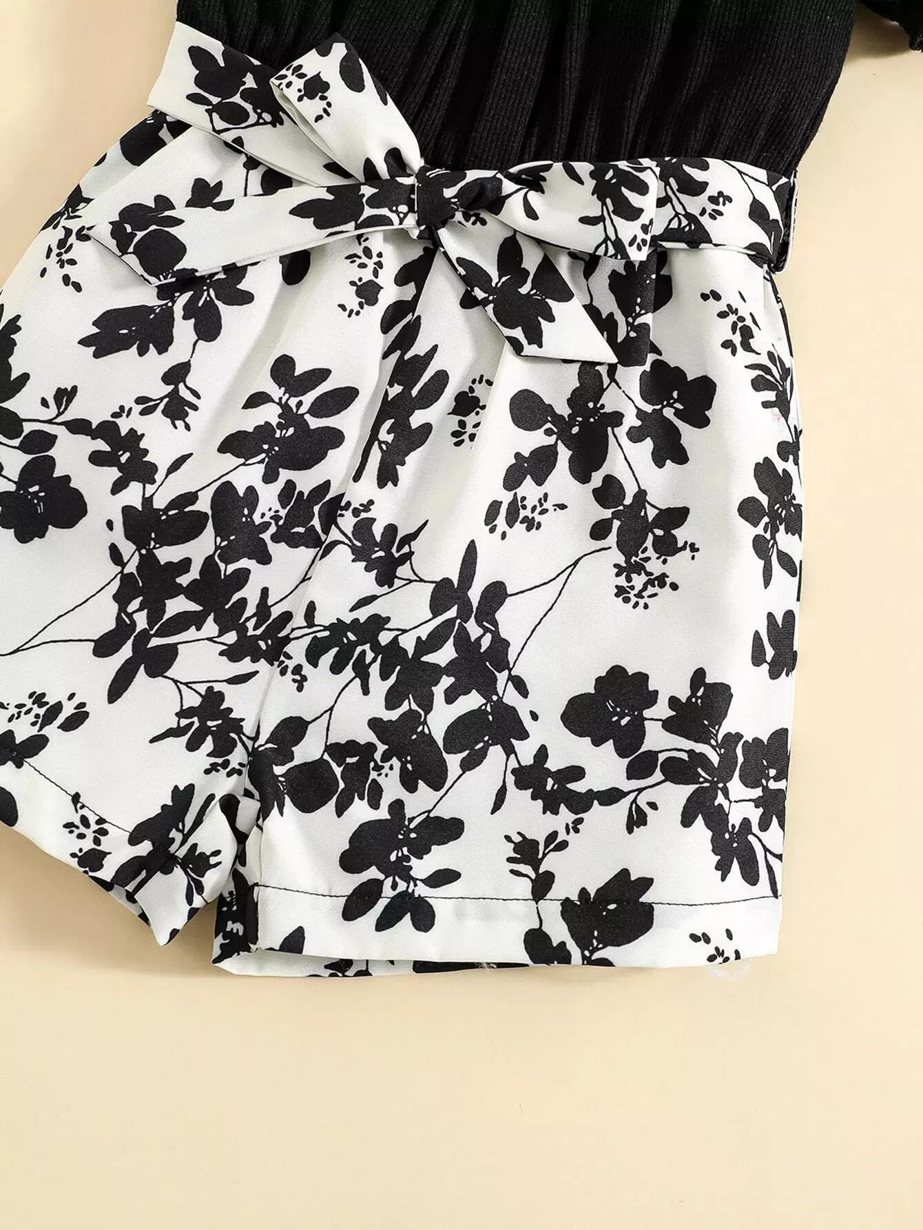 Baby Floral Print Puff Sleeve Frilled Romper Without Belt