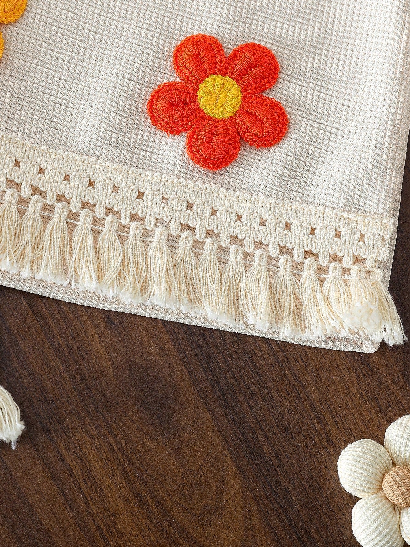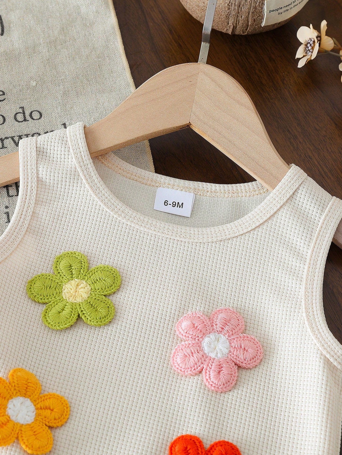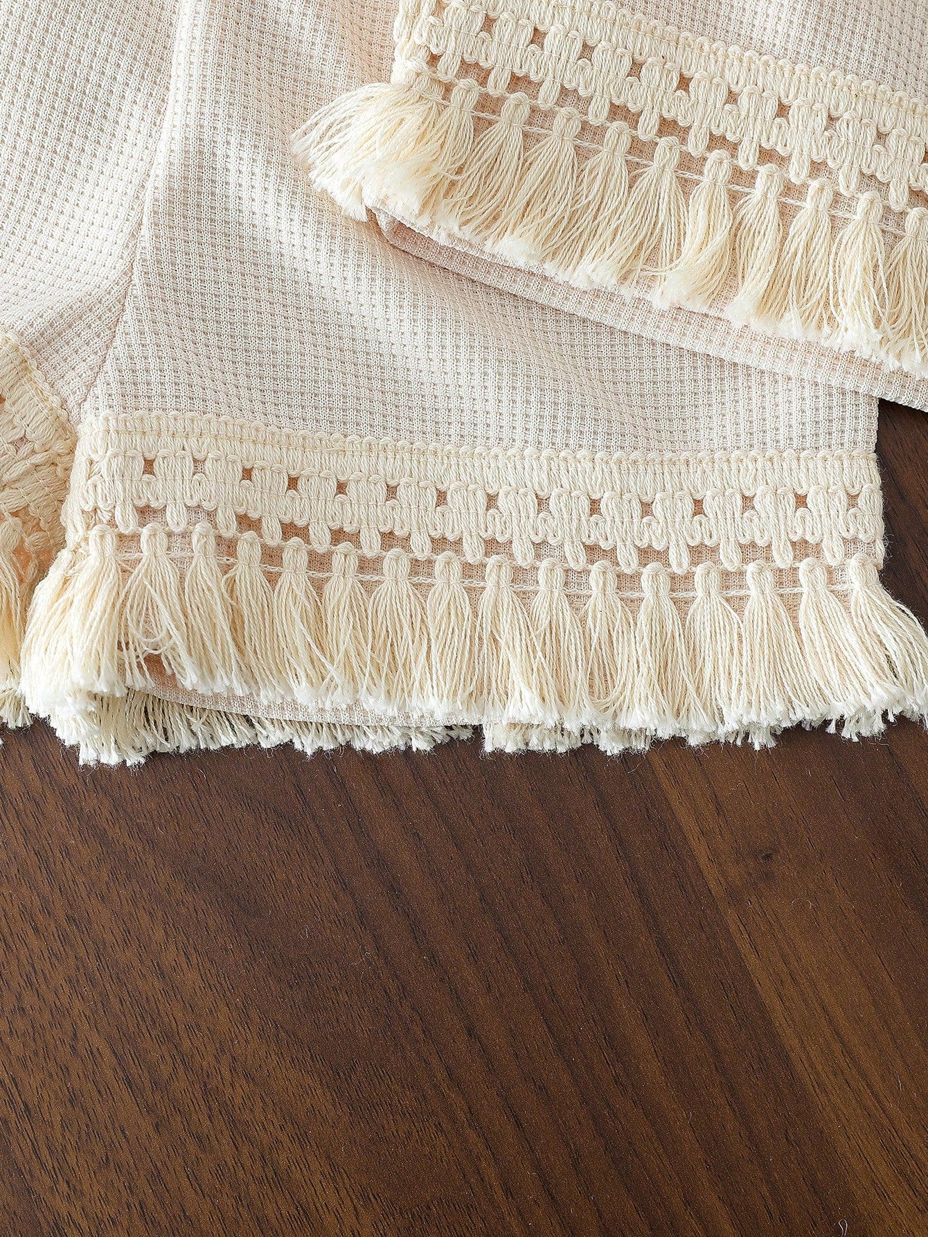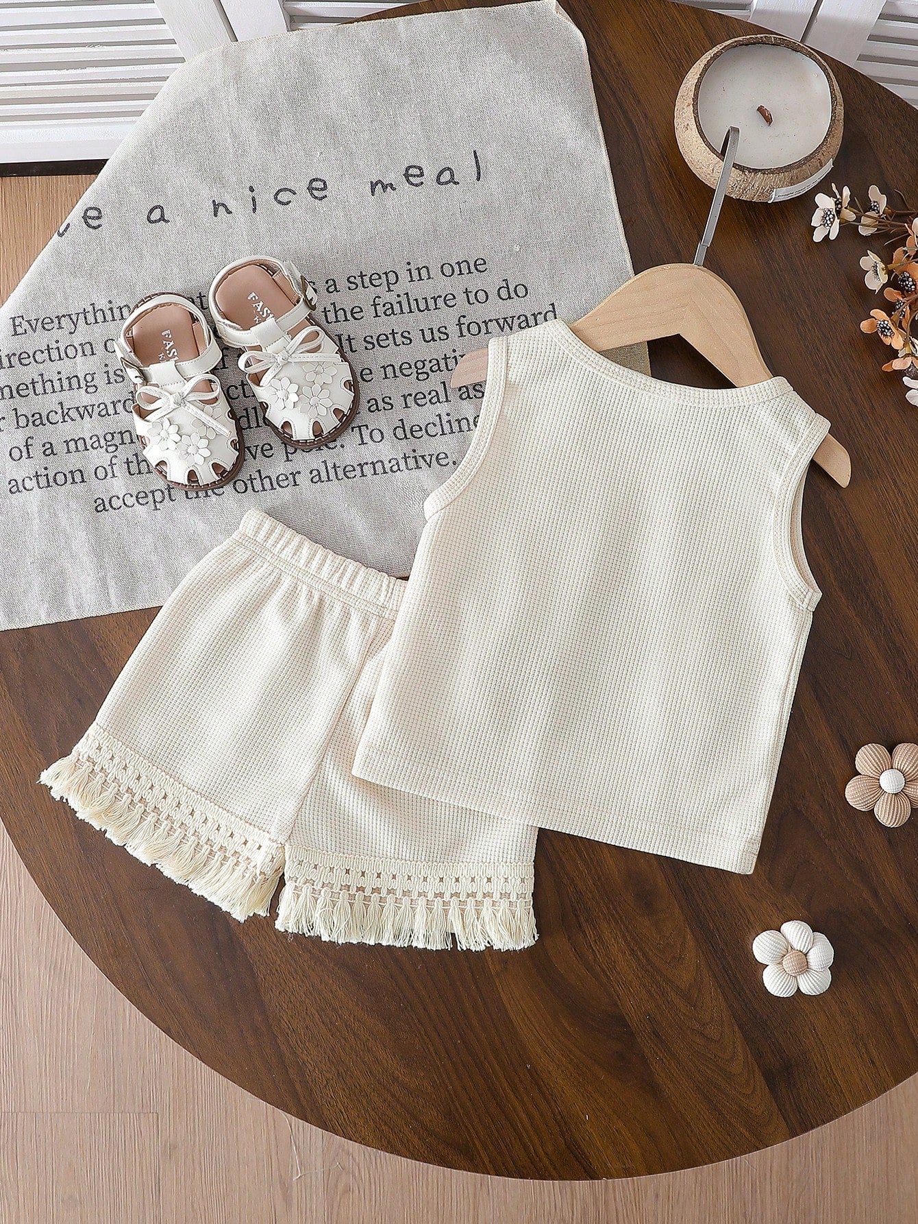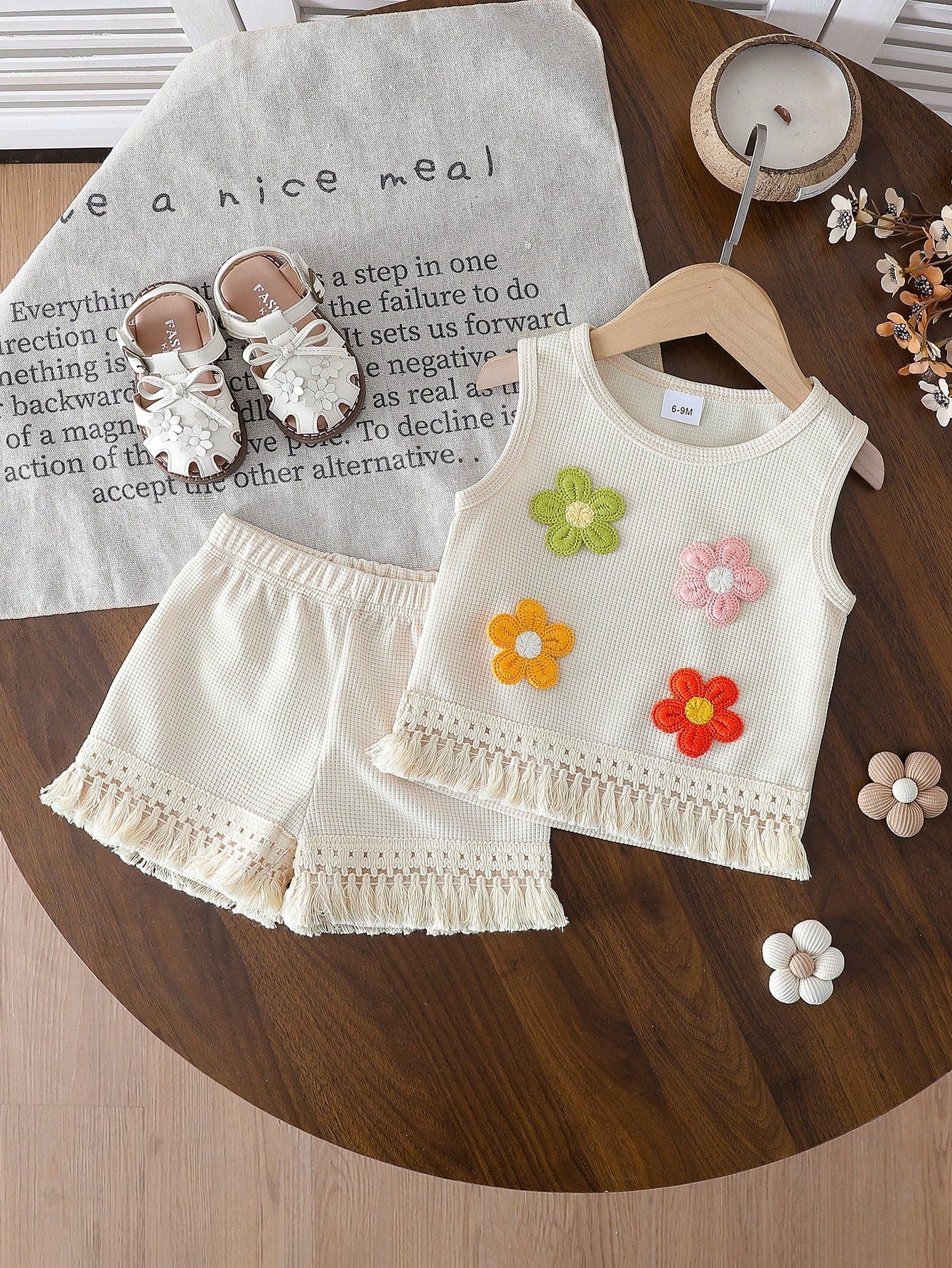 Baby Girl Summer Casual Bohemian Style Textured Waffle Floral Decor Sleeveless Top And Waffle Apricot Fringe Shorts Set