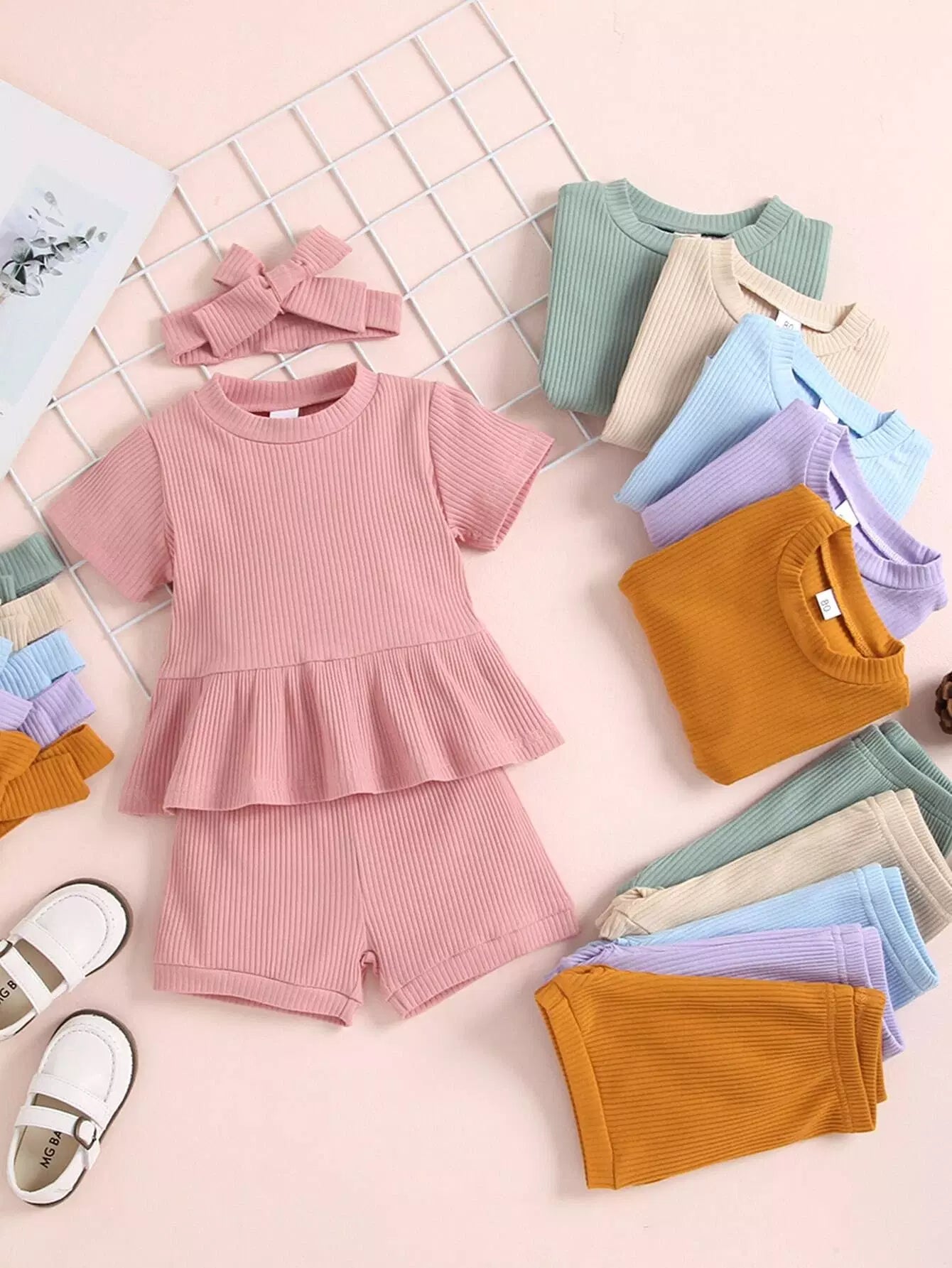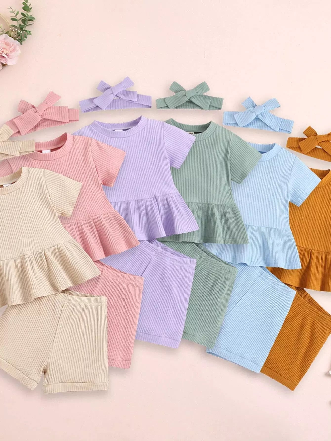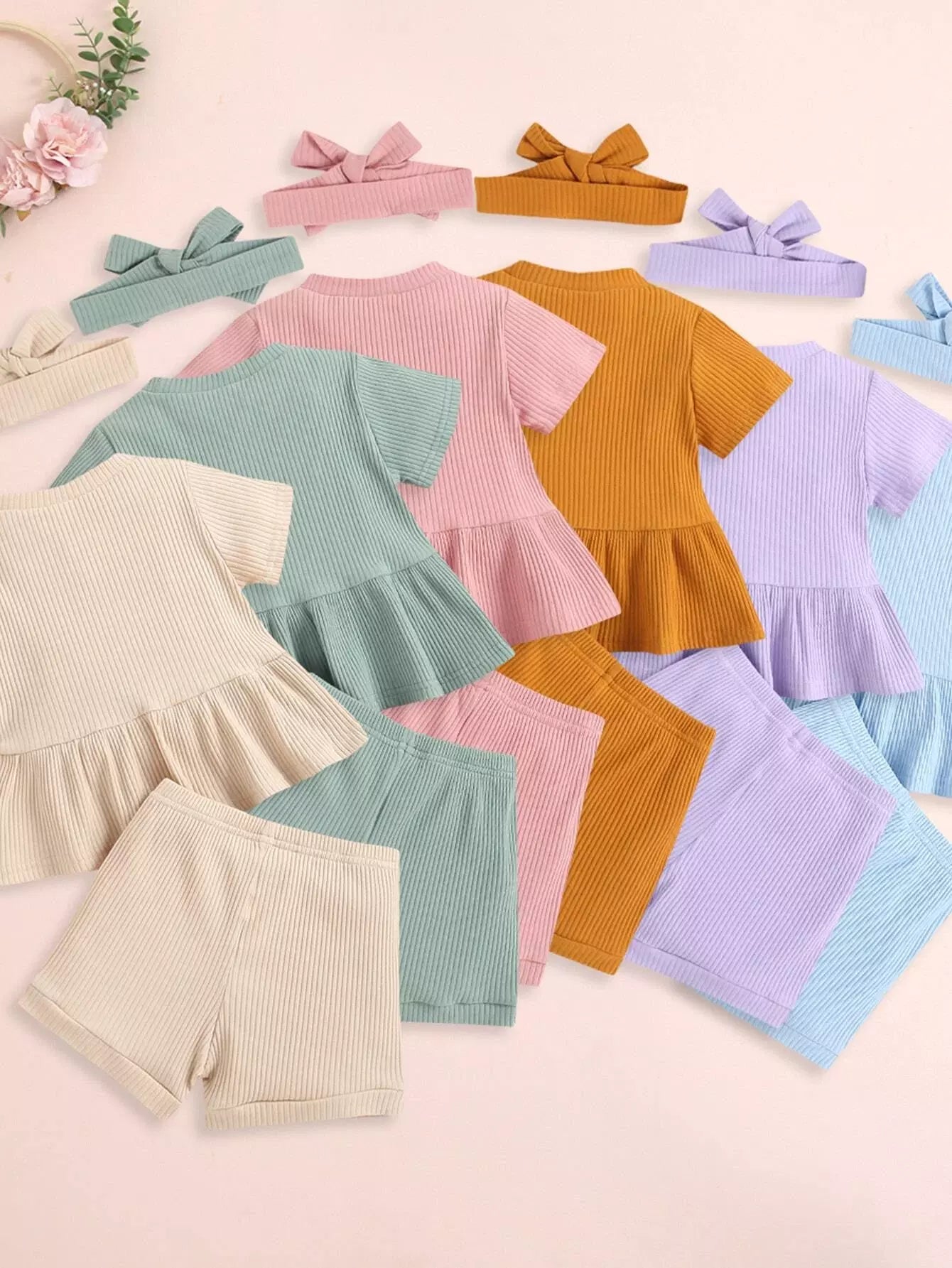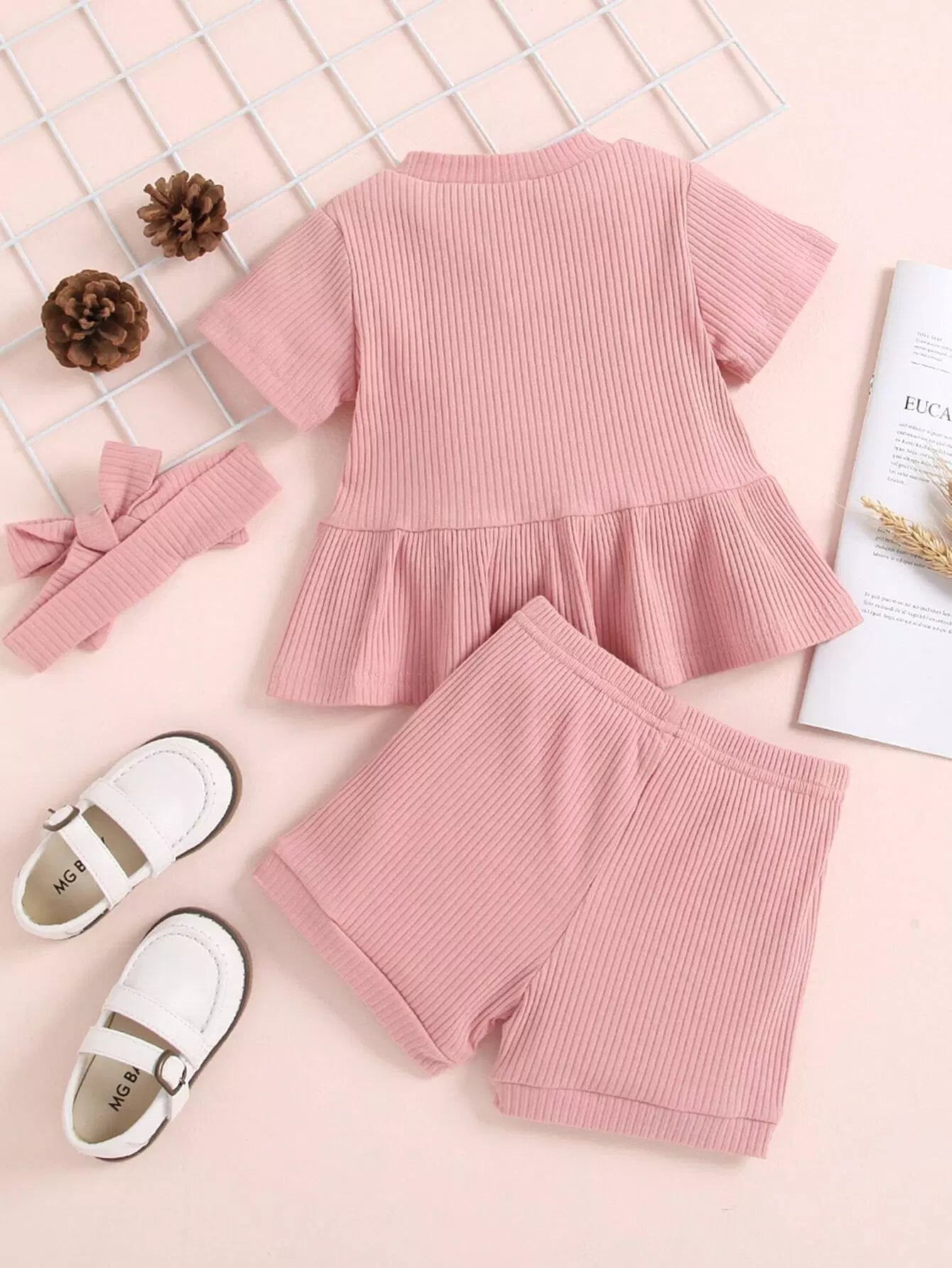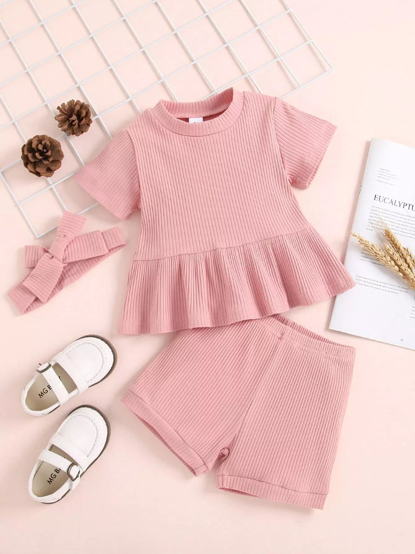 Baby Ribbed Ruffle Hem 1 Tee & 1 Shorts & 1 Headband