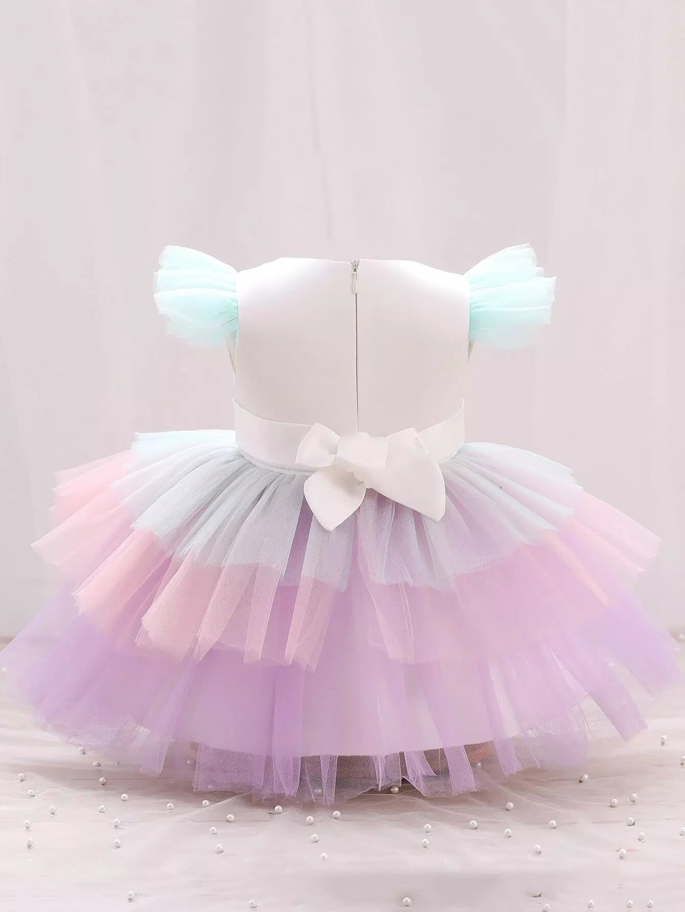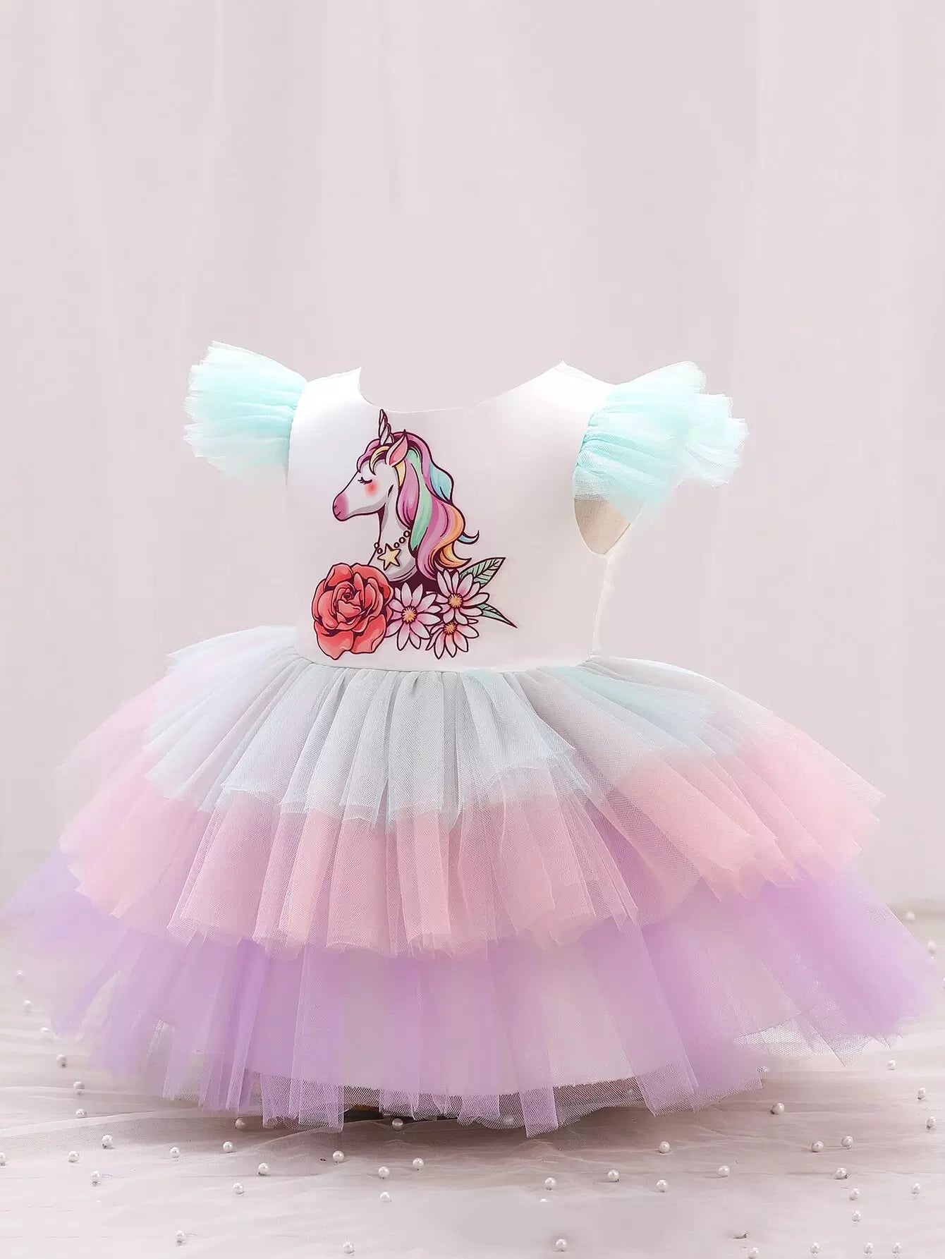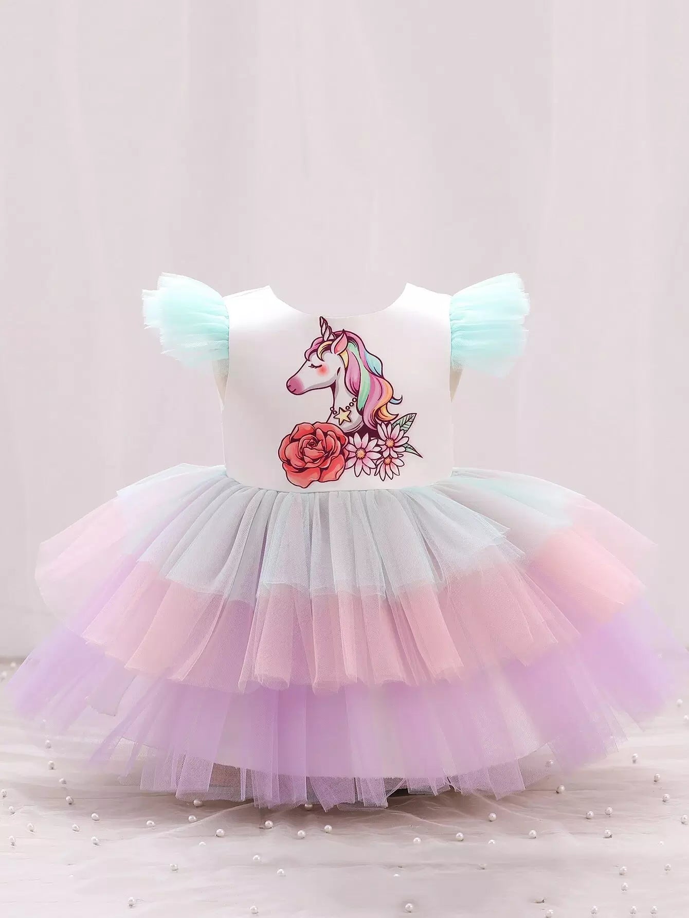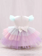 Baby Unicorn Print Colorful Layered Mesh Hem Gown Dress