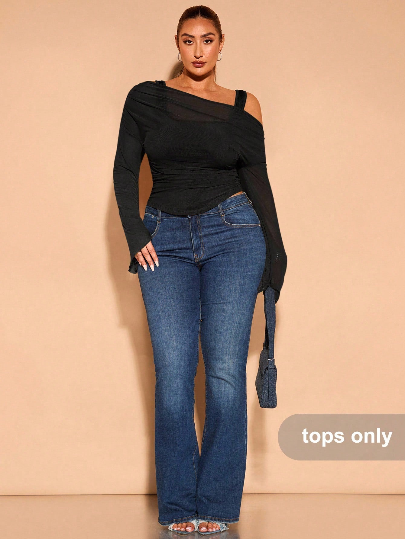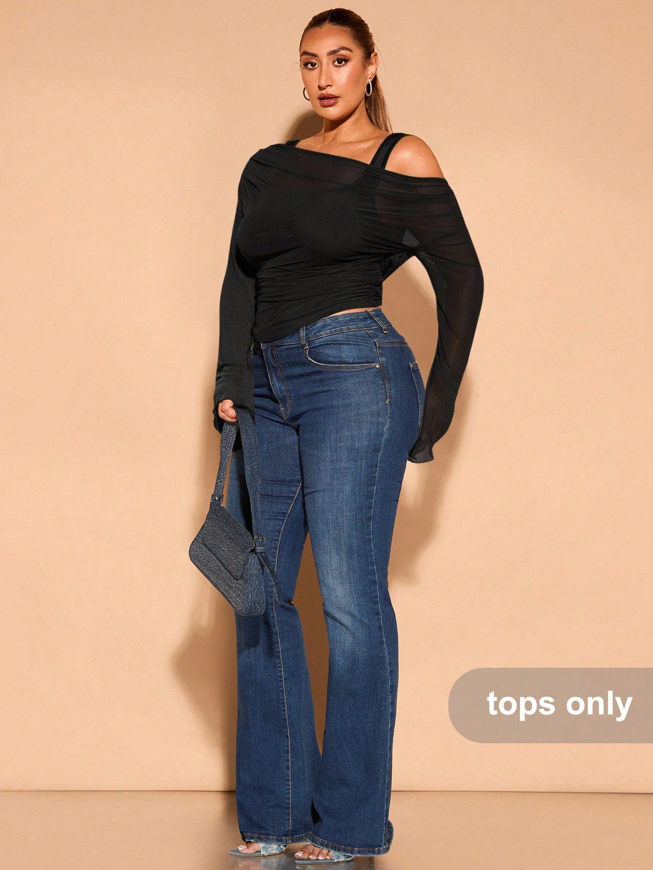 BAE Plus Size Green Off-Shoulder Asymmetrical Trumpet Long-Sleeved Camisole Fake Two Elegant And Sweet Tops