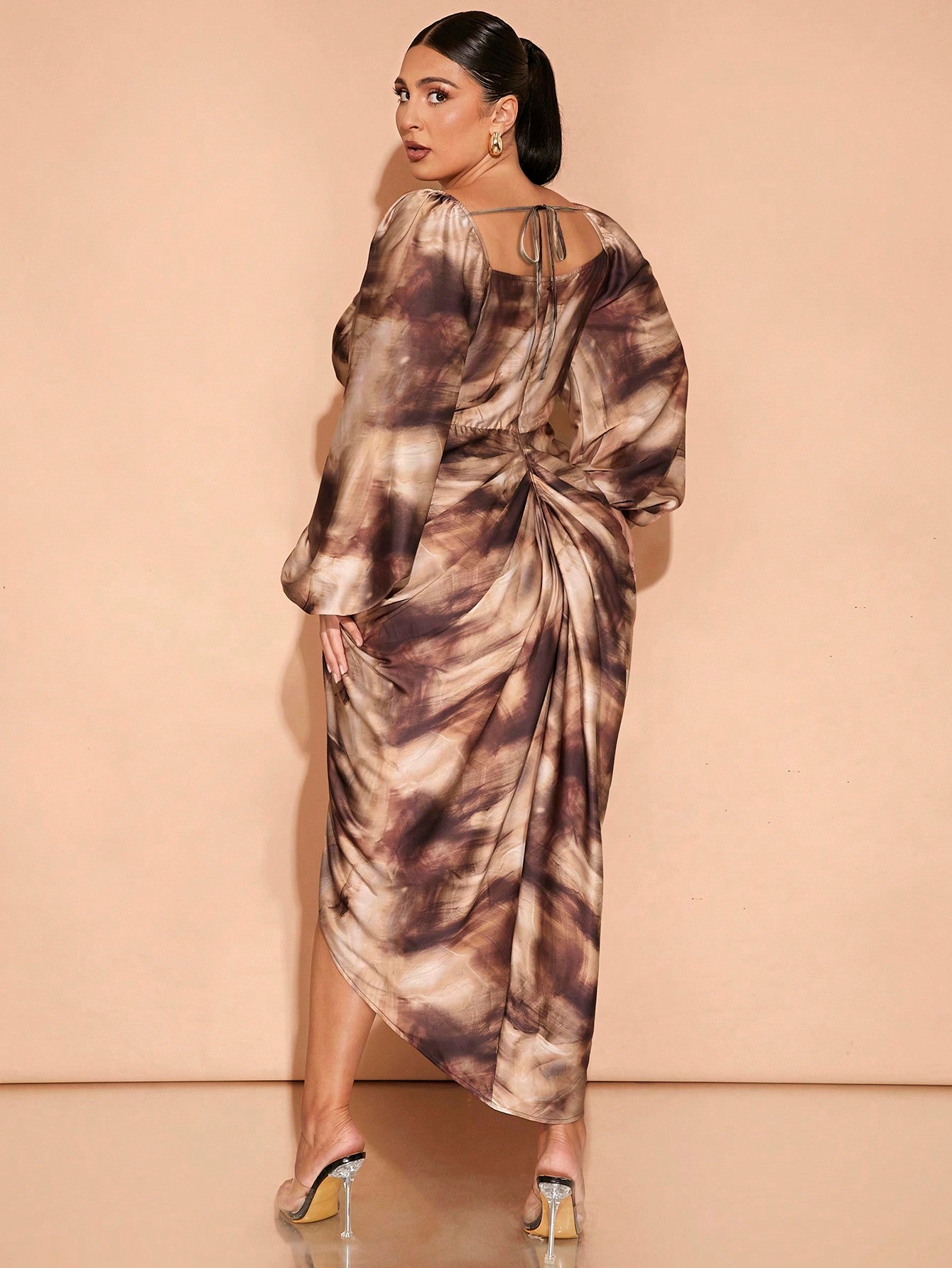 BAE Plus Size Women's Elegant Party Date Sexy Draped Neck Ruched Asymmetrical Hem Slit Dress With Long