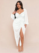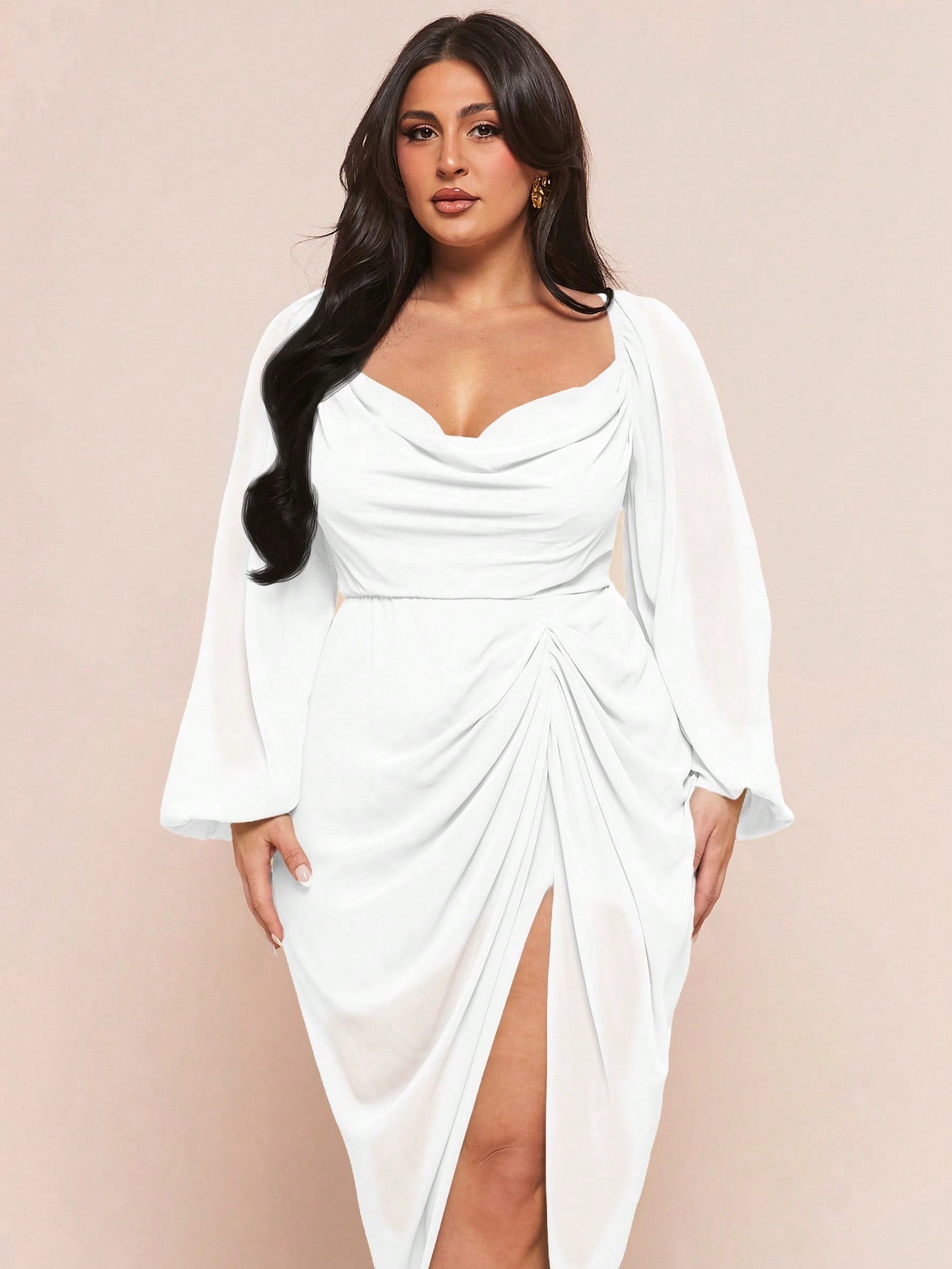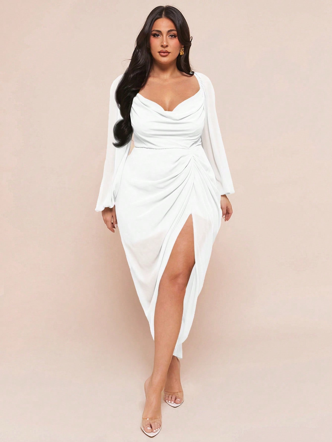 BAE Plus Size Women's Elegant Party Date Sexy Glitter Sequins Draped Neck Ruched Asymmetrical Hem Slit Dress With Long Sleeve