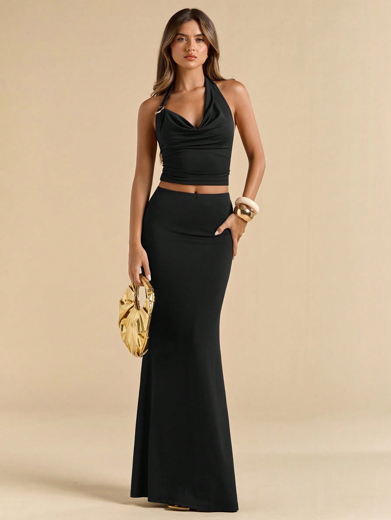 BAE Women Metal Decor Coffee Brown Bodycon Knitted Top & Skirt Set
