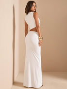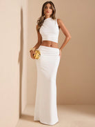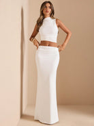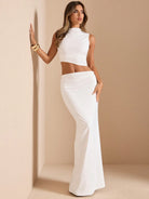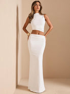 BAE Women Solid White Asymmetric Twist Ruched Shoulder Camisole & Low Waist Ruched Pencil Skirt 2 Pieces Knit Set