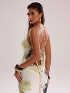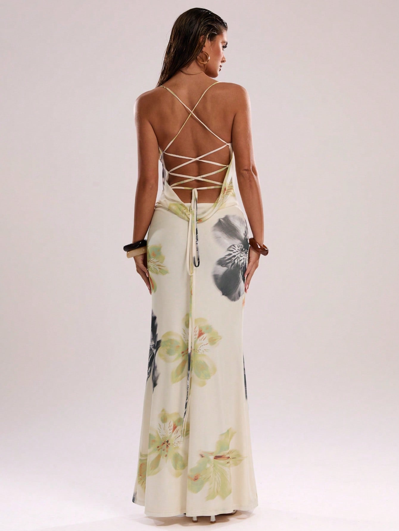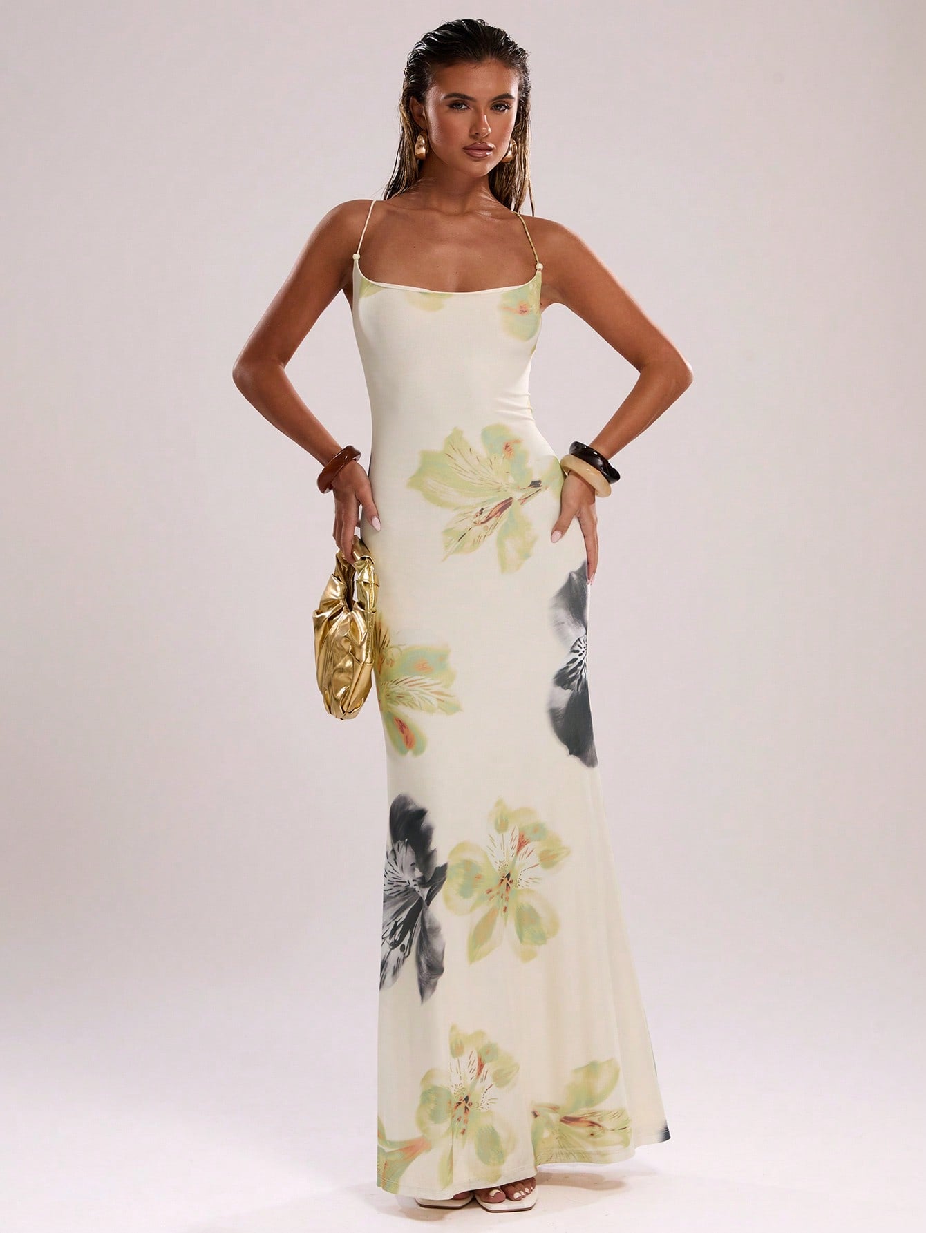BAE Women's Elegant Floral Print Maxi Dress: Sleeveless Spaghetti Strap Knitted Mermaid Hem Beige Maxi Dress For Special Occasions