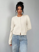 BASICS Casual Solid Color Round Neck Long Sleeve Loose Cropped Women Sweater White Cardigan