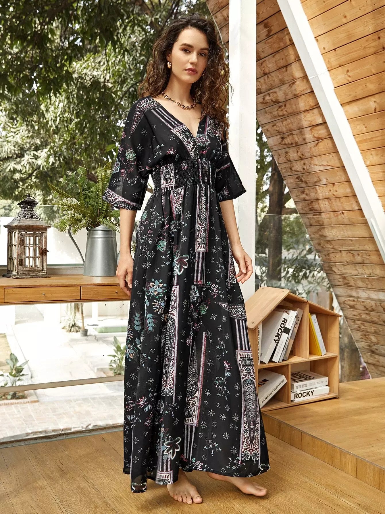 Batwing Sleeve Shirred Waist Floral Dress