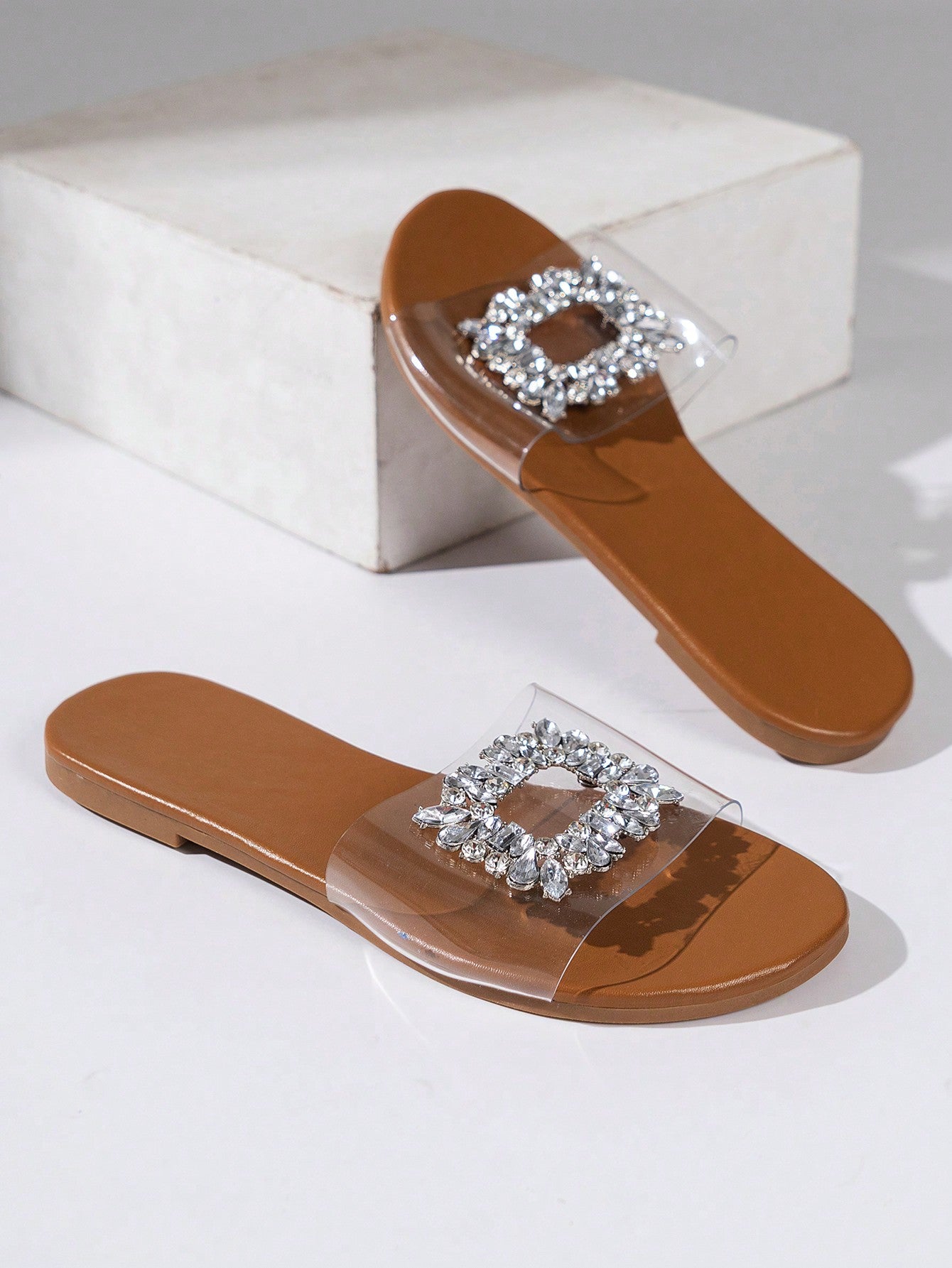 Beach Vacation Rhinestone Square Buckle Brown Transparent Flat Women's Sandals