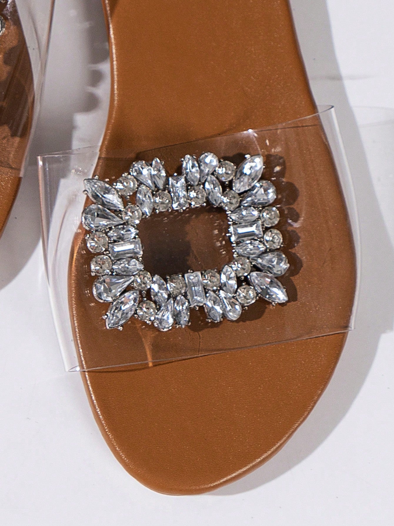 women Beach Vacation Rhinestone Square Buckle Brown Transparent Flat Women's Sandals