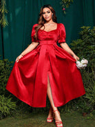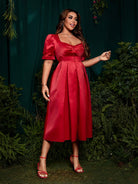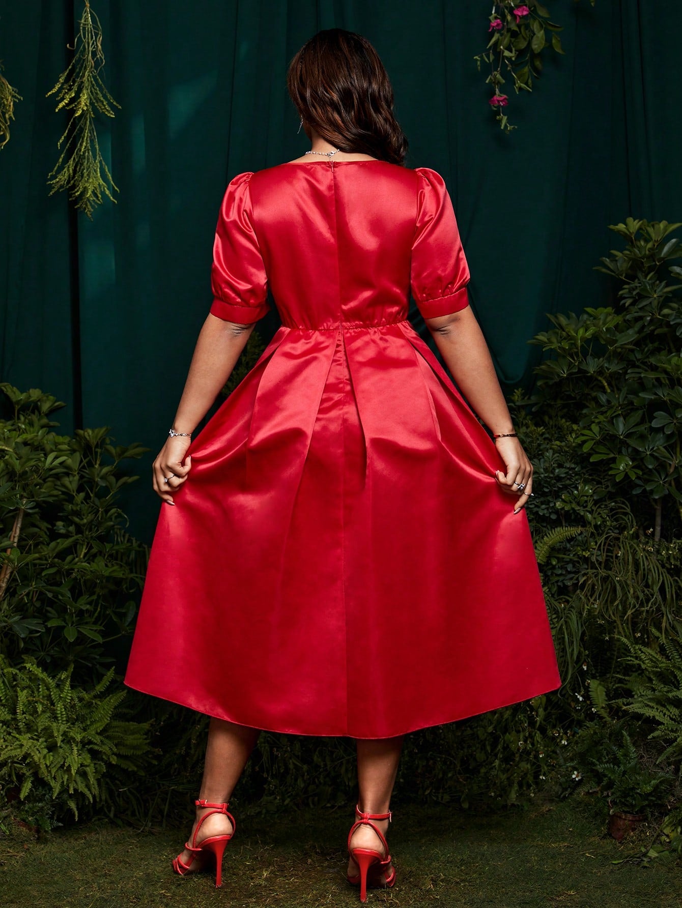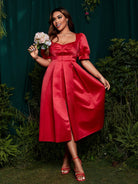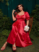 Belle Plus Size Puff Sleeve Satin Elegant Vintage Wedding Guest Long Dress With Waist Gathering