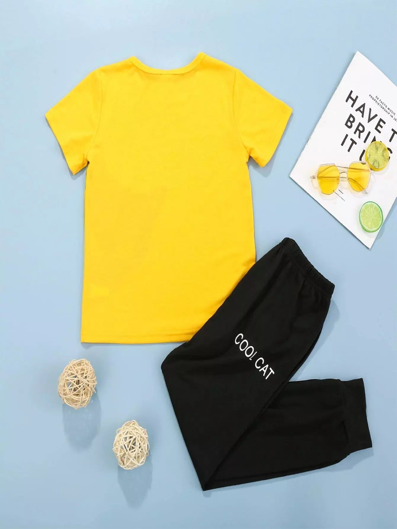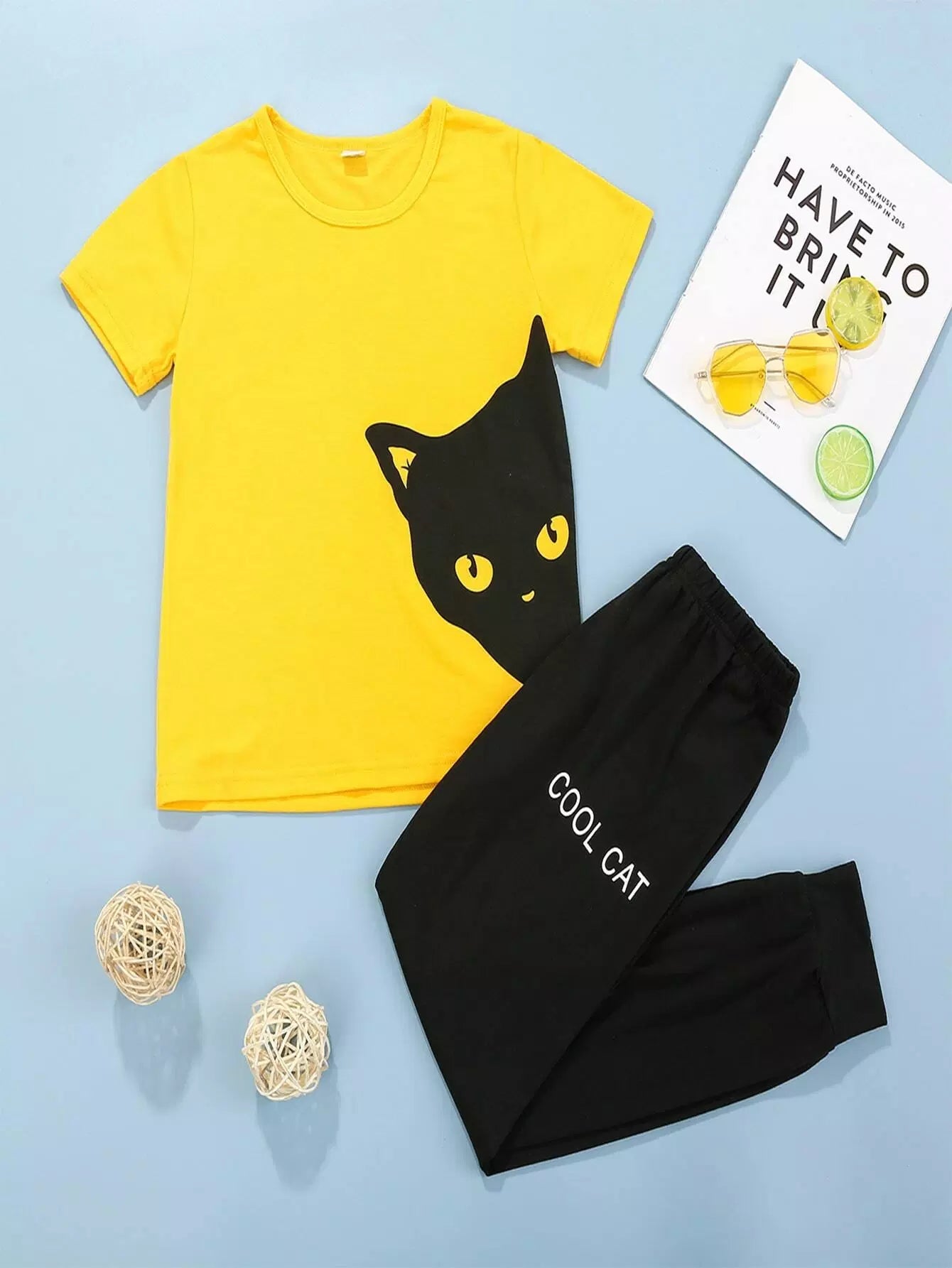 Boys Cartoon Cat & Letter Graphic PJ Set