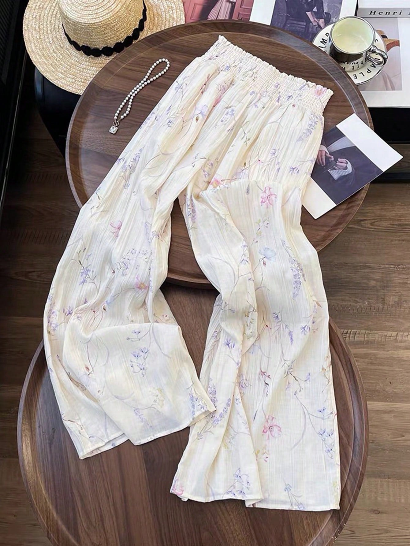 Breezaya Apricot Floral High Waist Wide Leg Pants, Casual Spring/Summer Style, Can Be Paired With Retro