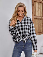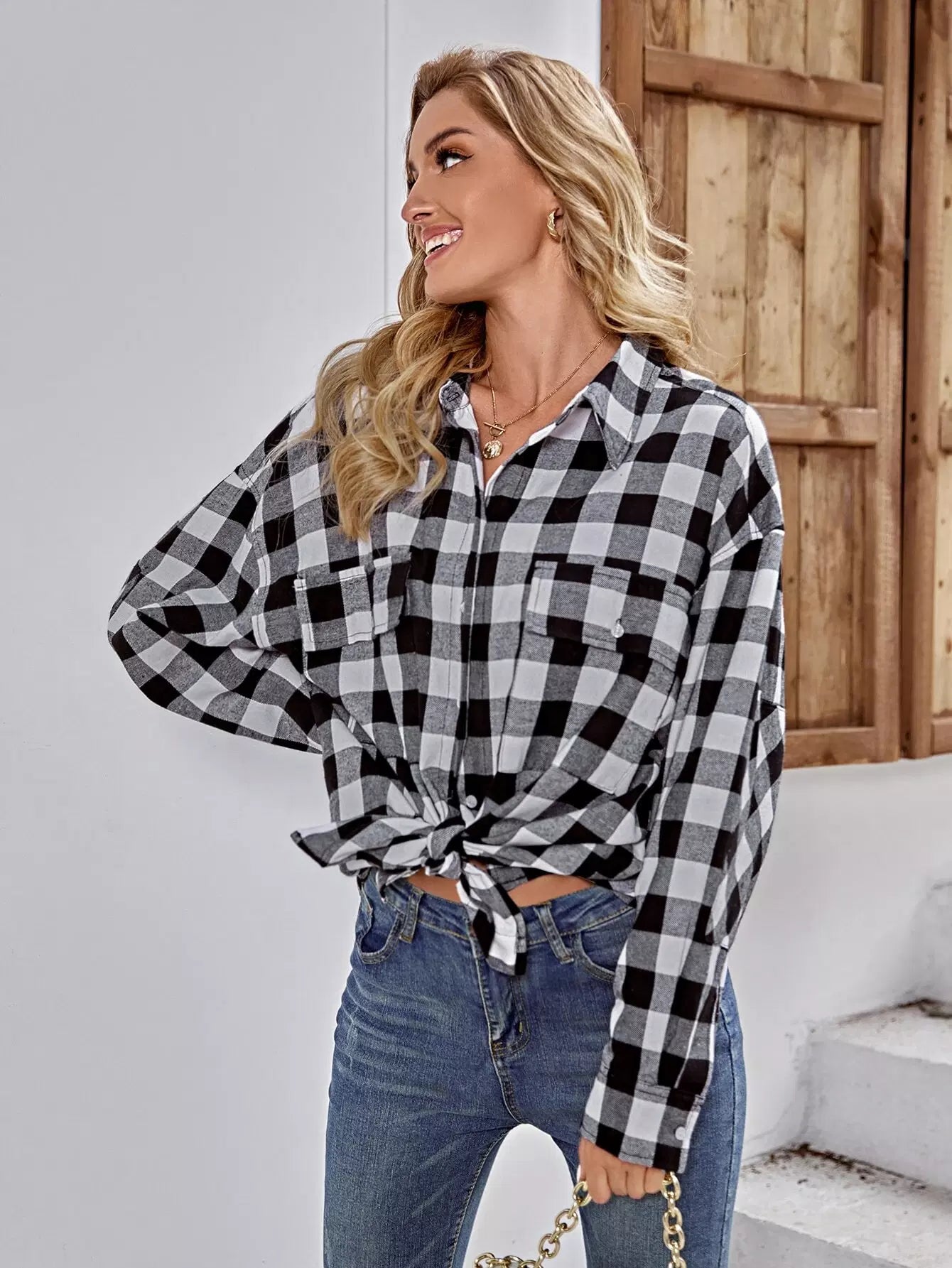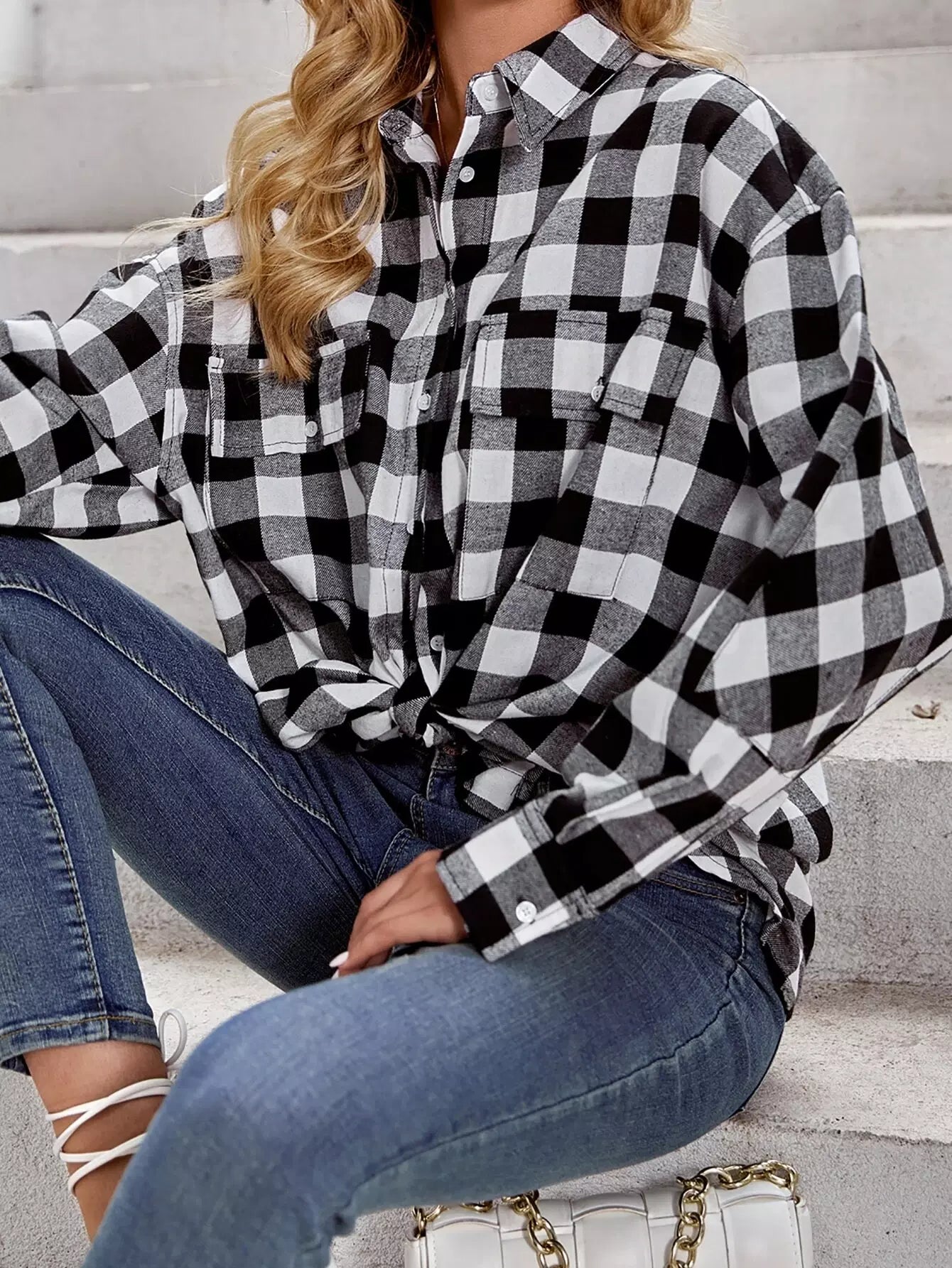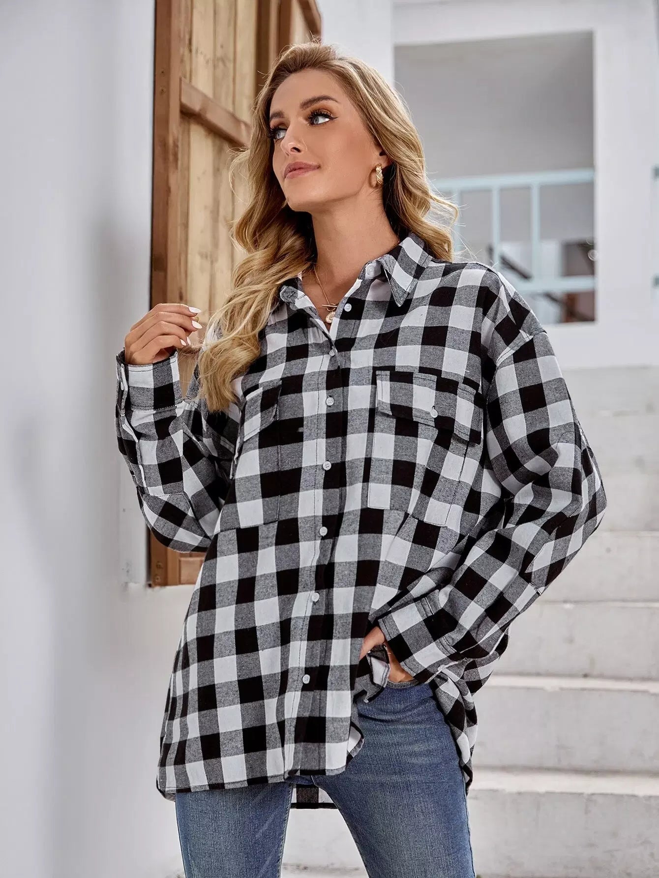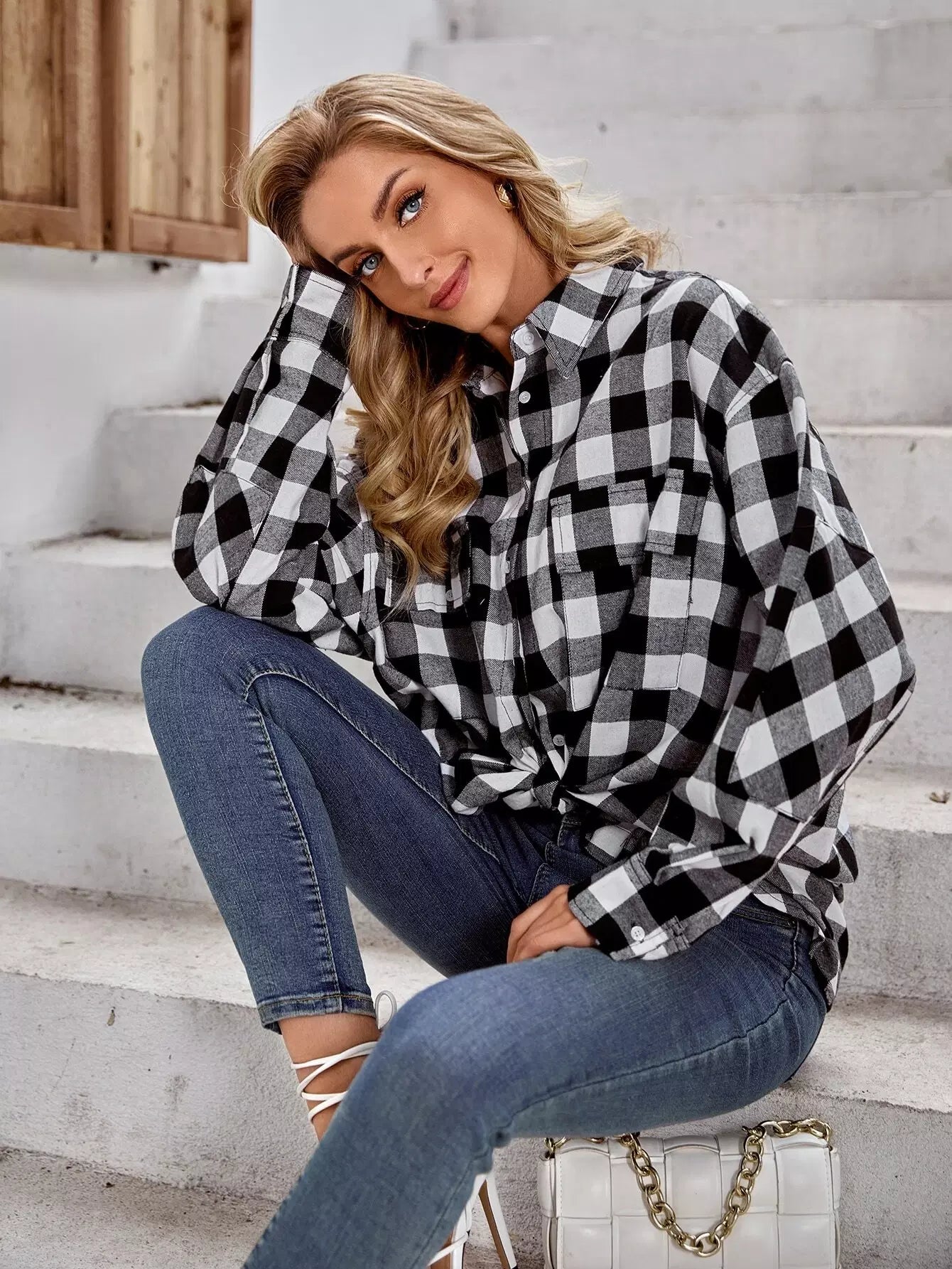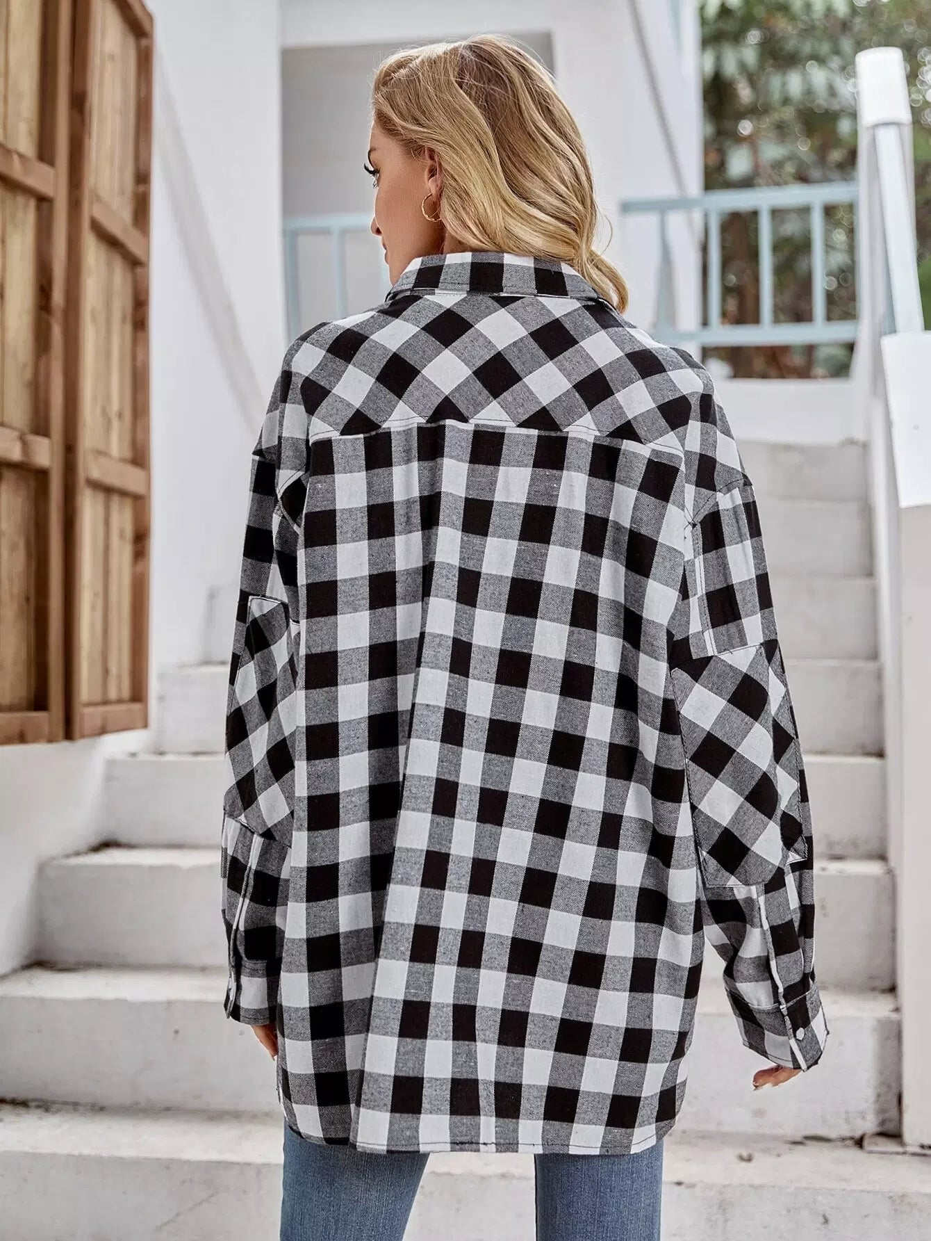 Buffalo Plaid Flap Pocket Oversized Blouse