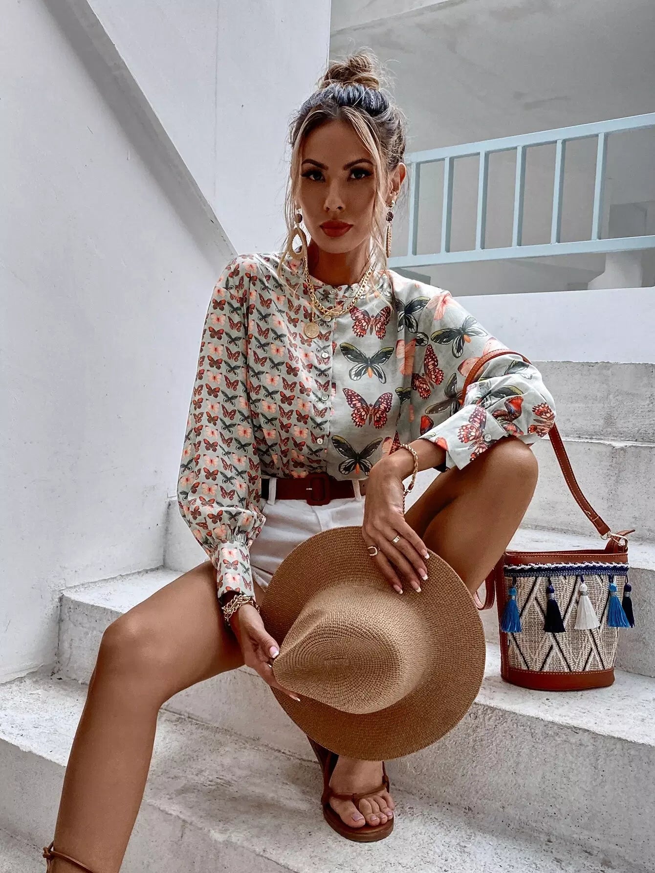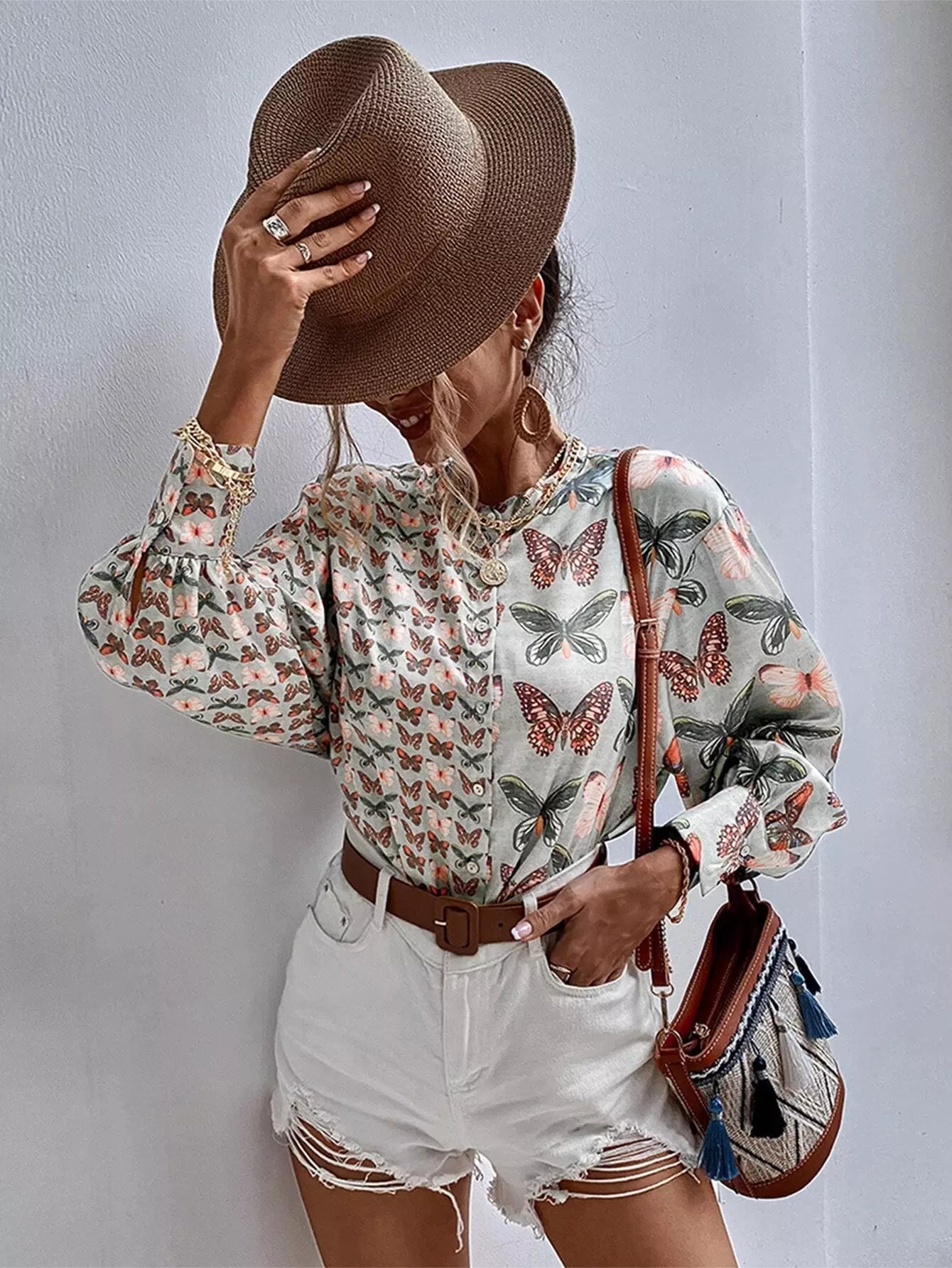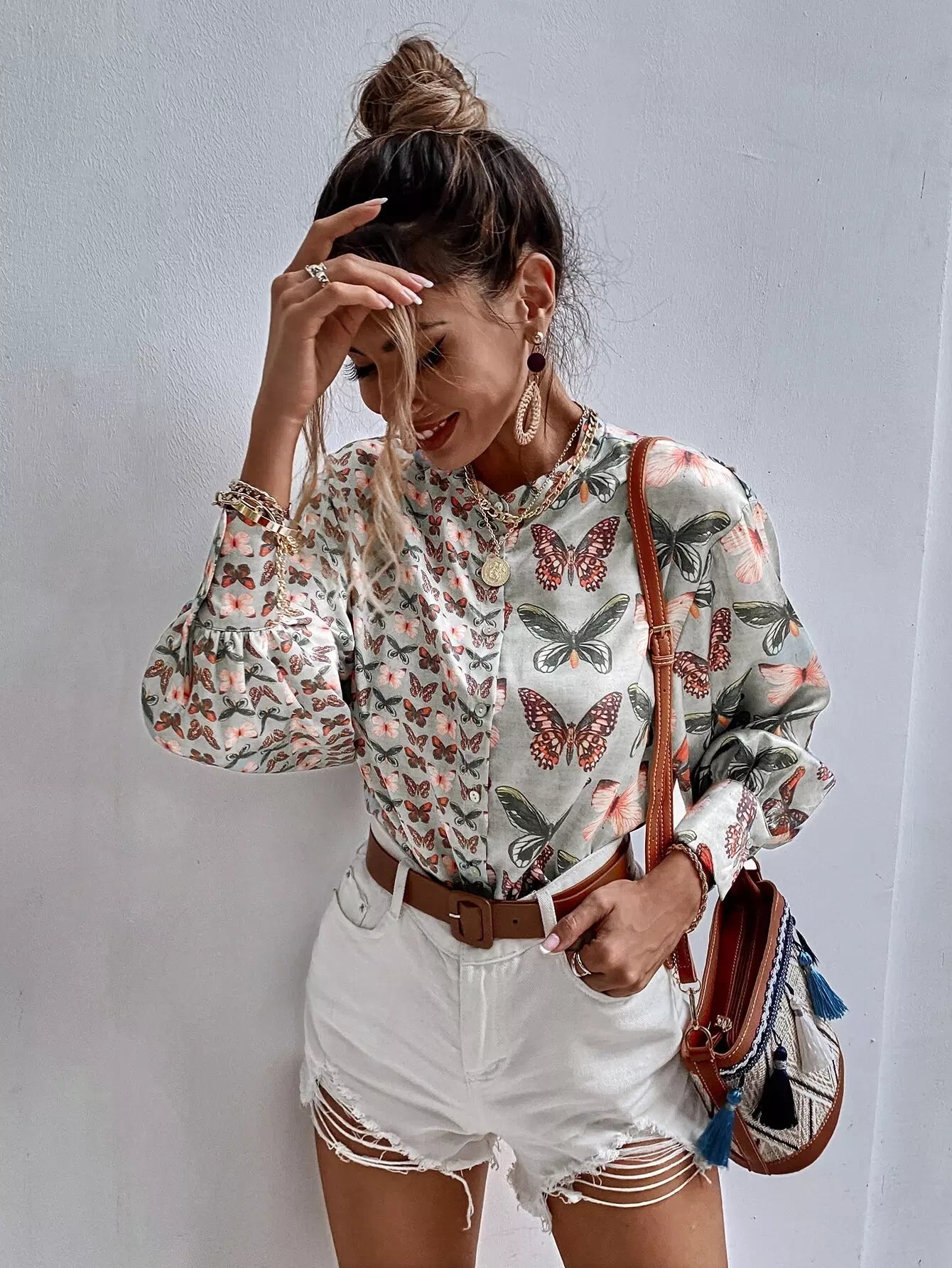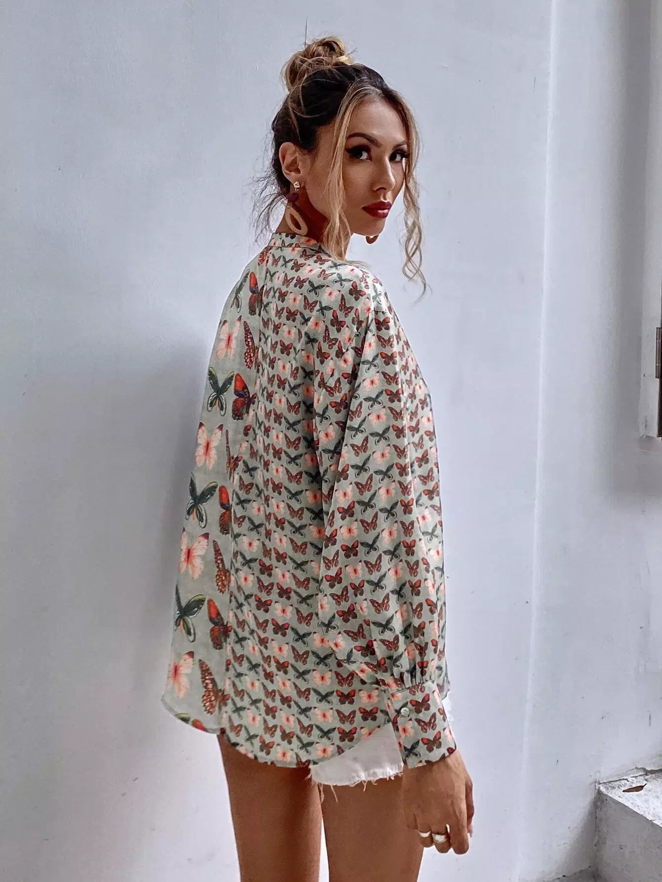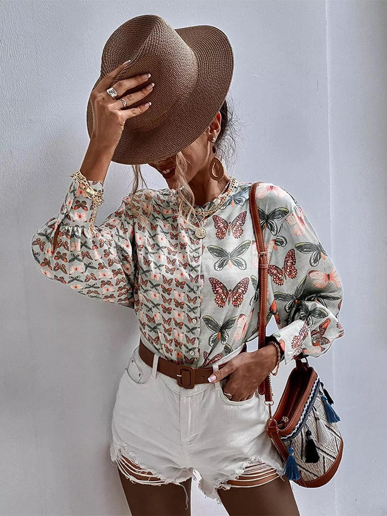 Butterfly Print Button Up Blouse