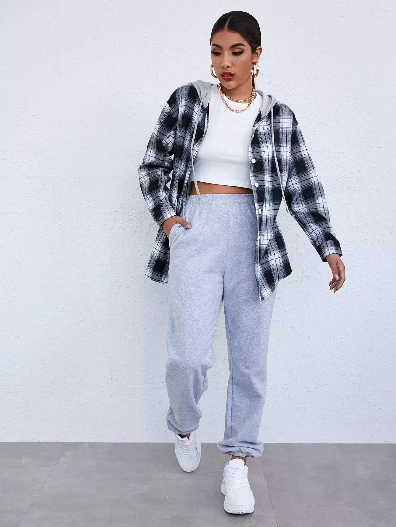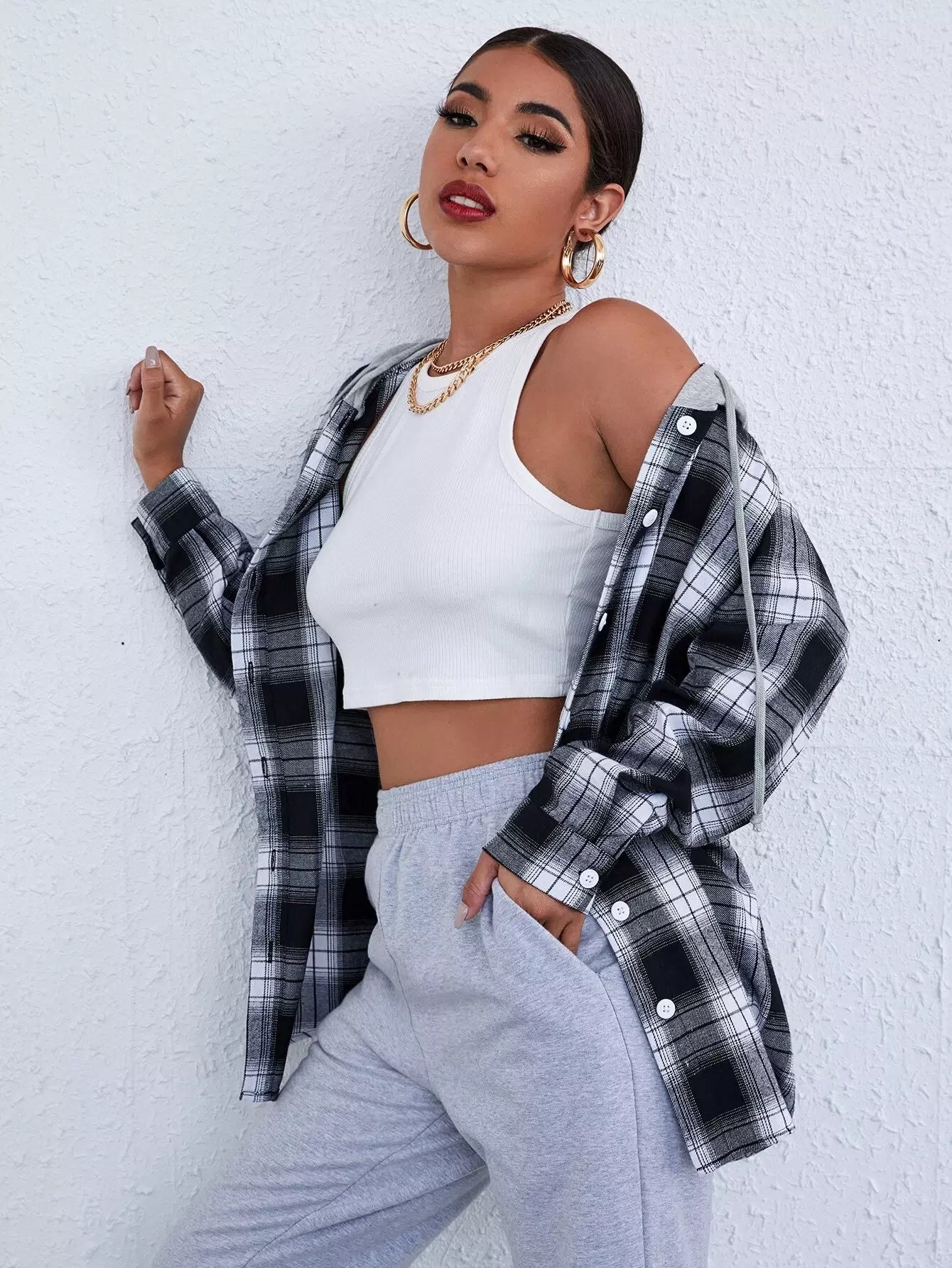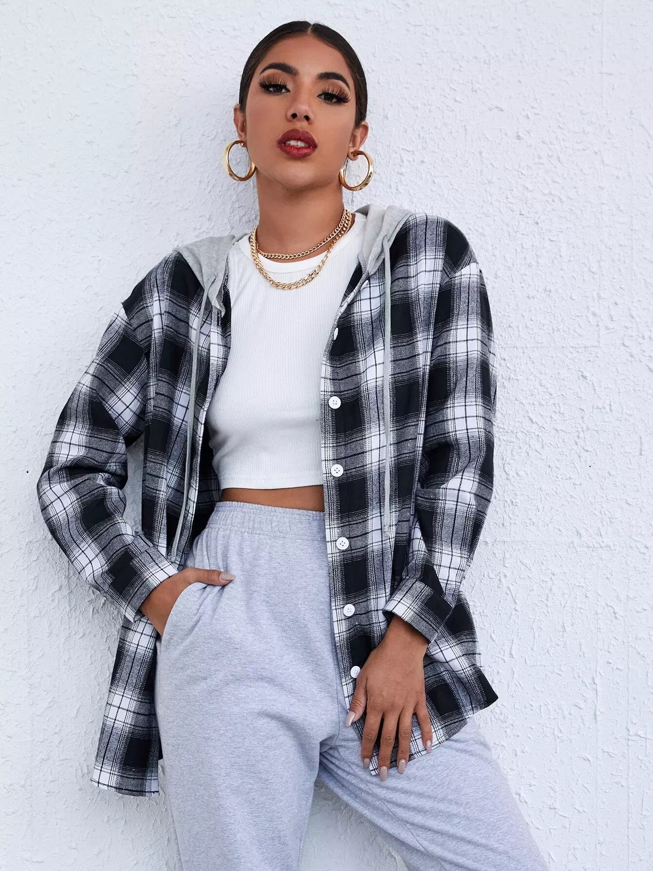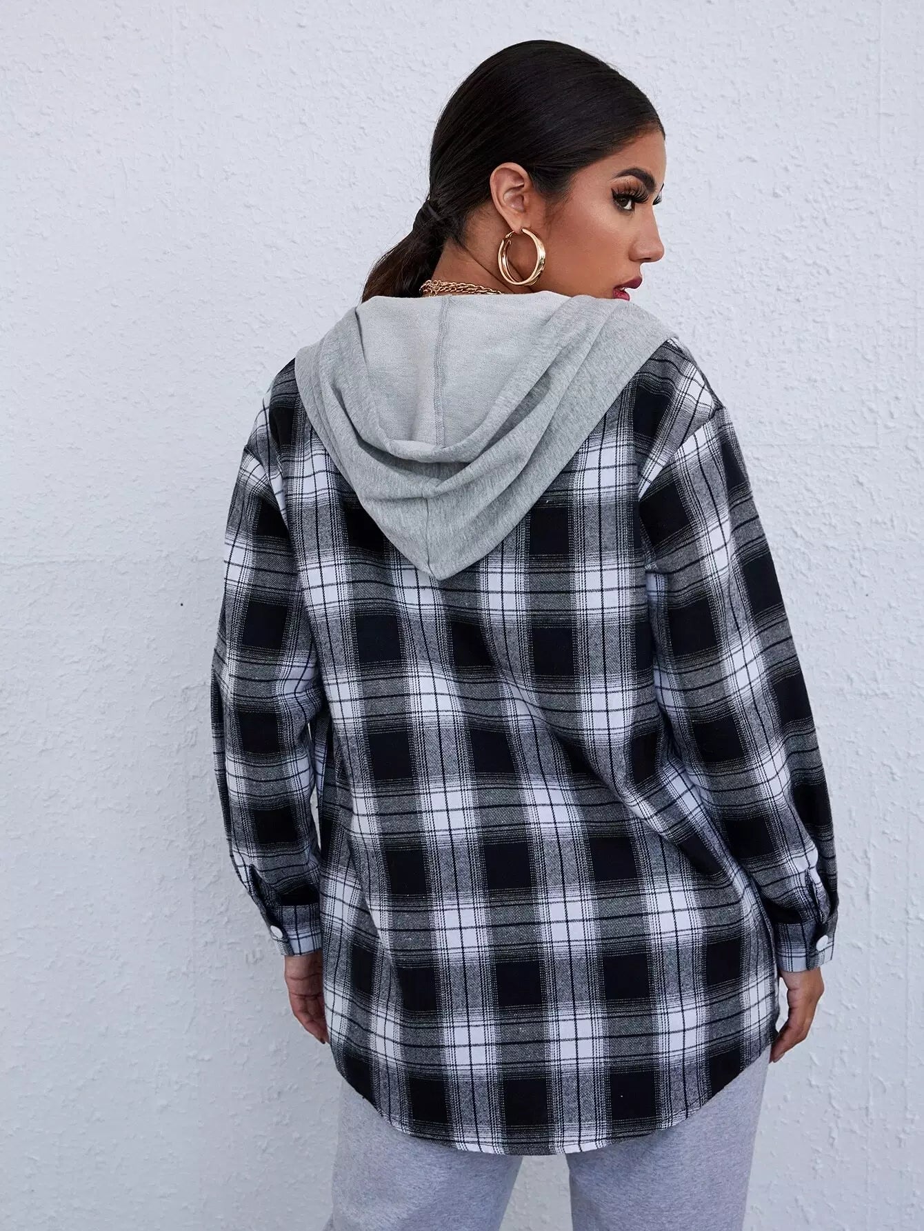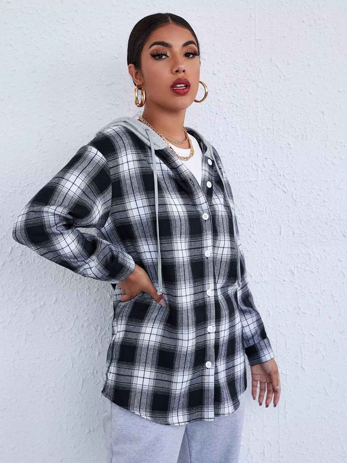 Button Placket Contrast Drawstring Hooded Tartan Blouse