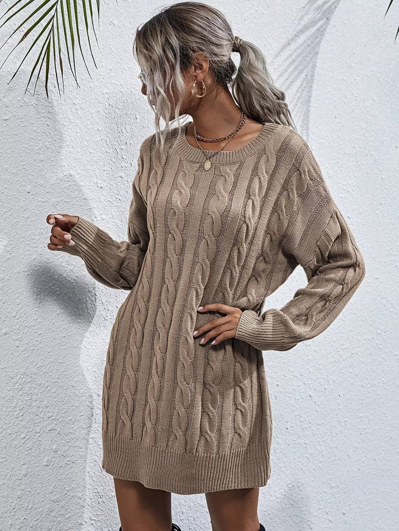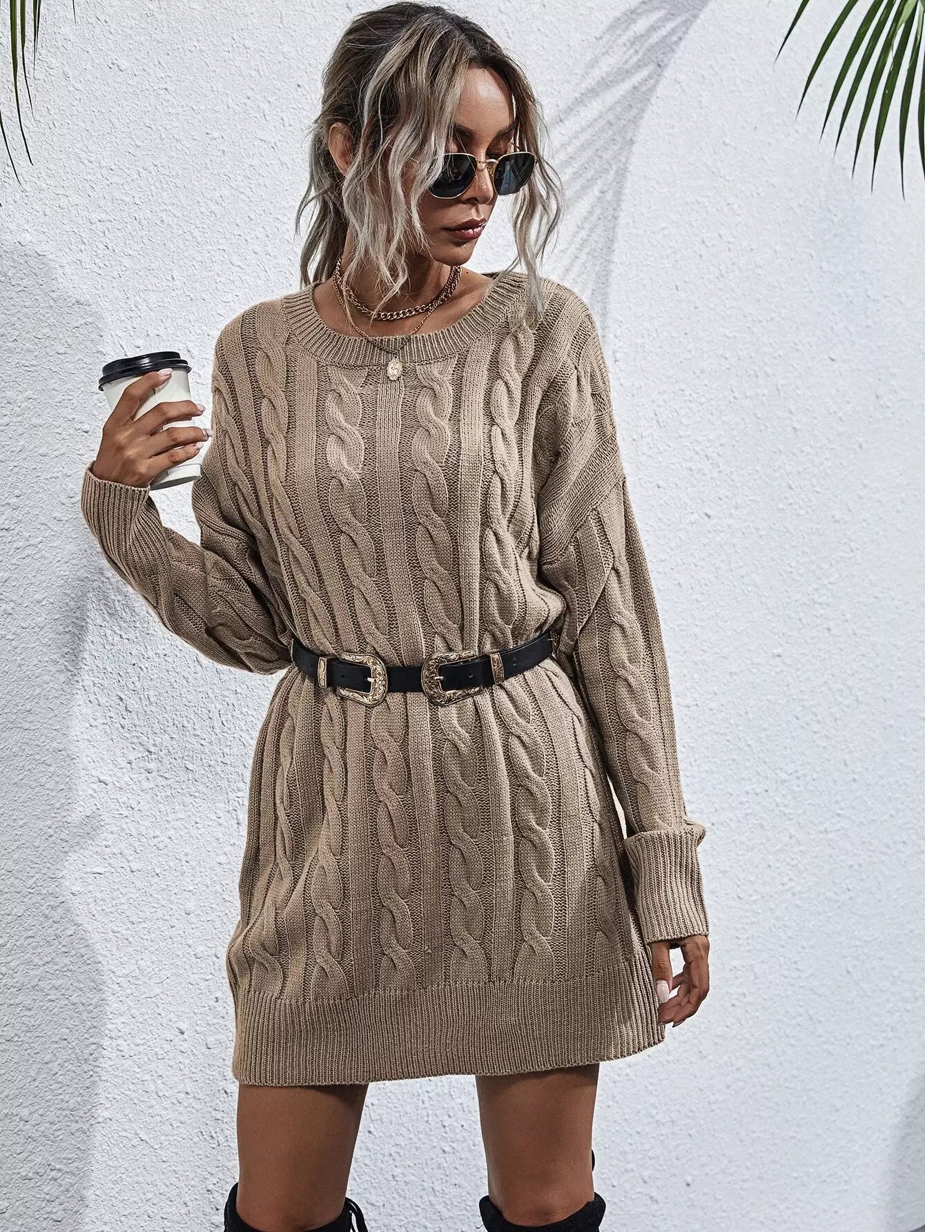Cable Knit Drop Shoulder Sweater Dress Without Belt