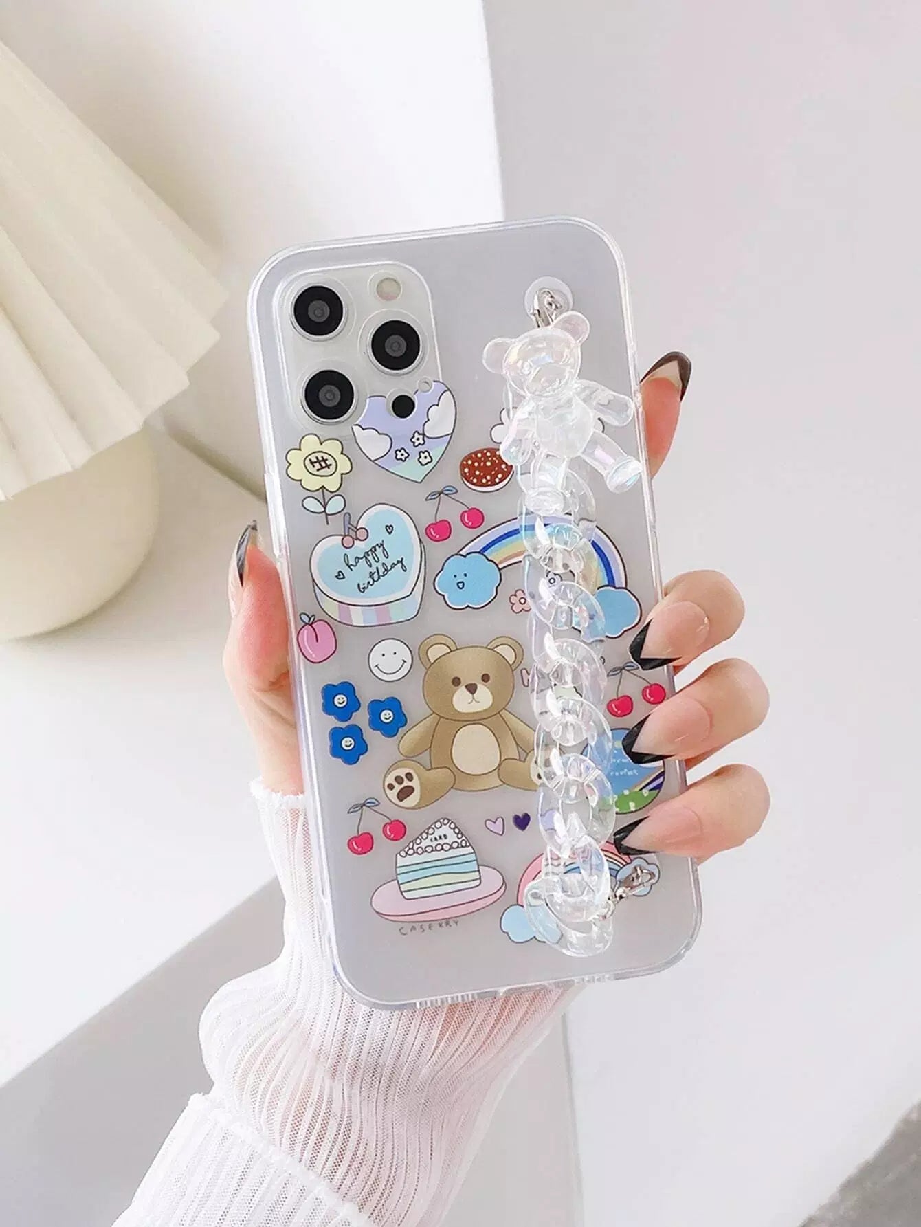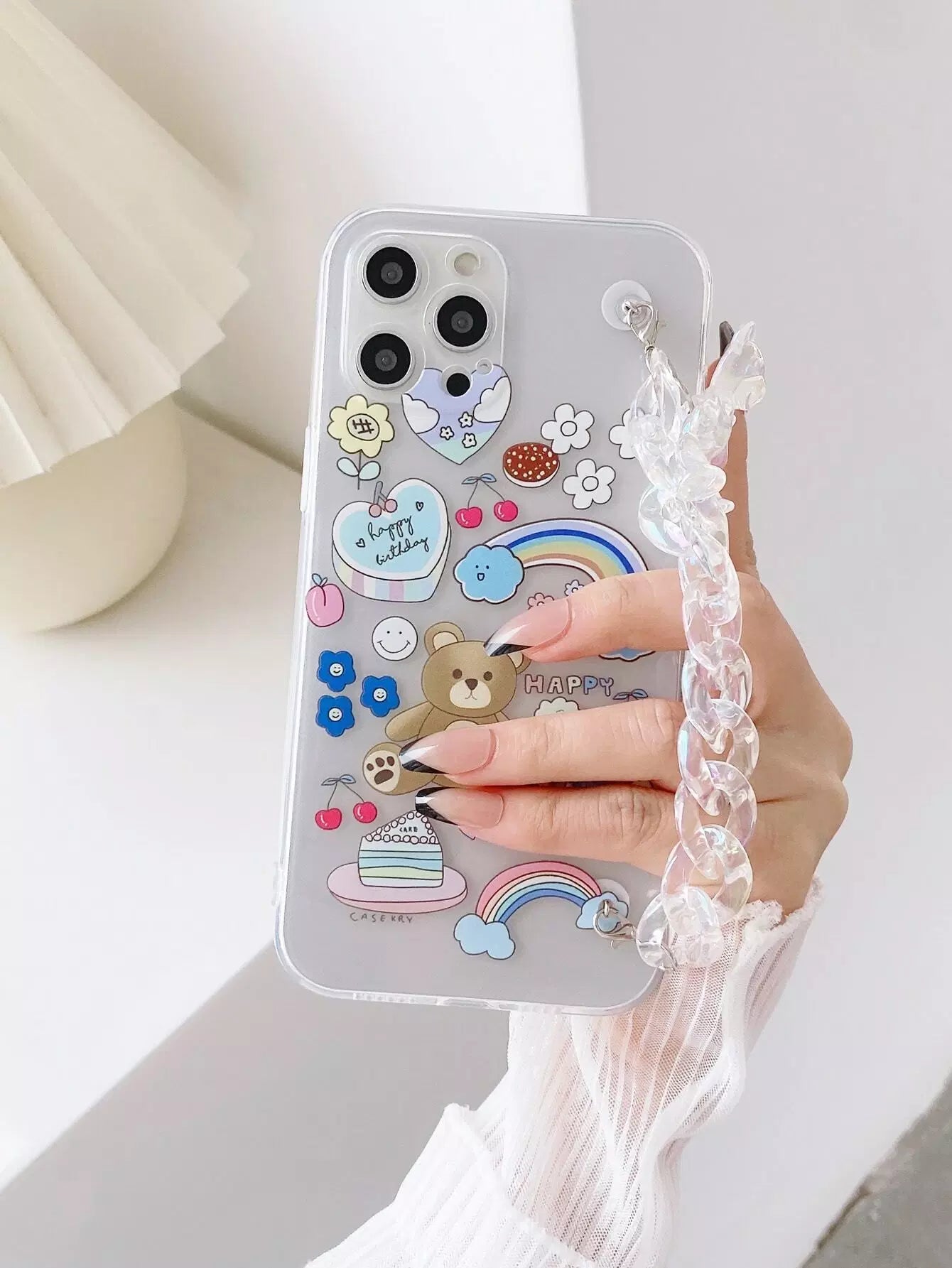 Cartoon Graphic Clear Phone Case With Chain Strap