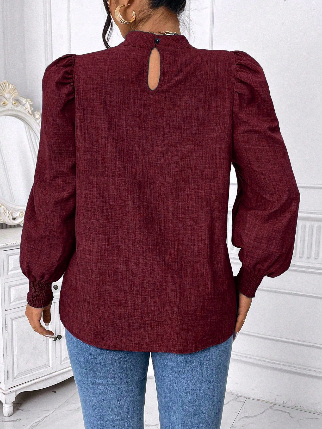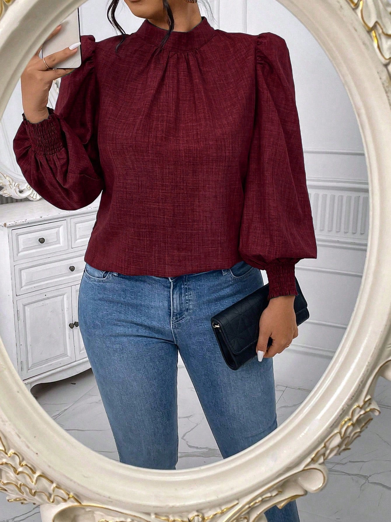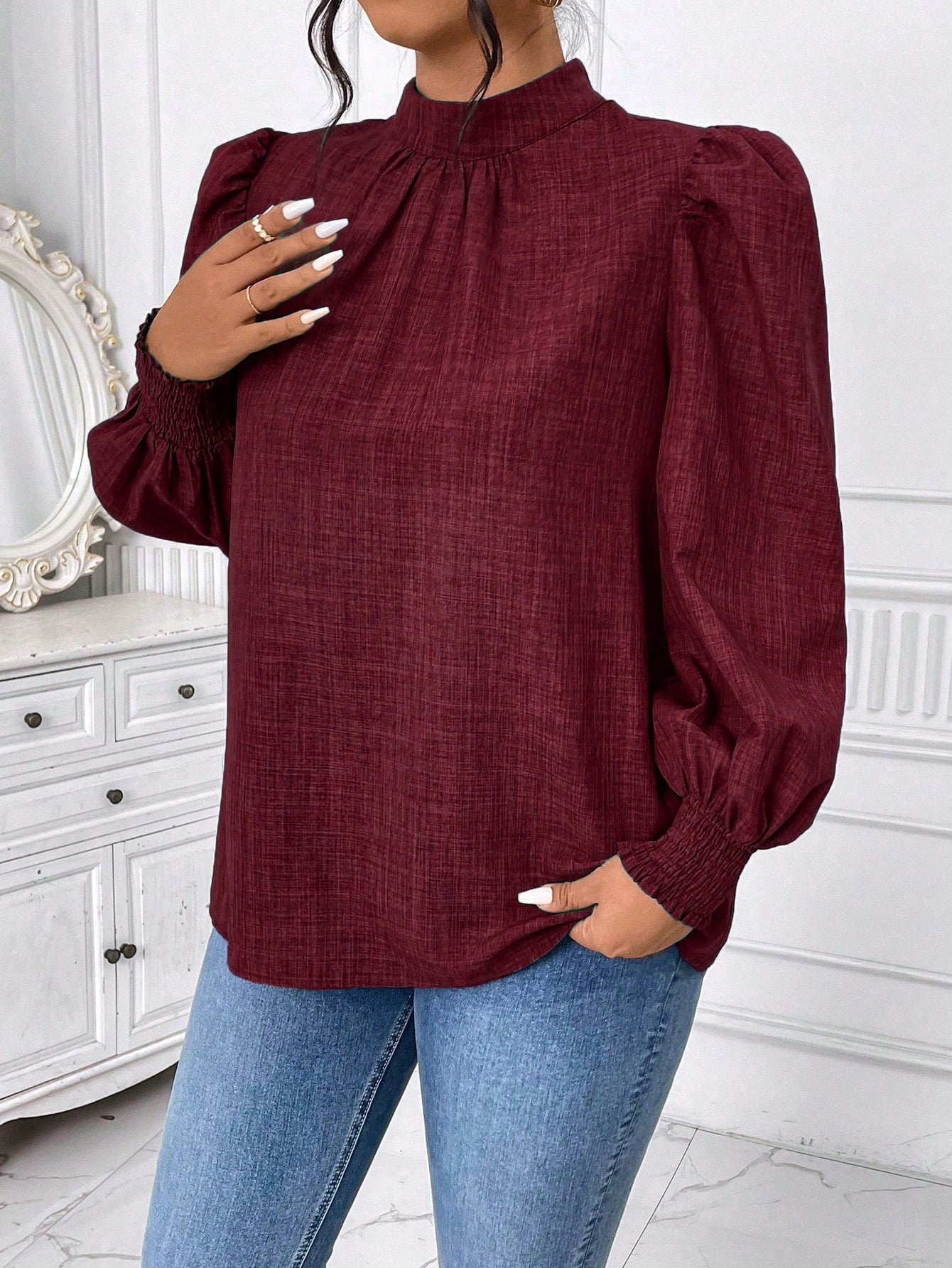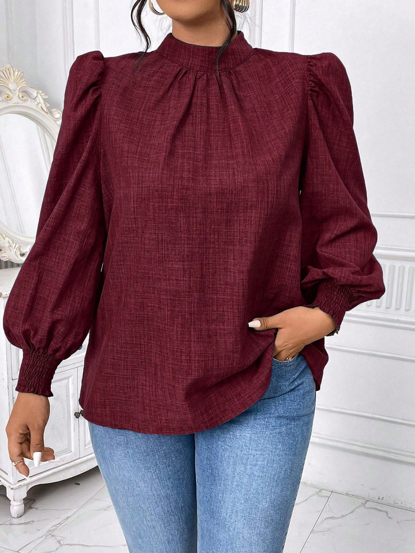 Celure Plus Size Solid Color Stand Collar Lantern Sleeve Casual Blouse, Autumn For New Year Clothes