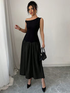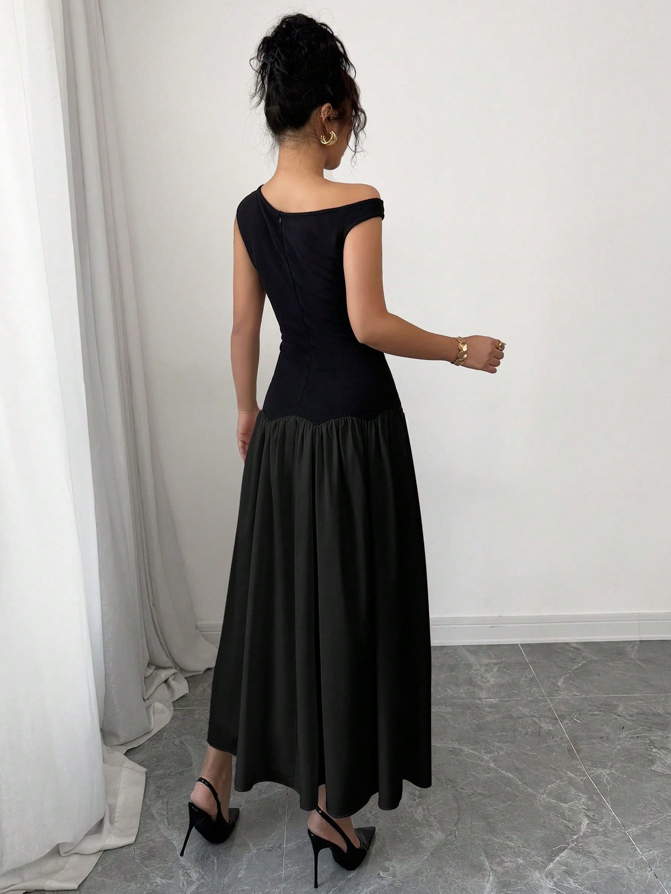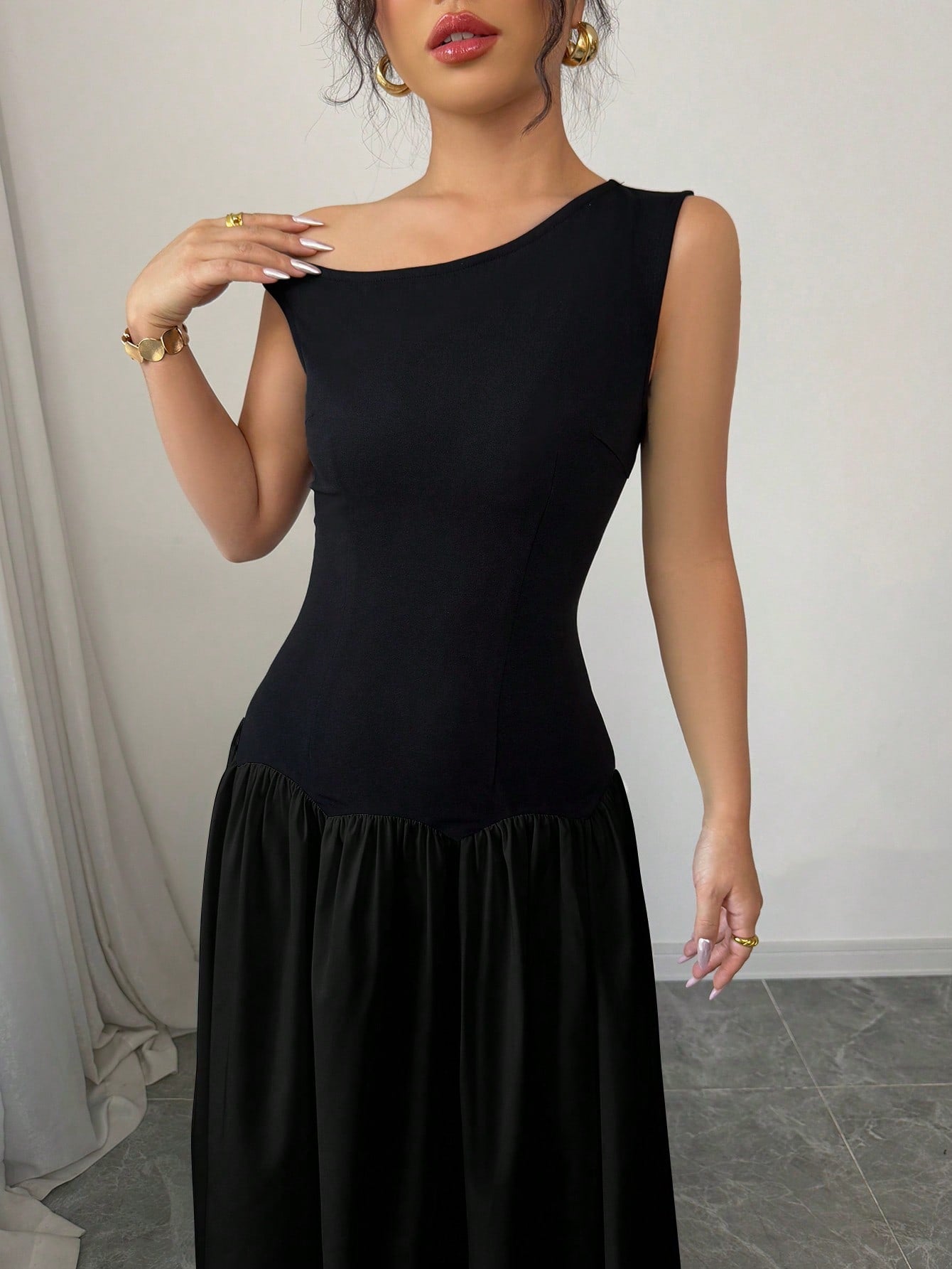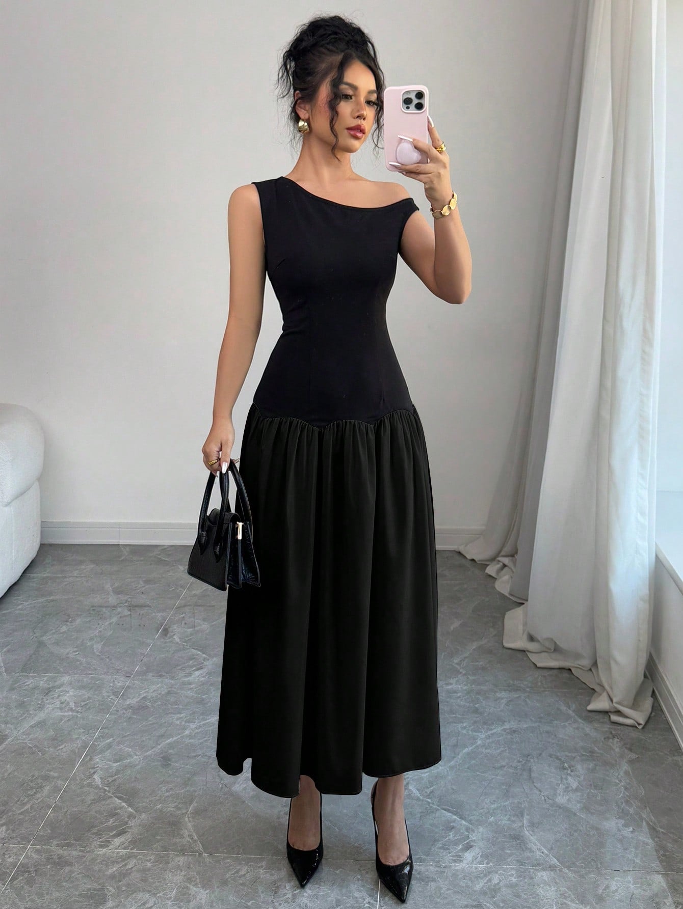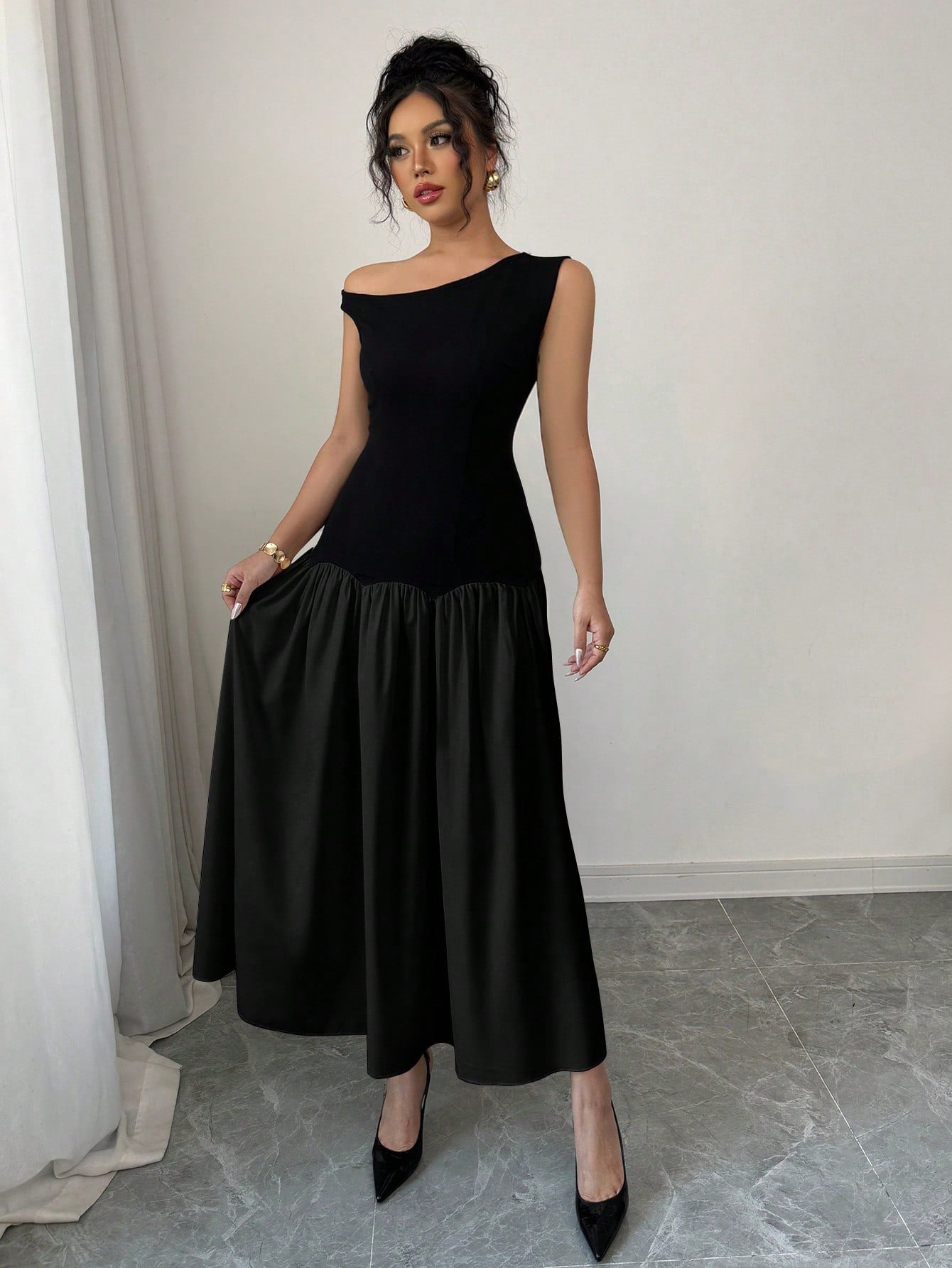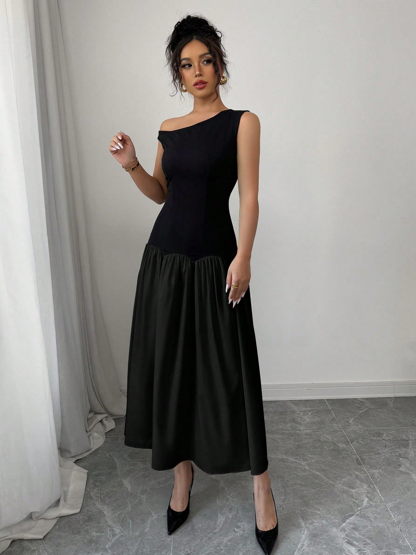 women Chiquease Asymmetrical Shoulder Neckline Sleeveless Spliced Contrast Color Casual Slim Midi Dress For Women Women Dresses Elegant Gown Women Evening Gown Woman Dress