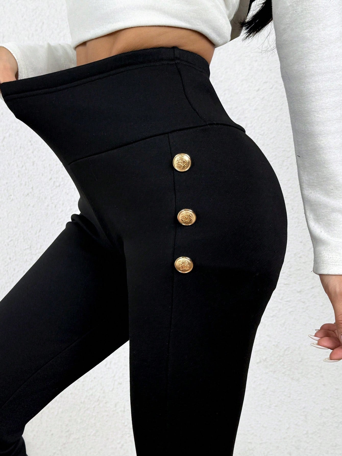 Chiquease Women's Solid Color Velvet Thicken High Waist Skinny Pants With Metal Button Decor