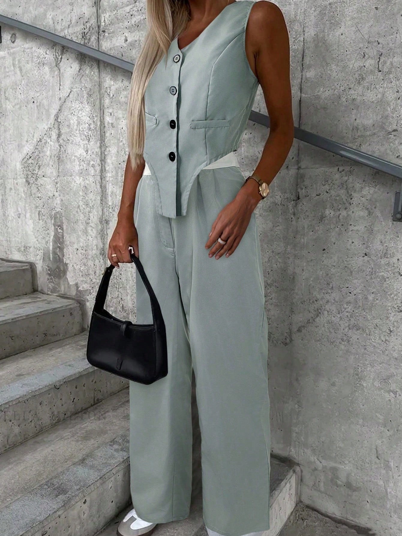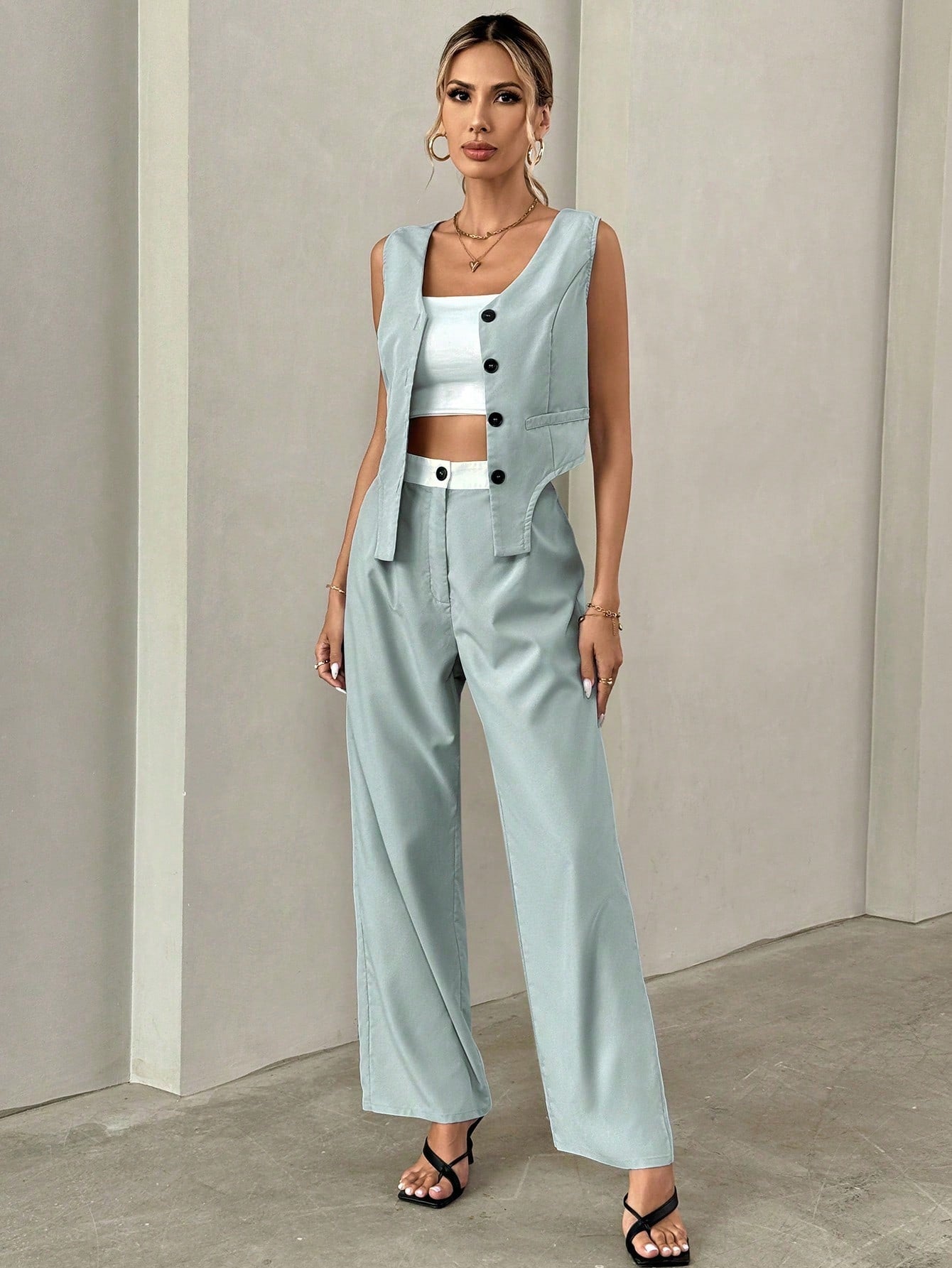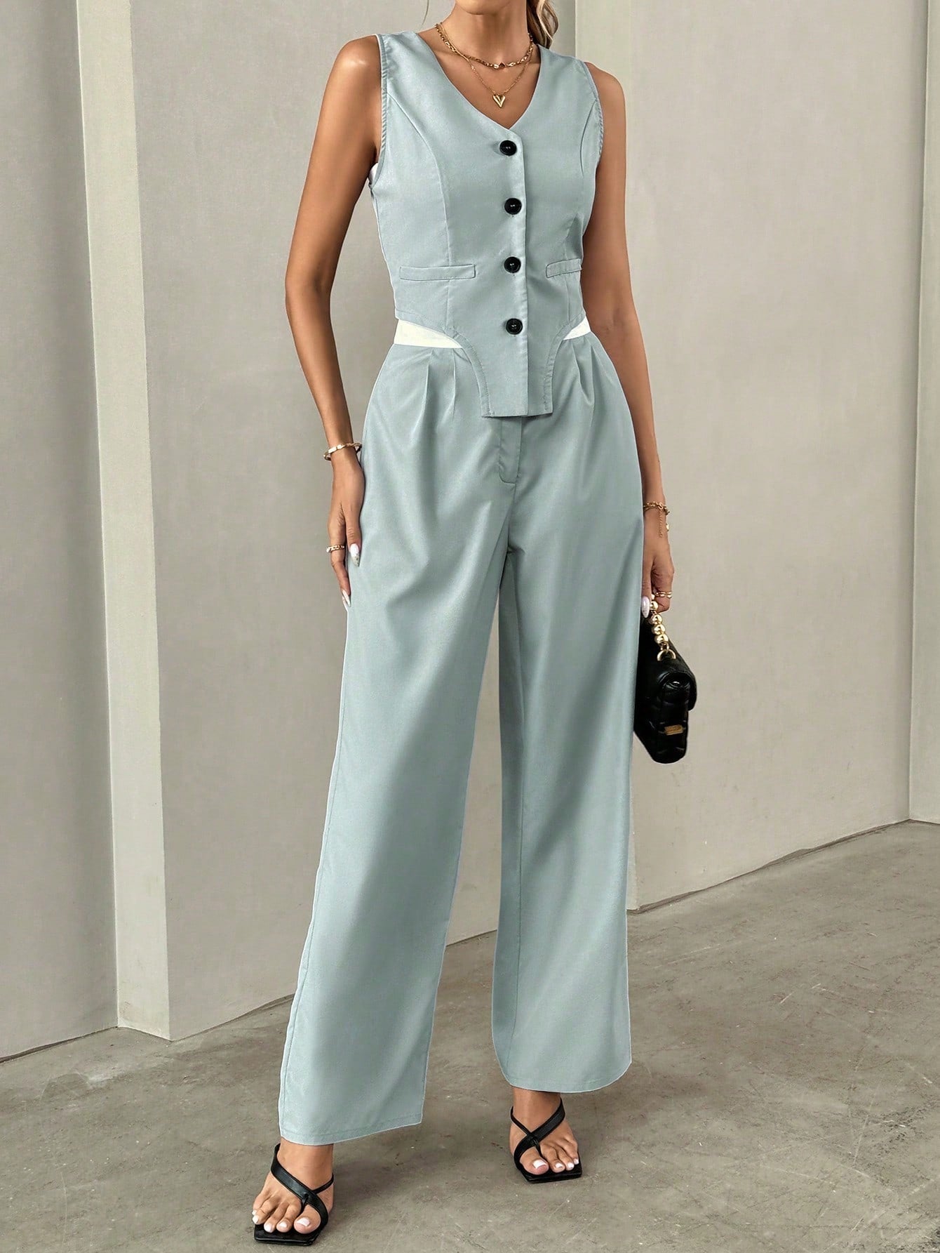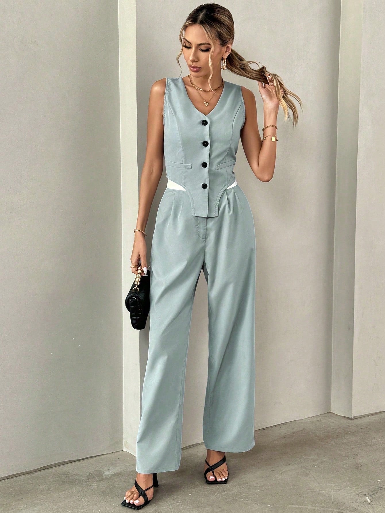 Clasi Front Button V-Neck Asymmetric Hem Sleeveless Suit Jacket And Contrast-Color Suit Pants Elegant