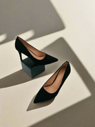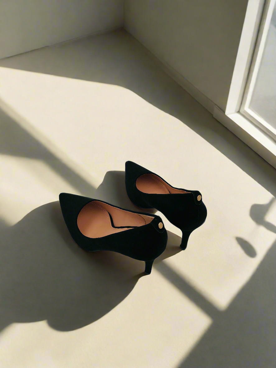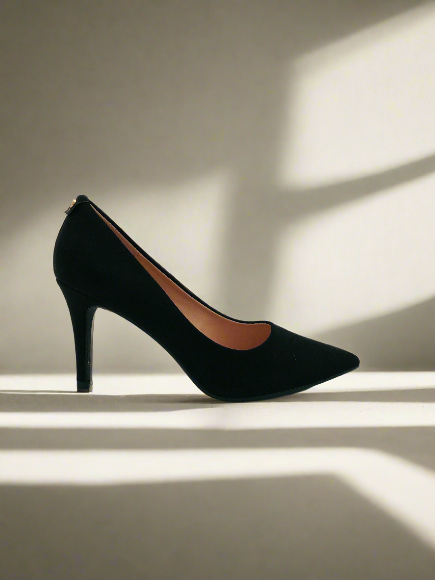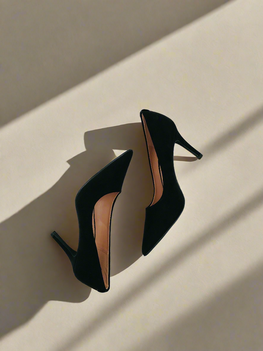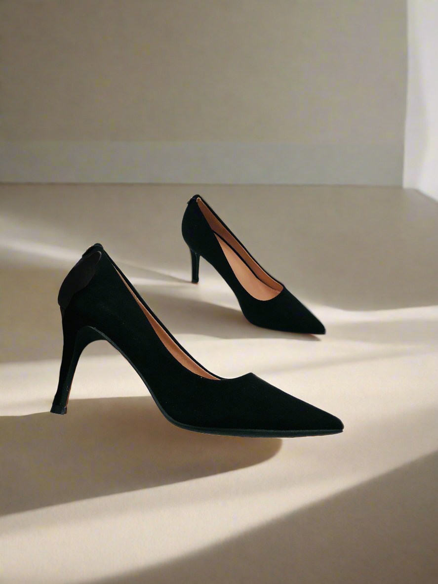 Classic black pumps with a pointed toe and a sleek silhouette, perfect for elevating any evening ensemble.