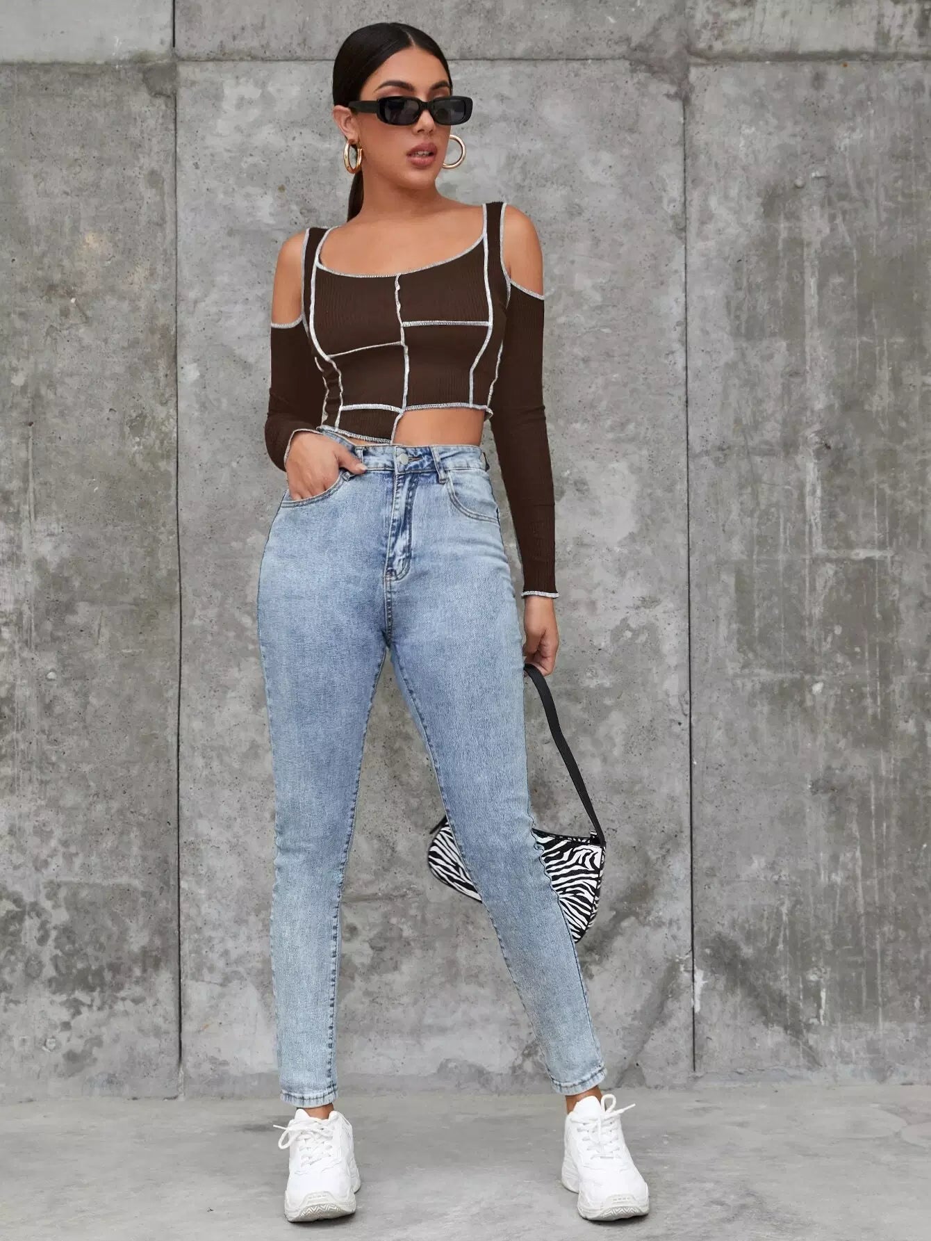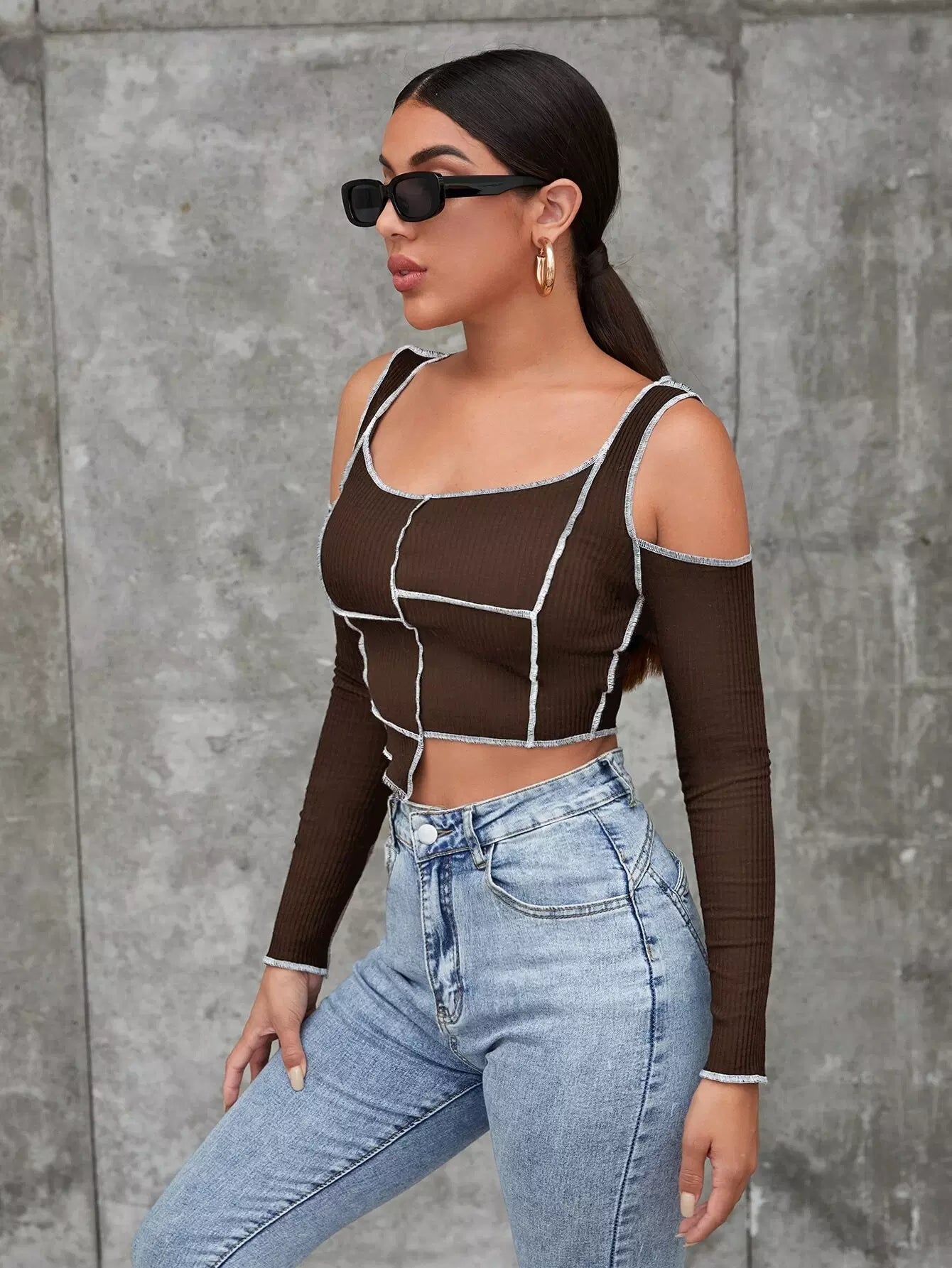 Cold Shoulder Asymmetrical Hem Contrast Stitch Top