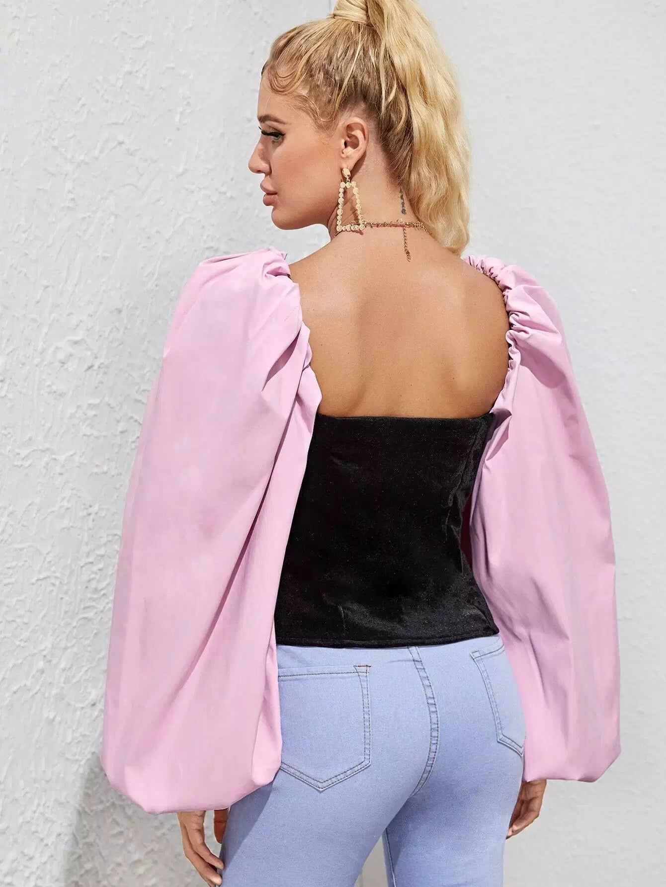 Colorblock Bishop Sleeve Sweetheart Neck Blouse