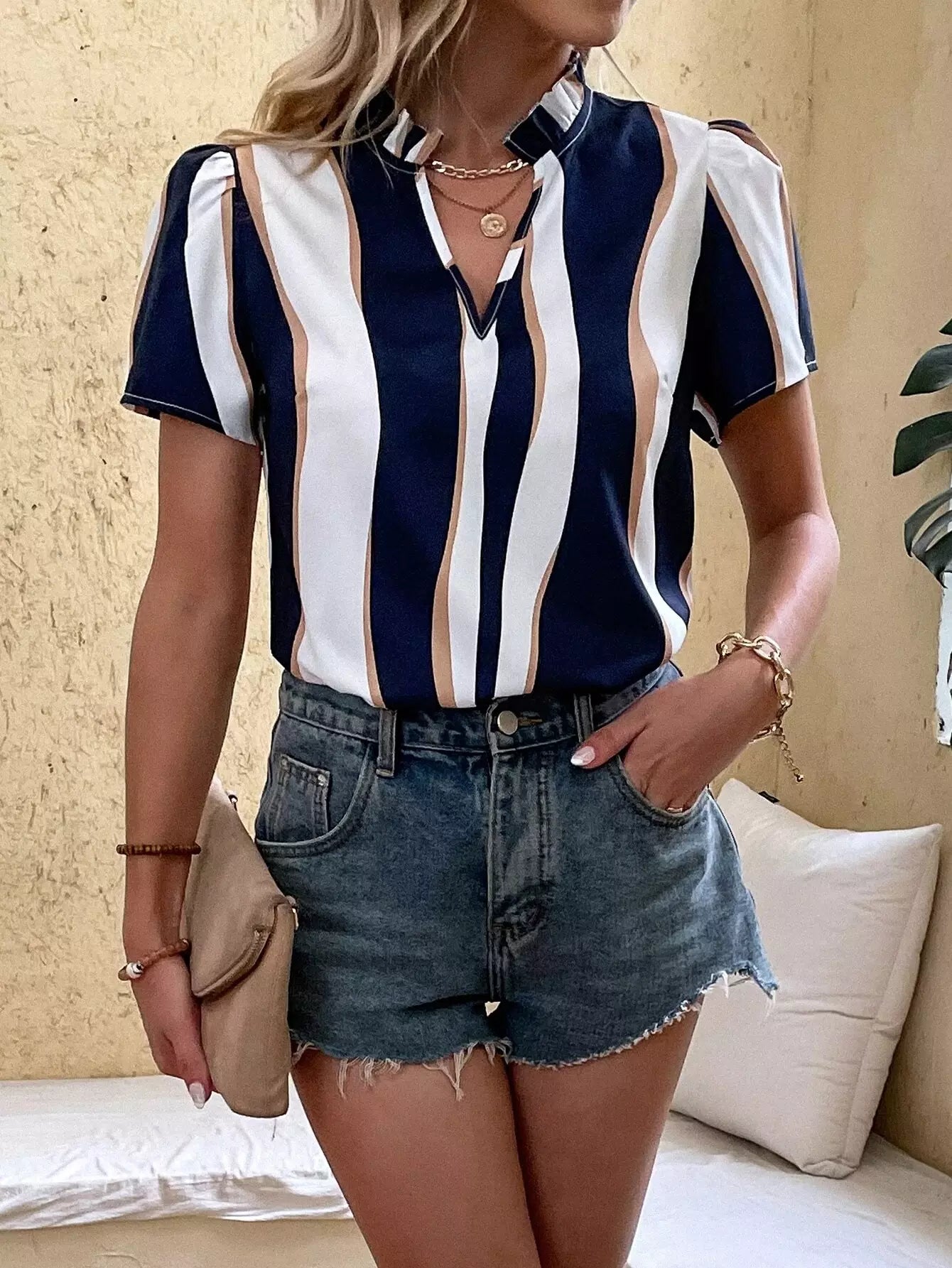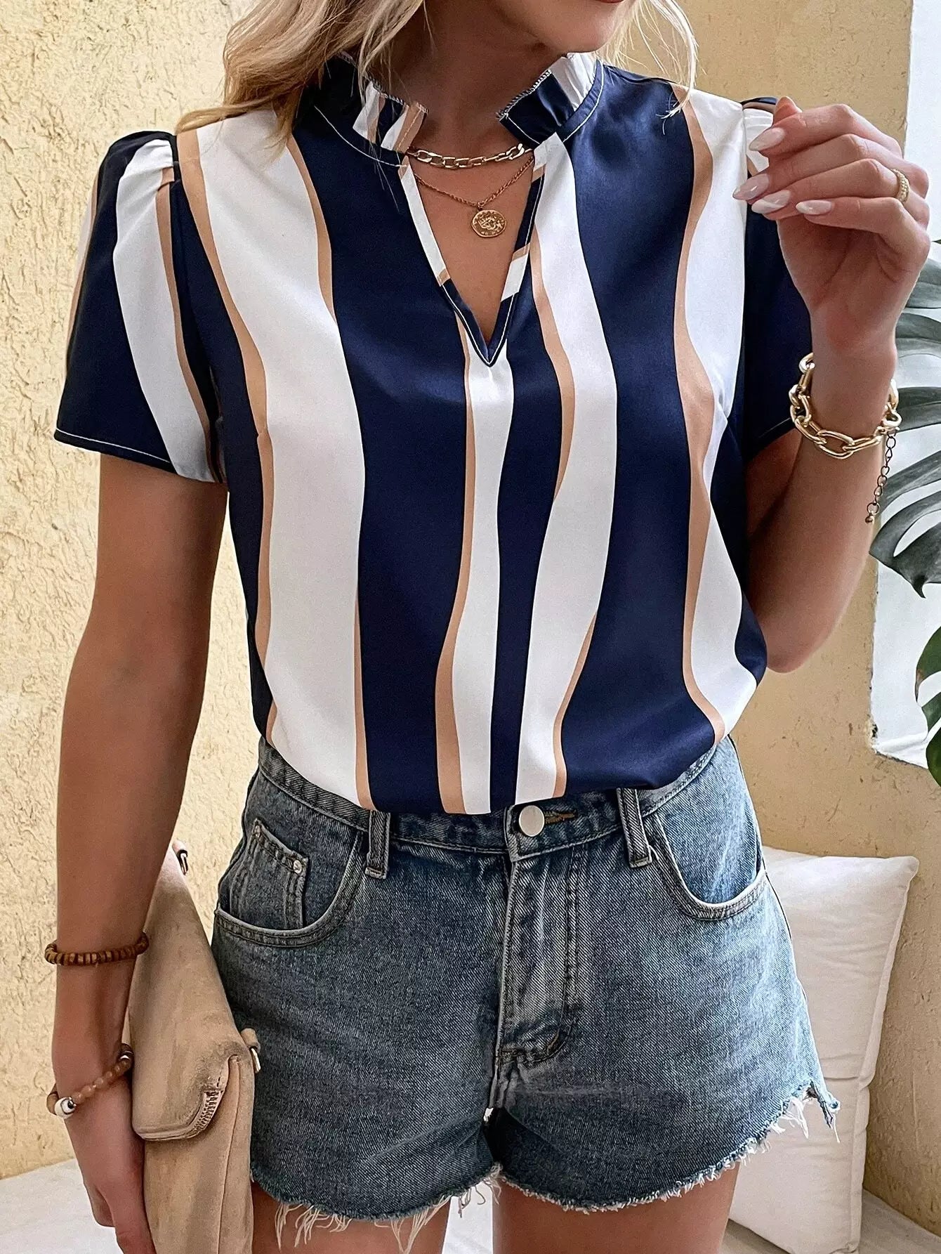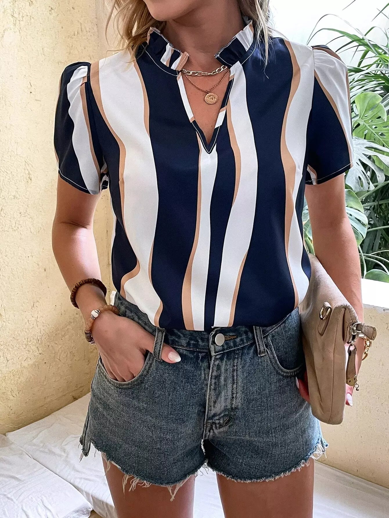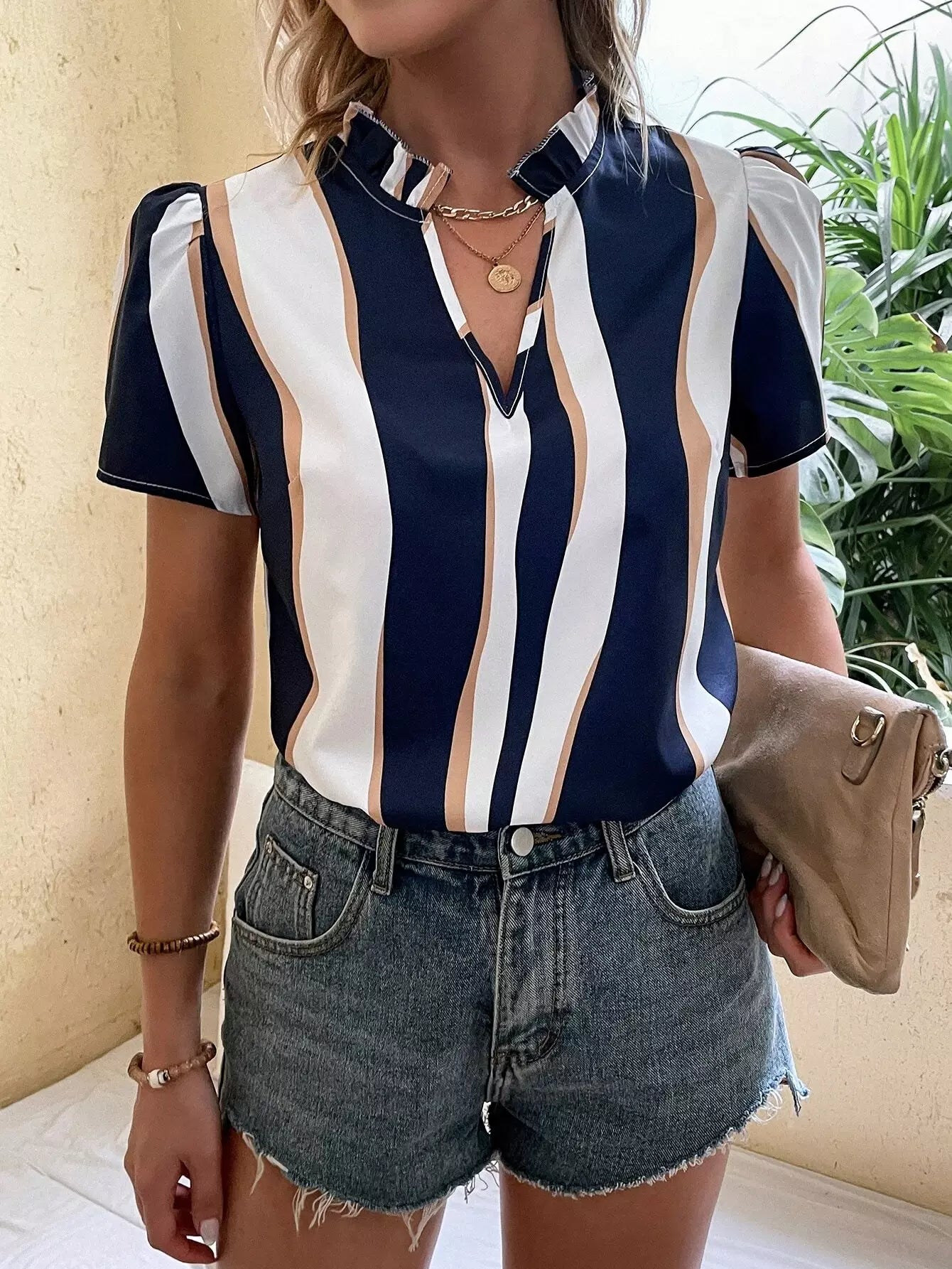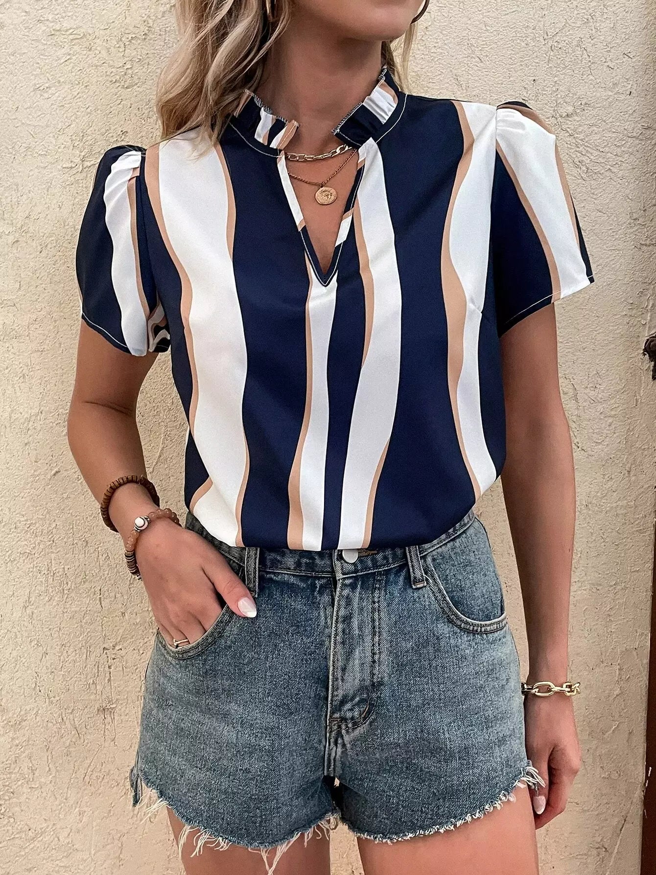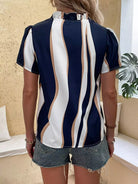 Colorblock Puff Sleeve Frilled Popover Blouse