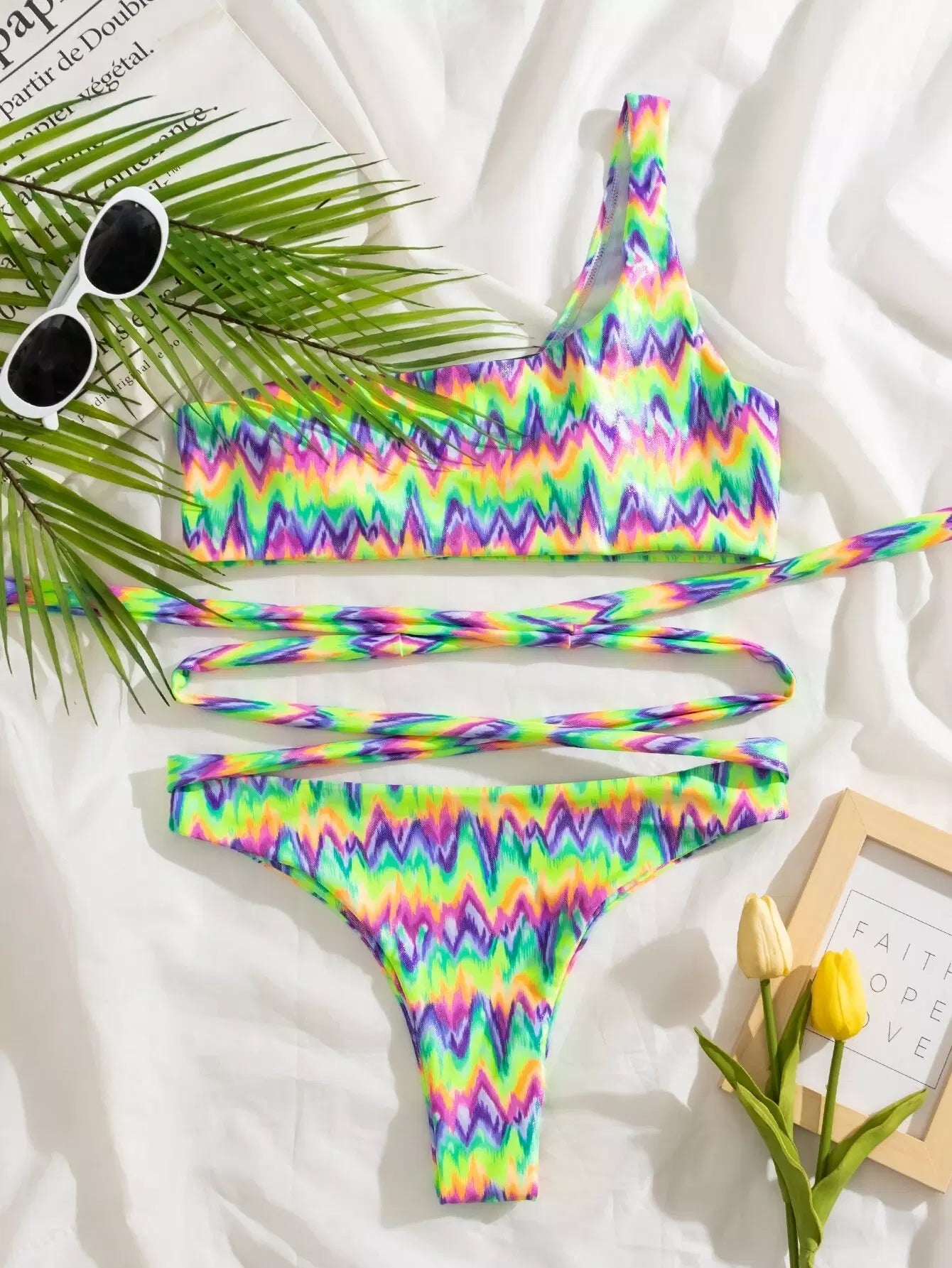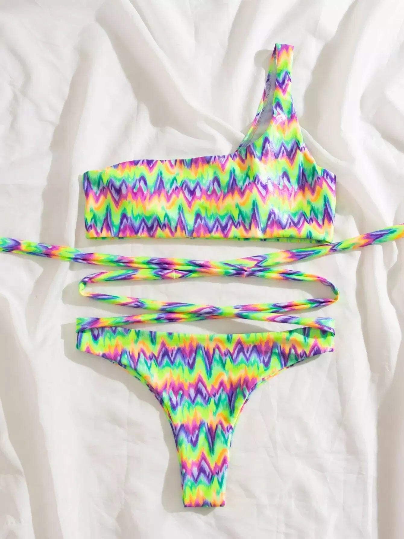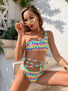 Colorful Wave Print One Shoulder Bikini Swimsuit