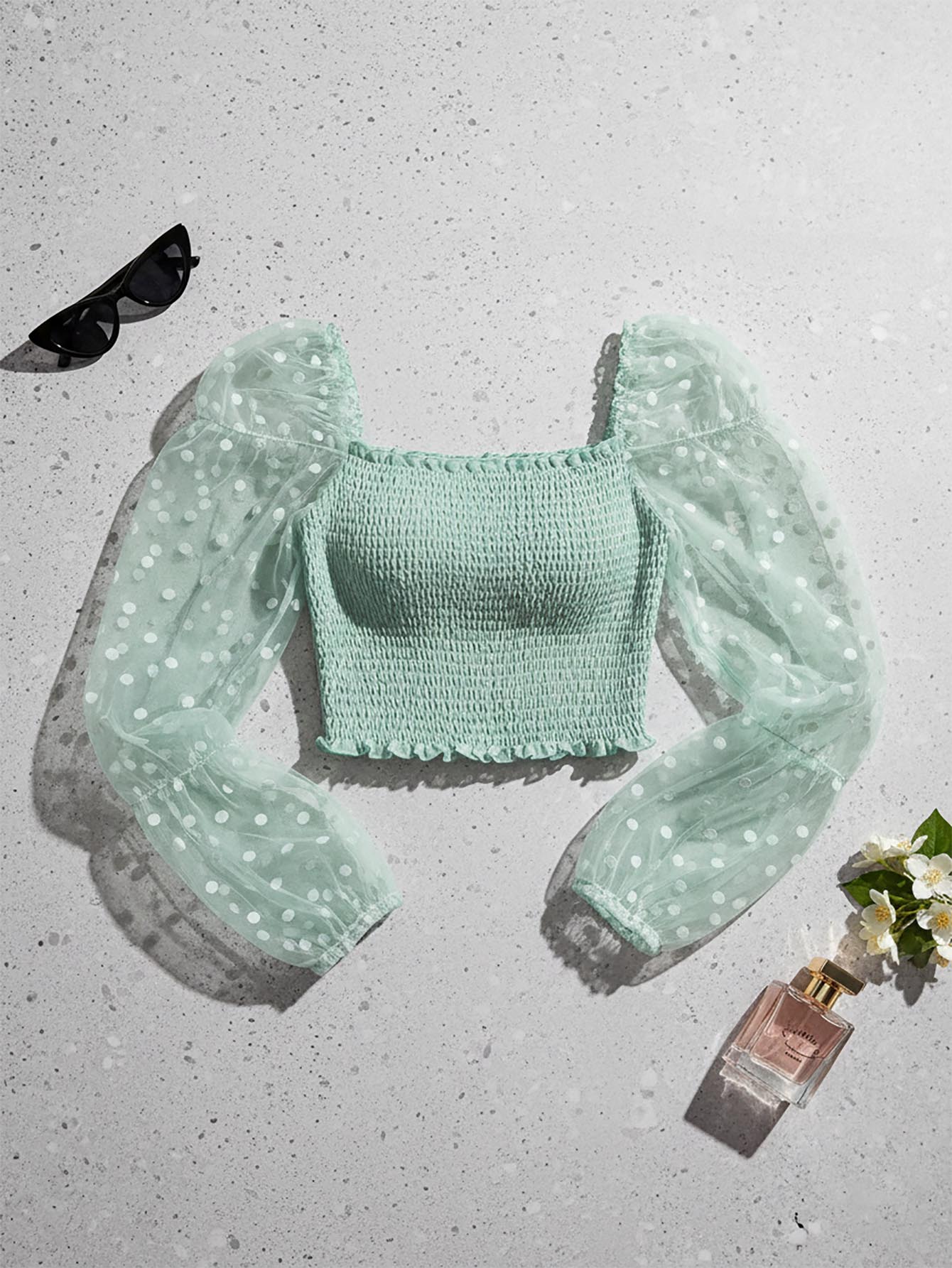 Contrast Dobby Mesh Sleeve Shirred Frill Top