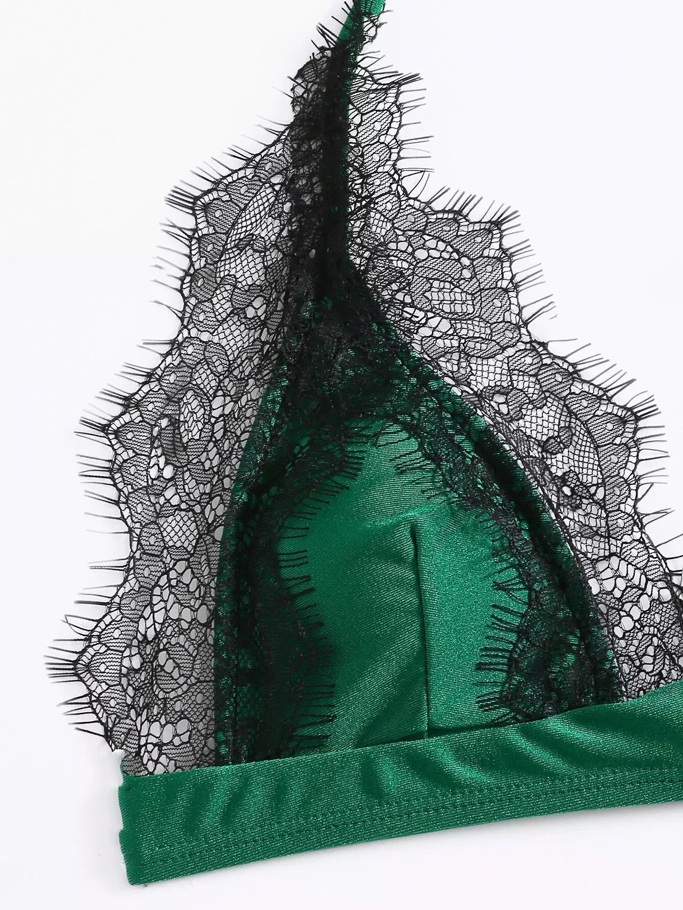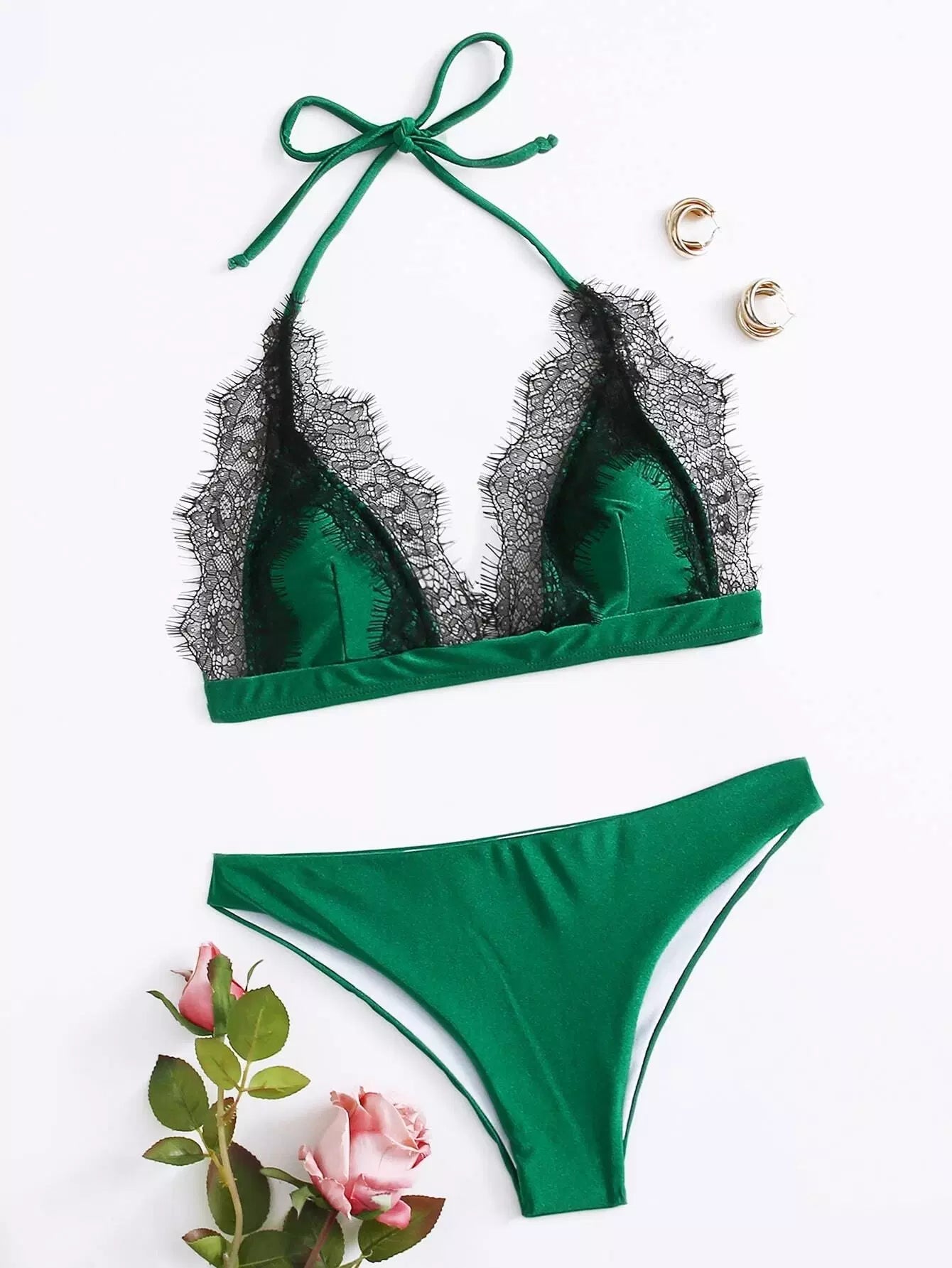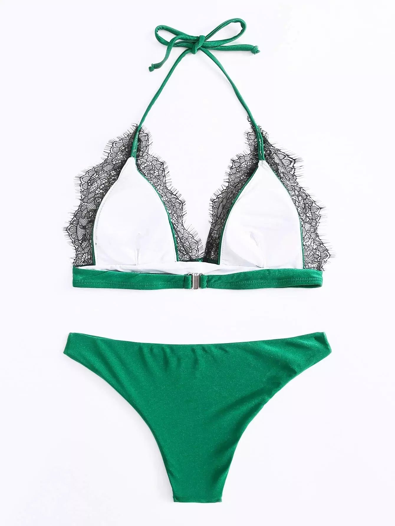 Contrast Lace Triangle Halter Bikini Swimsuit