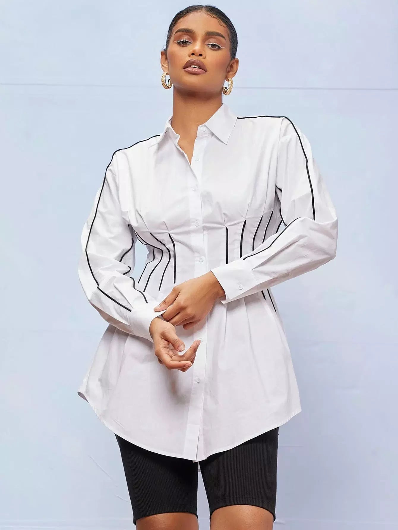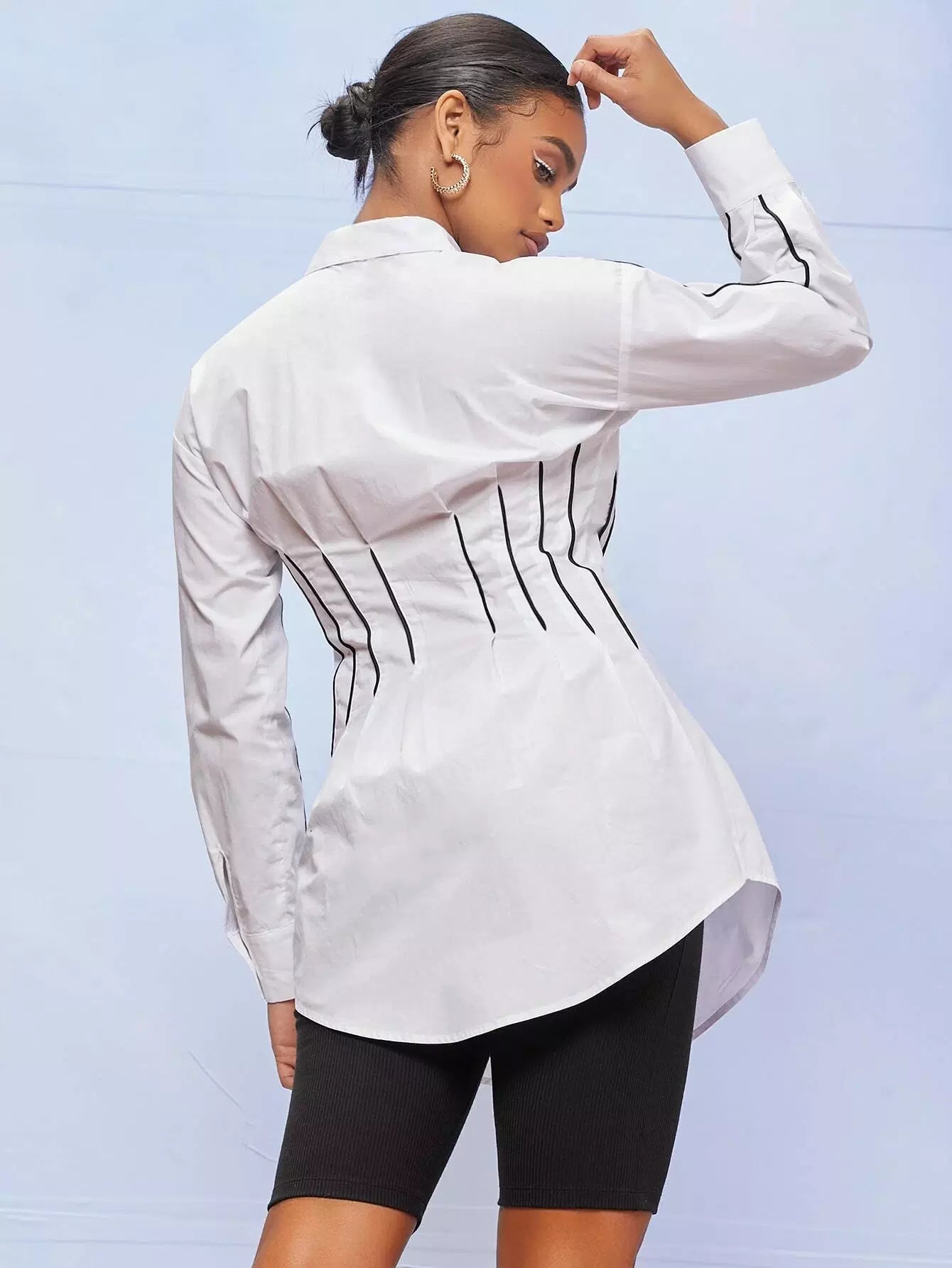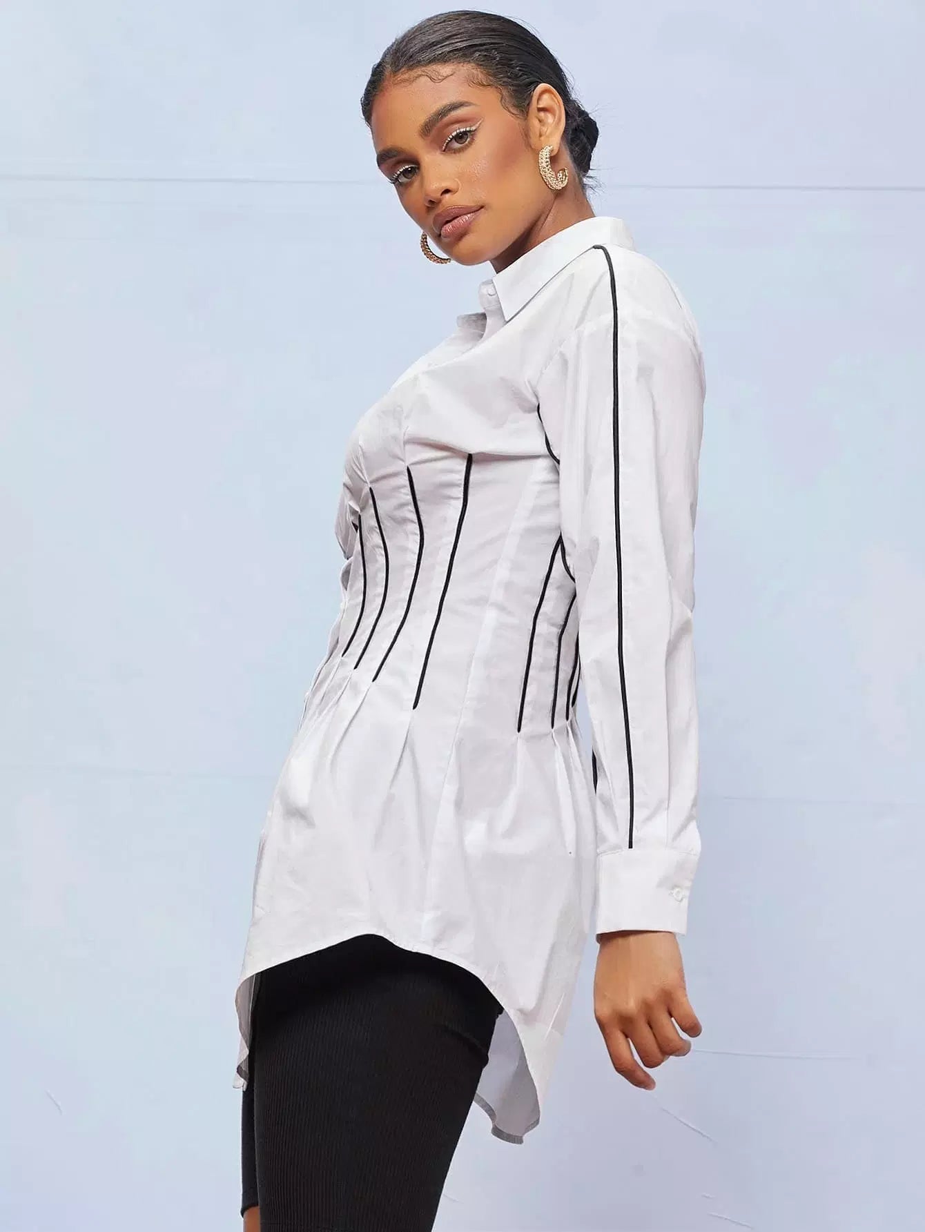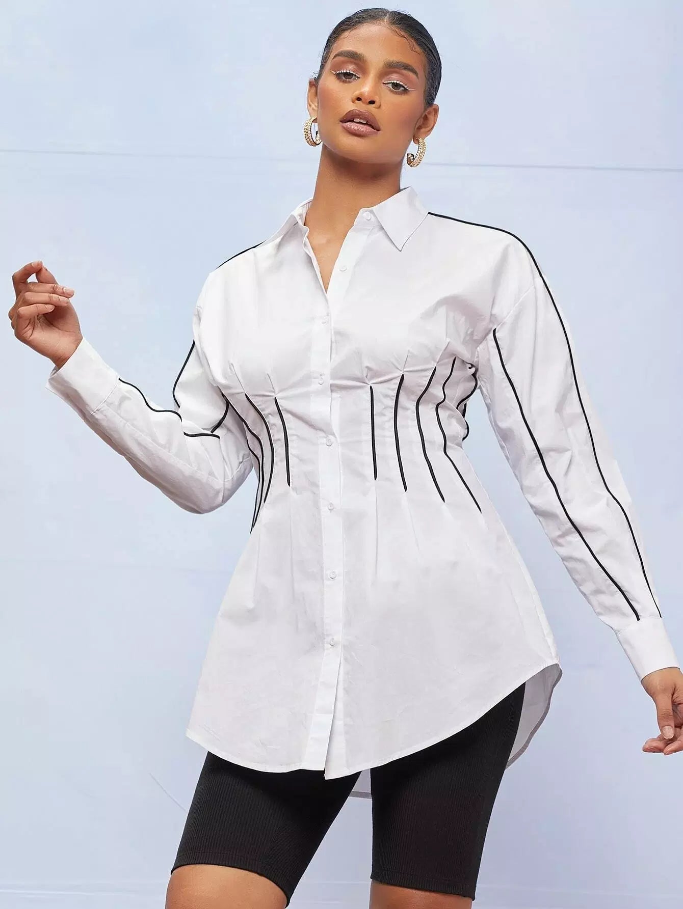 Contrast Piping Fold Pleated Waist Curved Hem Shirt