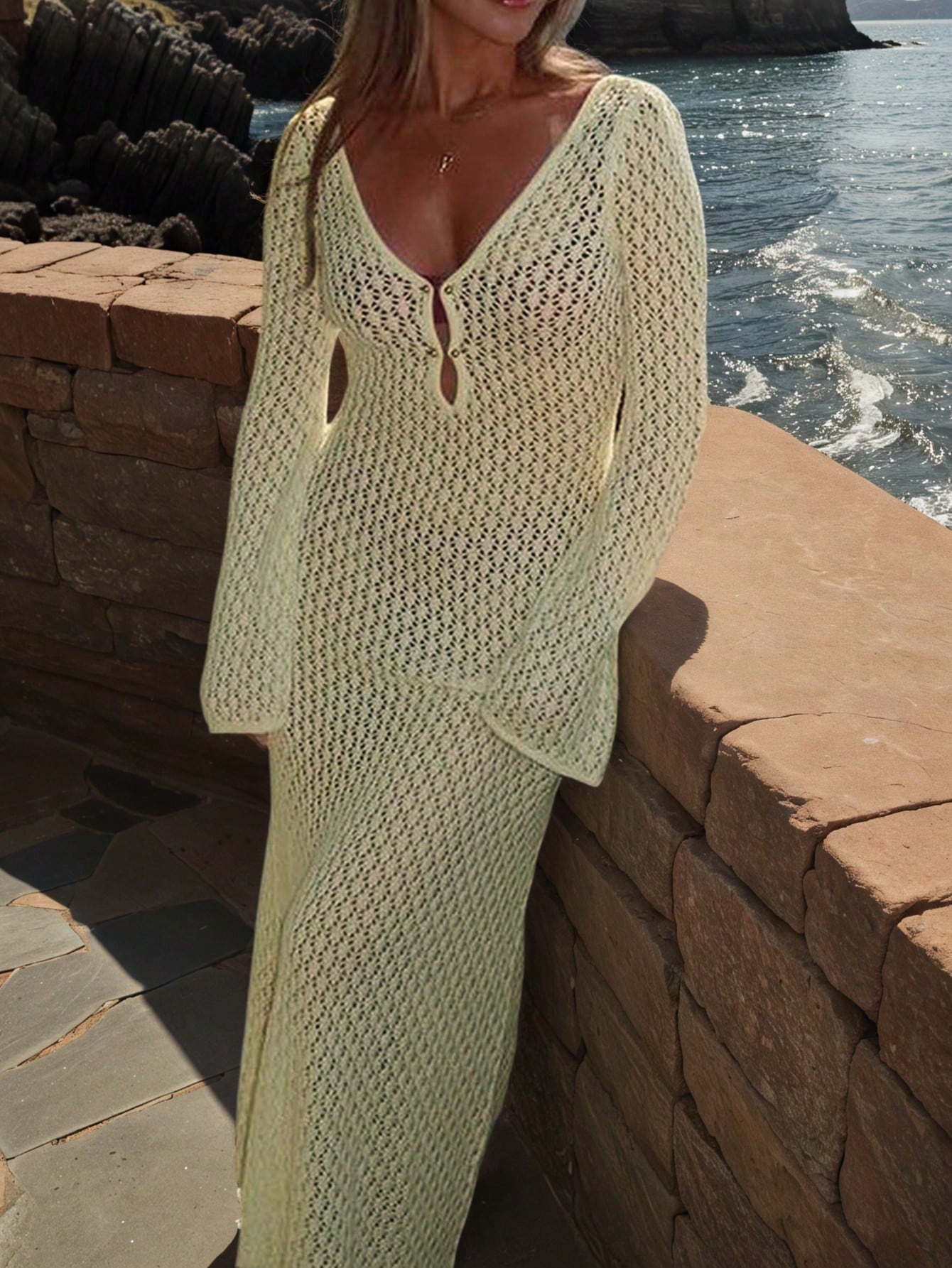 Crochet V-Neck Backless Ruched Waist Fitted Dress