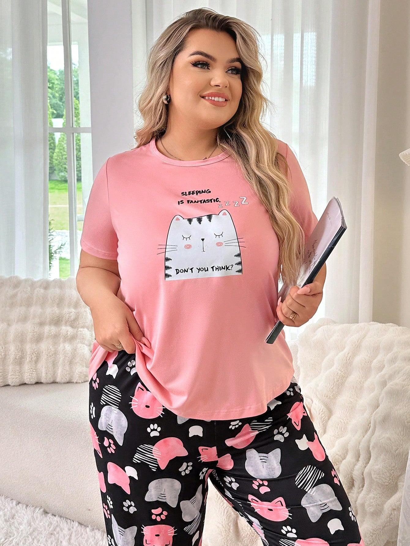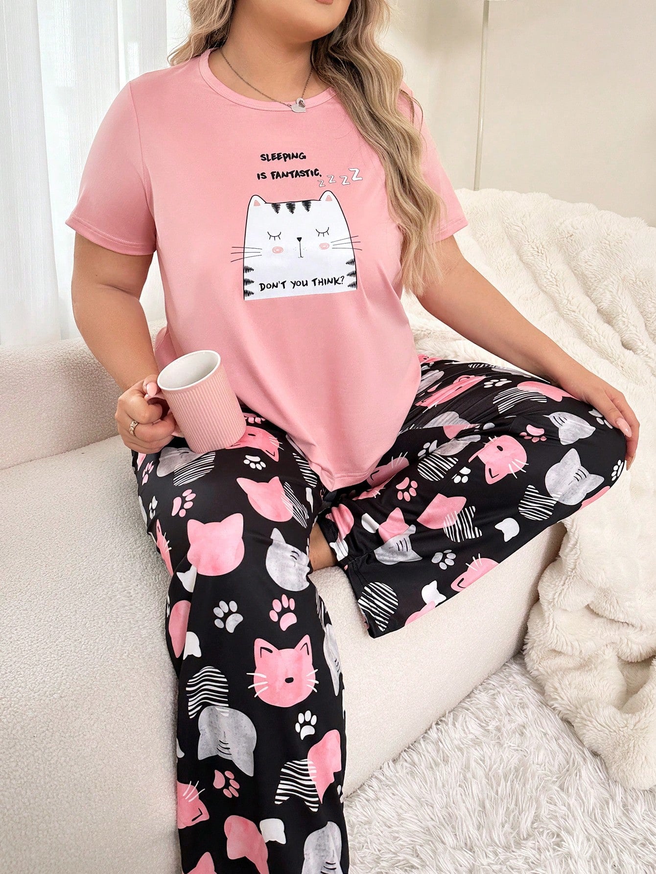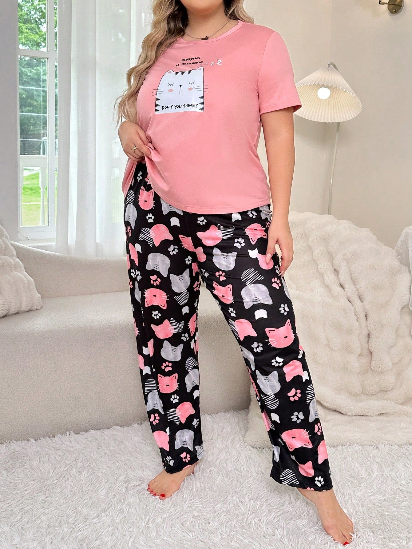 Cute Cat Printed Short Sleeve Long Pants Pajamas Set