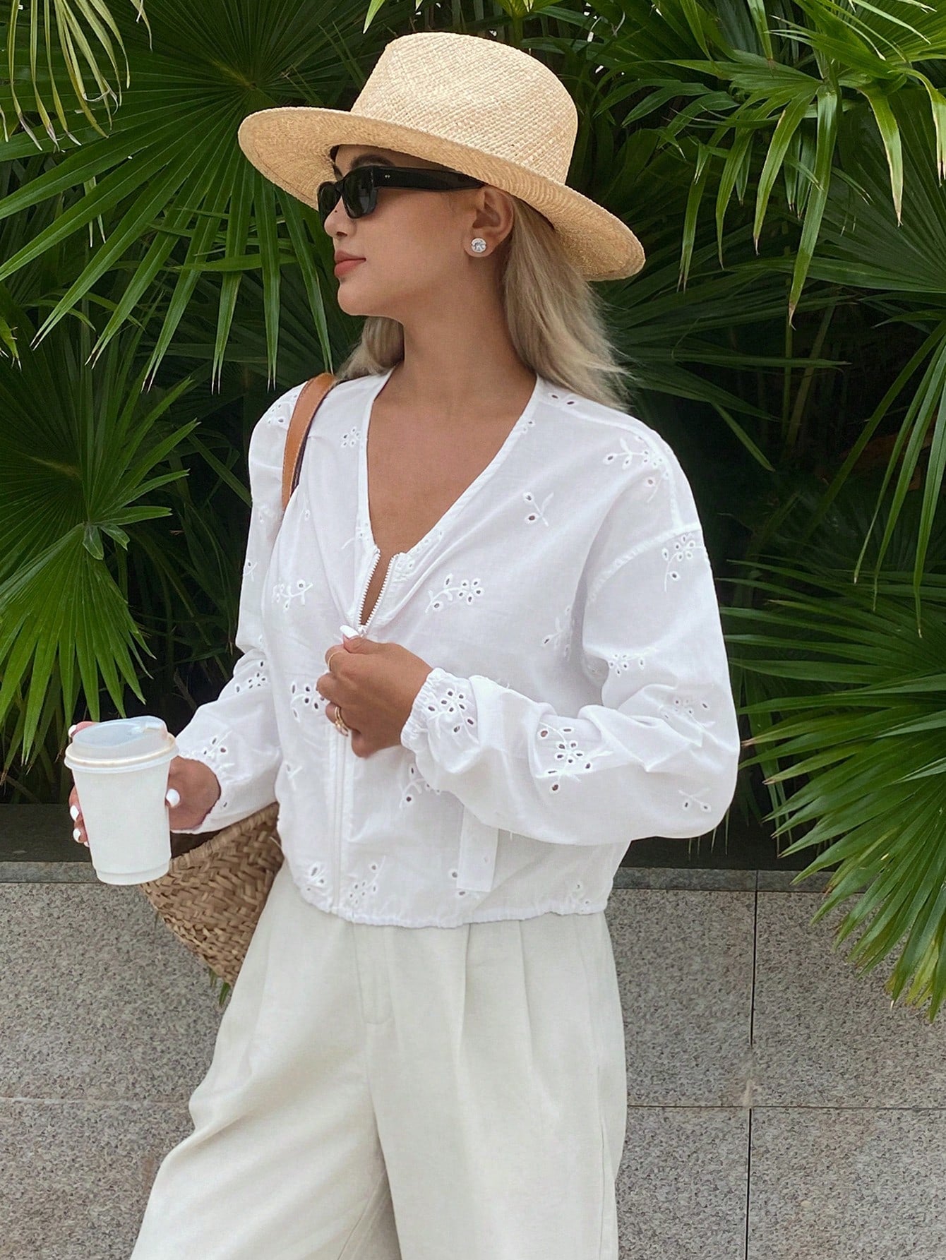 women DAZY Hollow Out Jacquard V-Neck Zip-Up Casual Vacation Lightweight Summer Jacket For Women