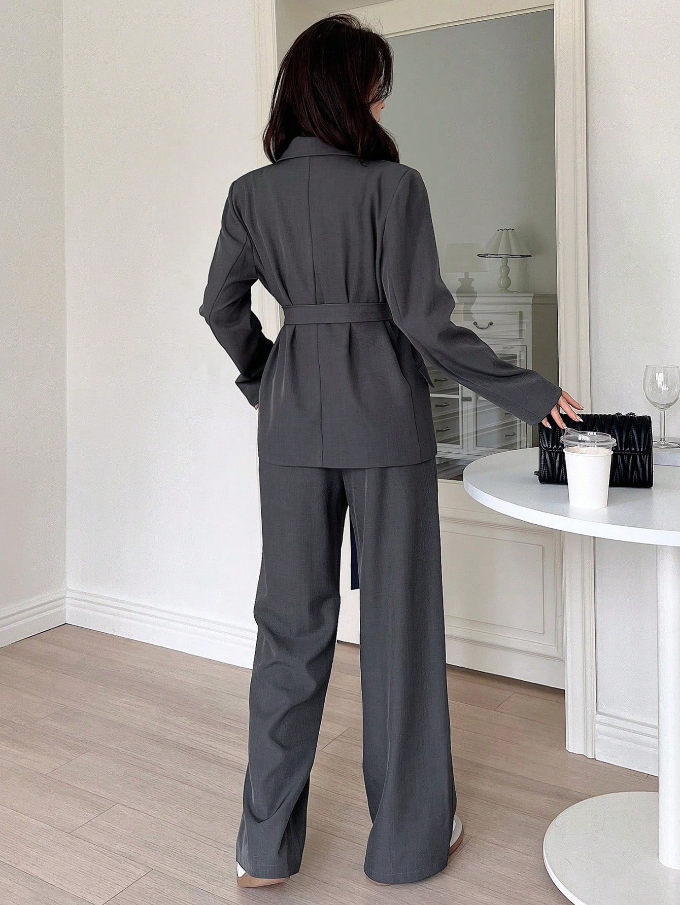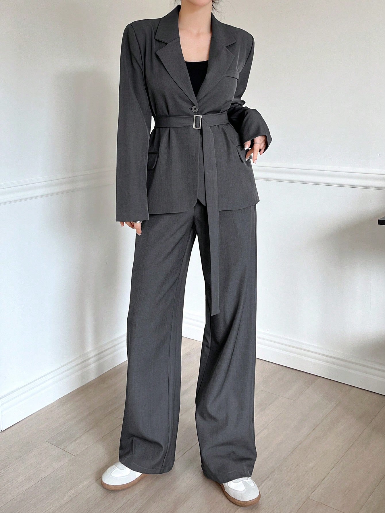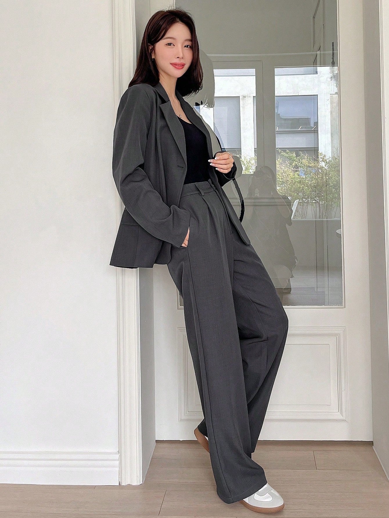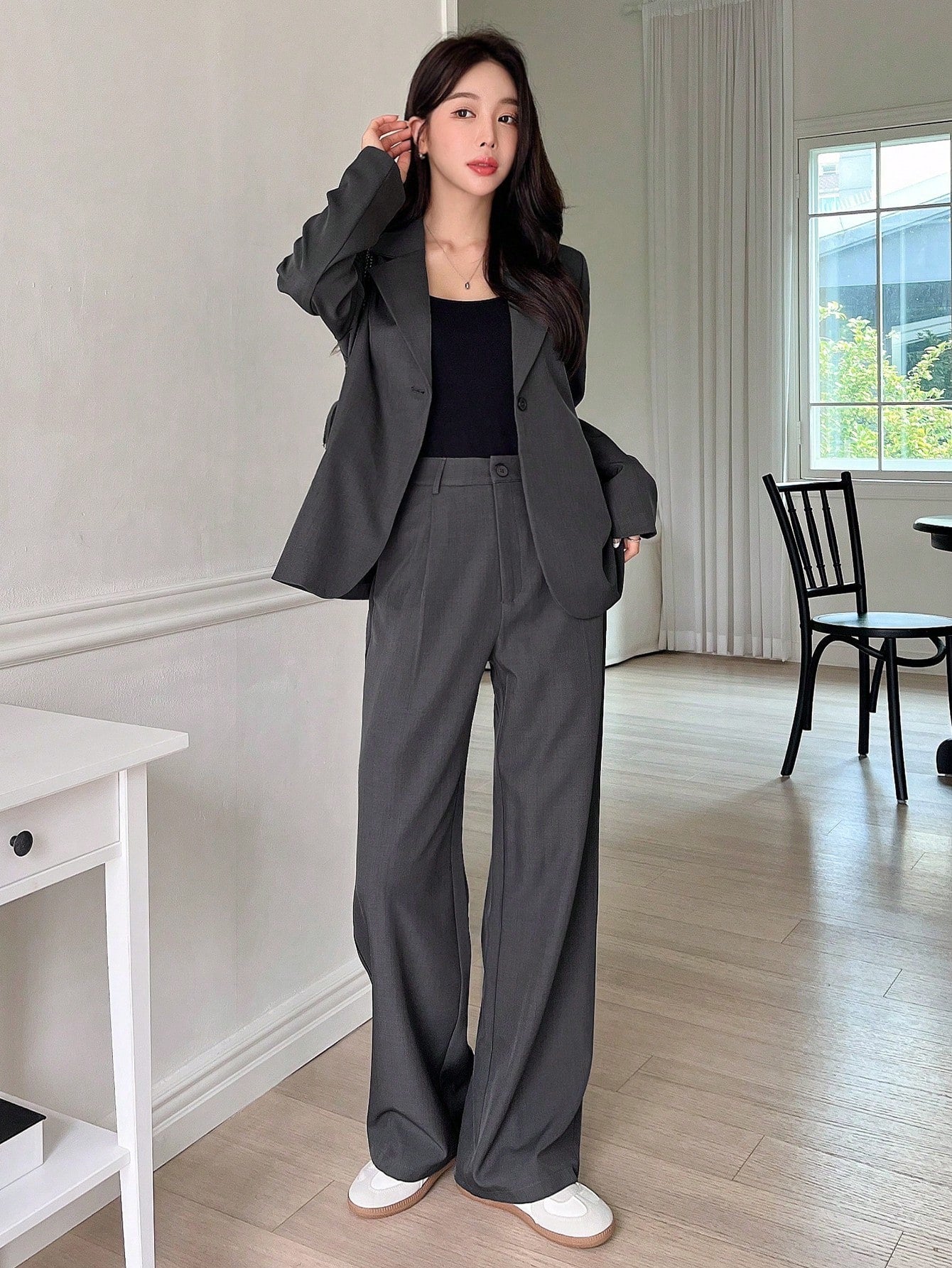 women DAZY Solid Color Loose Waistband Suit Jacket And Wide Leg Pants Women Suit Set